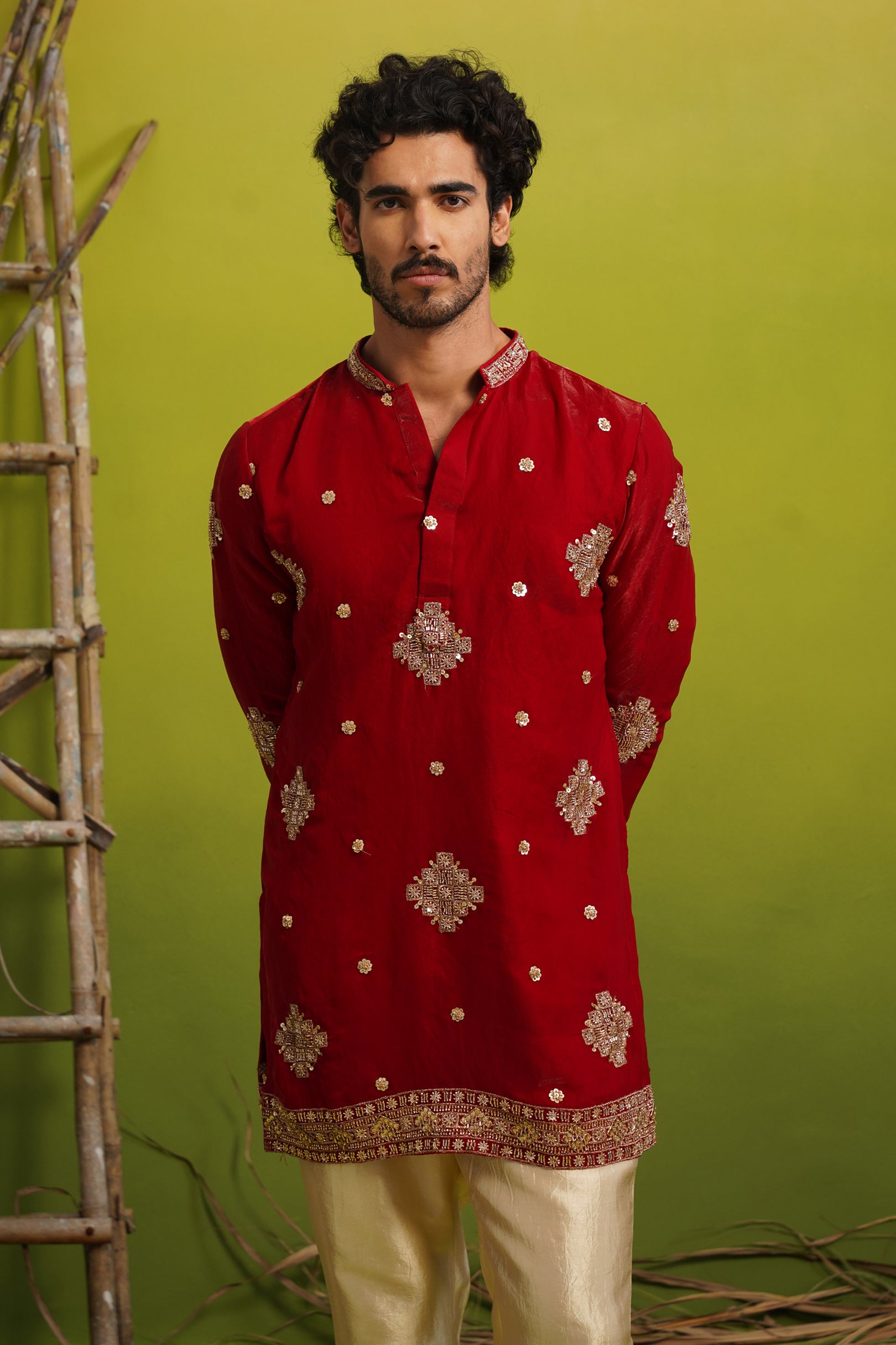 Crafted in rich pure tissue fabric, this short kurta set is a perfect blend of festive vibrance and refined elegance. The luminous fabric adds a subtle sheen, enhancing the depth of its warm tone. Adorned with intricate