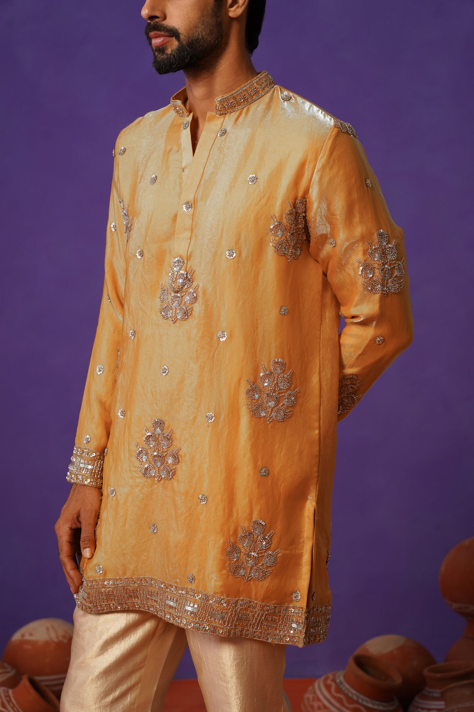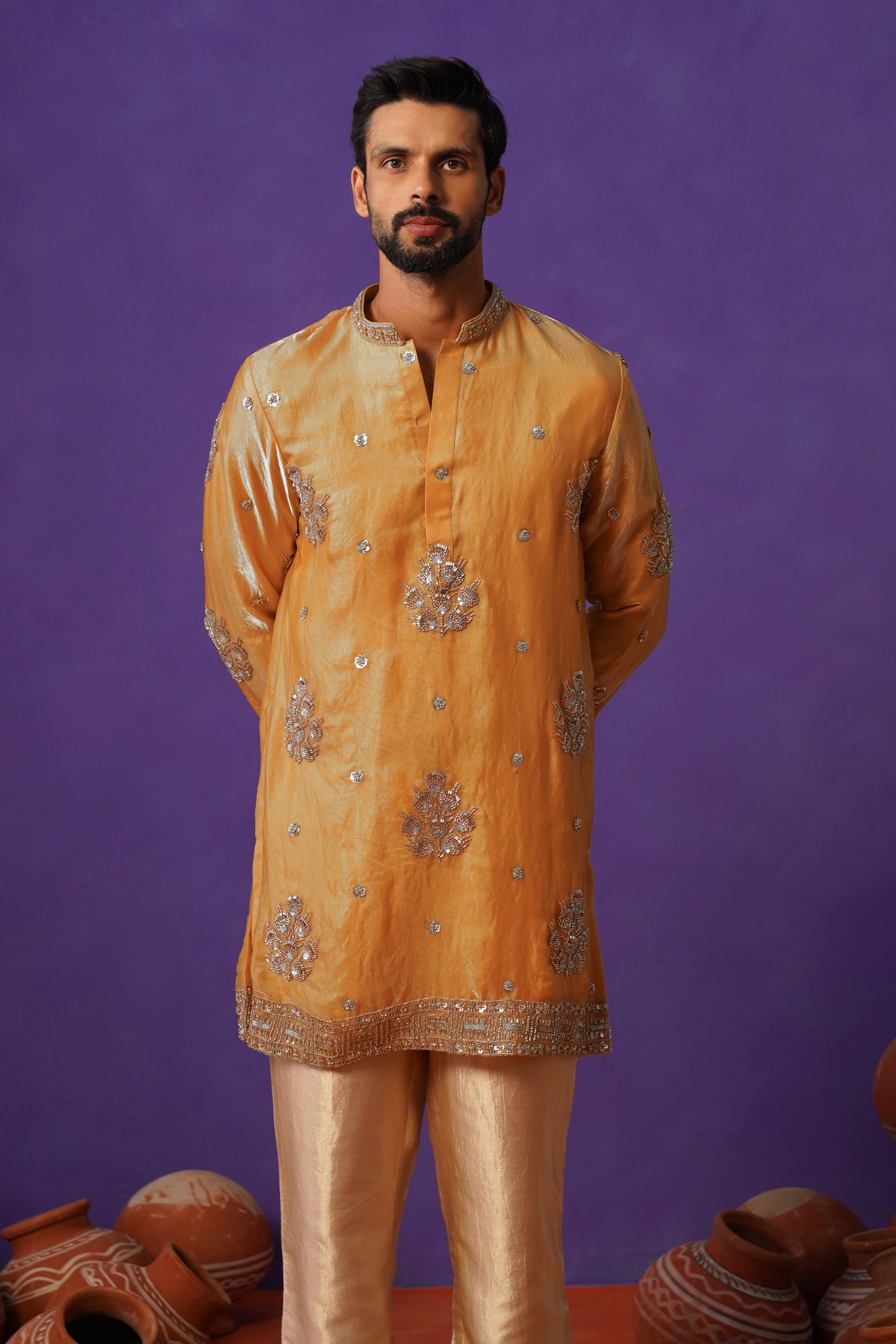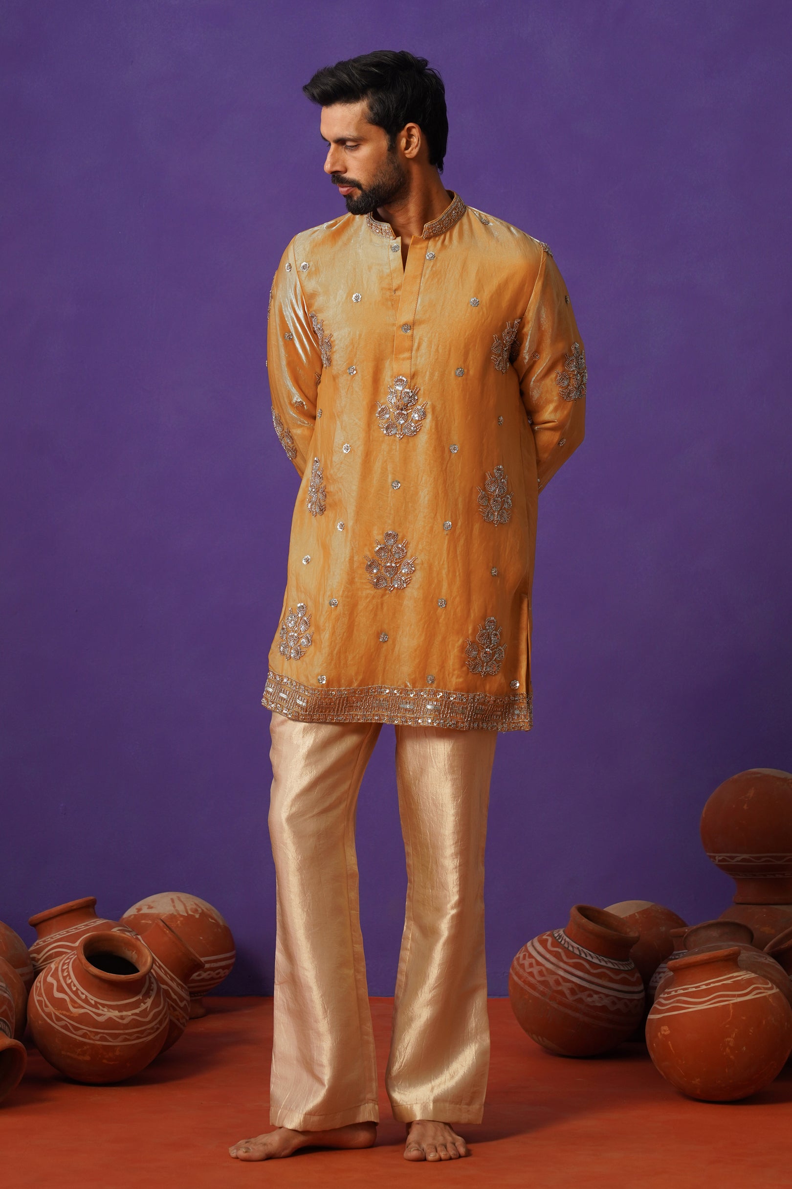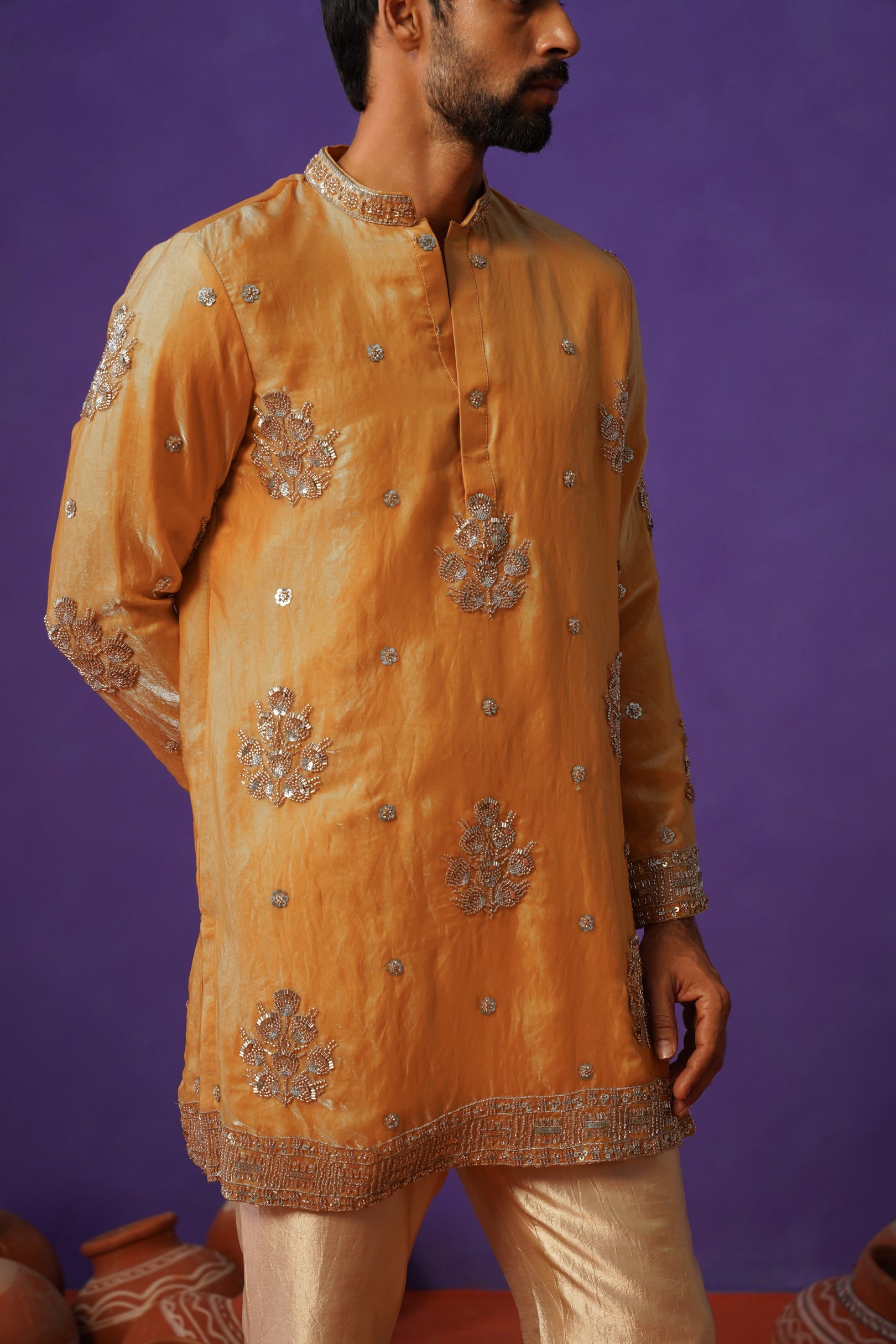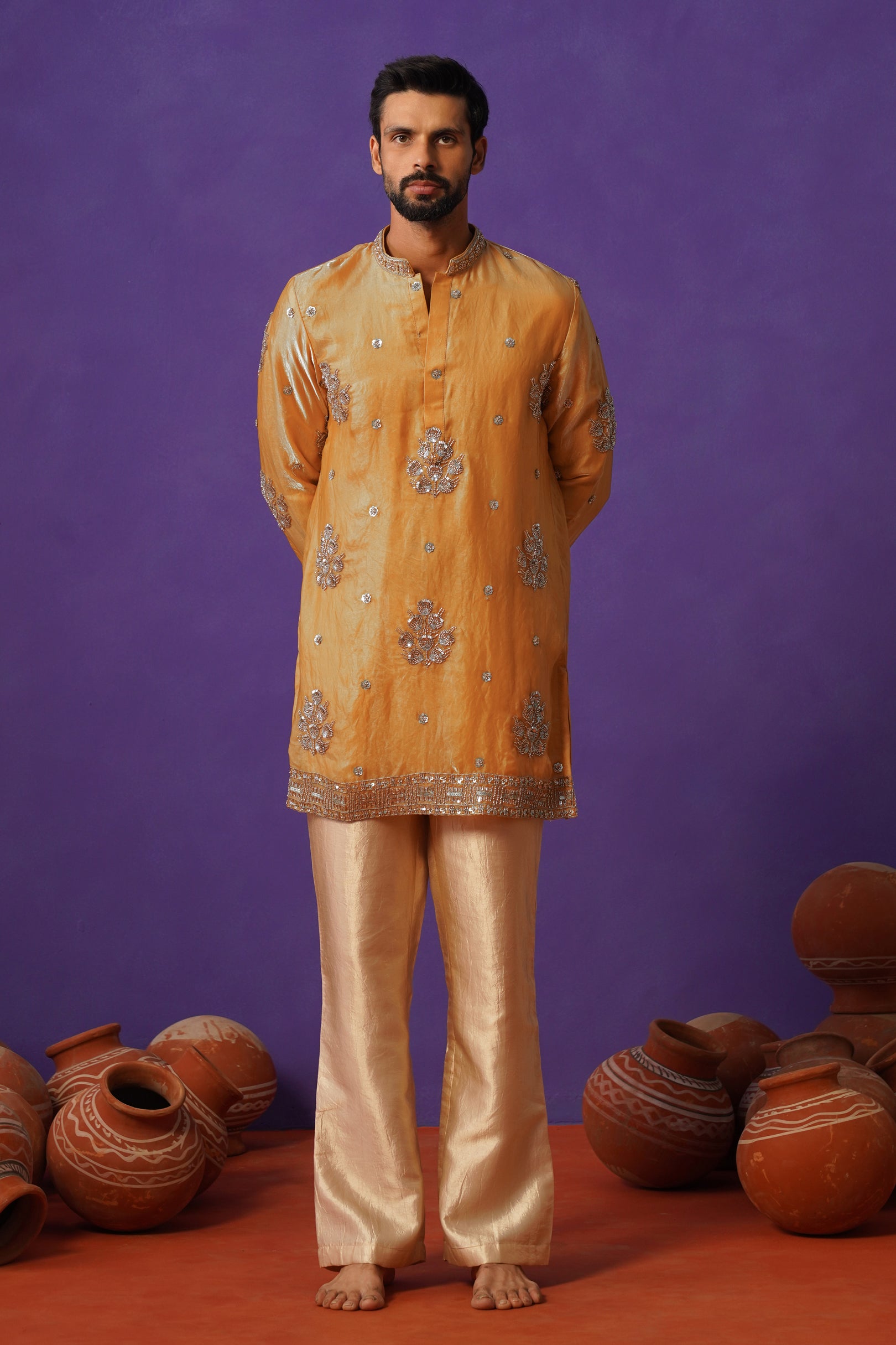 Crafted in rich pure tissue fabric, this haldi-coloured short kurta set is a radiant expression of festive elegance. Paired with classic pants, the ensemble offers a sharp yet graceful silhouette. The kurta is adorned with intricate cutdana work, delicately placed across the surface to create a refined shimmer that catches the light beautifully. Detailed borders on the hem, sleeves, and collar enhance its luxurious appeal, while the luminous haldi tone adds warmth and vibrance. Perfect for haldi ceremonies and celebrations, this piece blends bold colour, intricate craftsmanship, and timeless sophistication effortlessly.