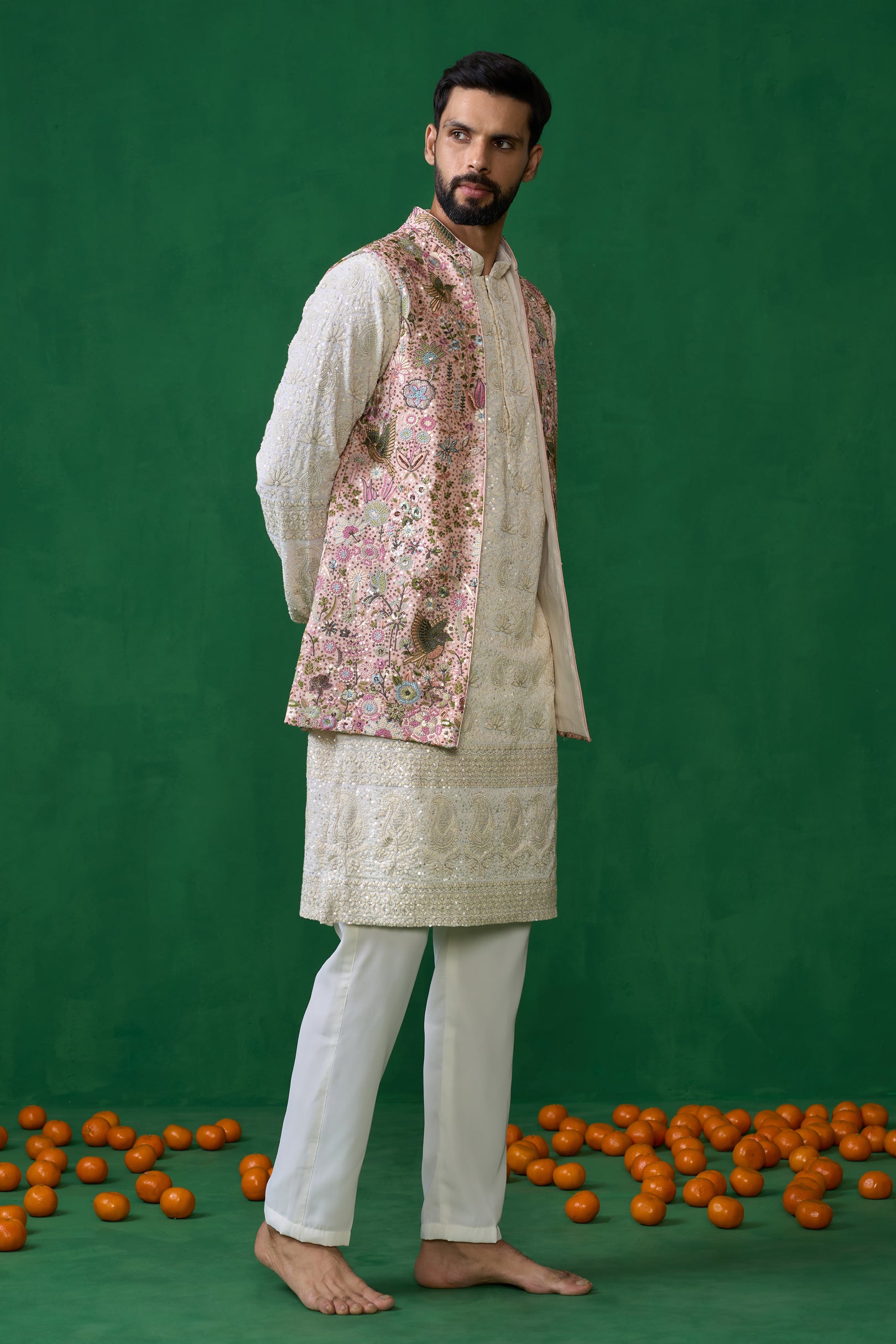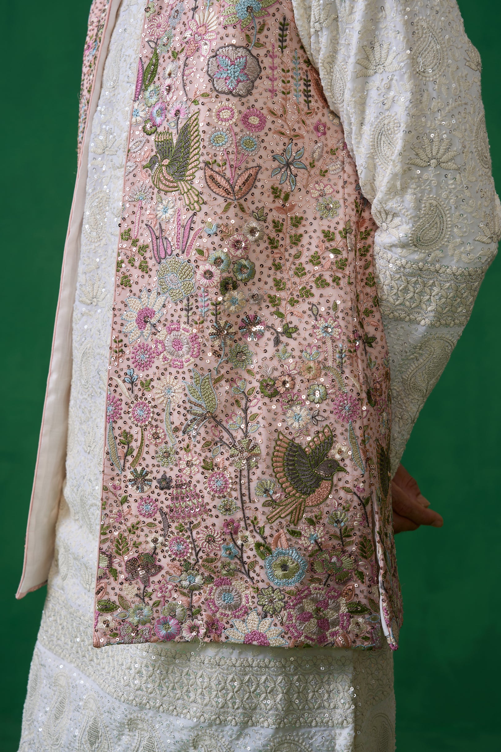 The outfit consists of a long kurta with an embroidered repeating pattern. The kurta is paired with trousers, which are wide at the top and gathered at the ankles, creating a pleated, draped effect. Over the kurta, a short, sleeveless jacket is worn, adorned with floral embroidery.