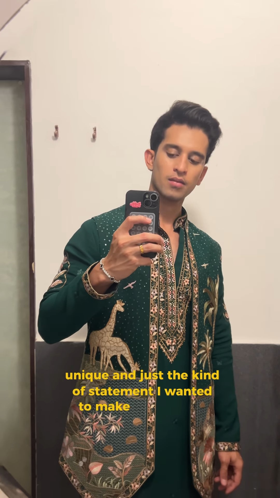 This ensemble consists of a straight kurta worn with slim trousers, layered with an intricately embroidered jacket. The jacket features detailed embroidery along the neckline, front panels, sleeves, and hem, showcasing nature-inspired motifs such as animals and trees. The kurta underneath is kept simpler, allowing the richly adorned jacket to be the highlight of the look. Perfect for weddings, festive gatherings, and cultural occasions, this outfit blends traditional tailoring with artistic embroidery for a refined statement.