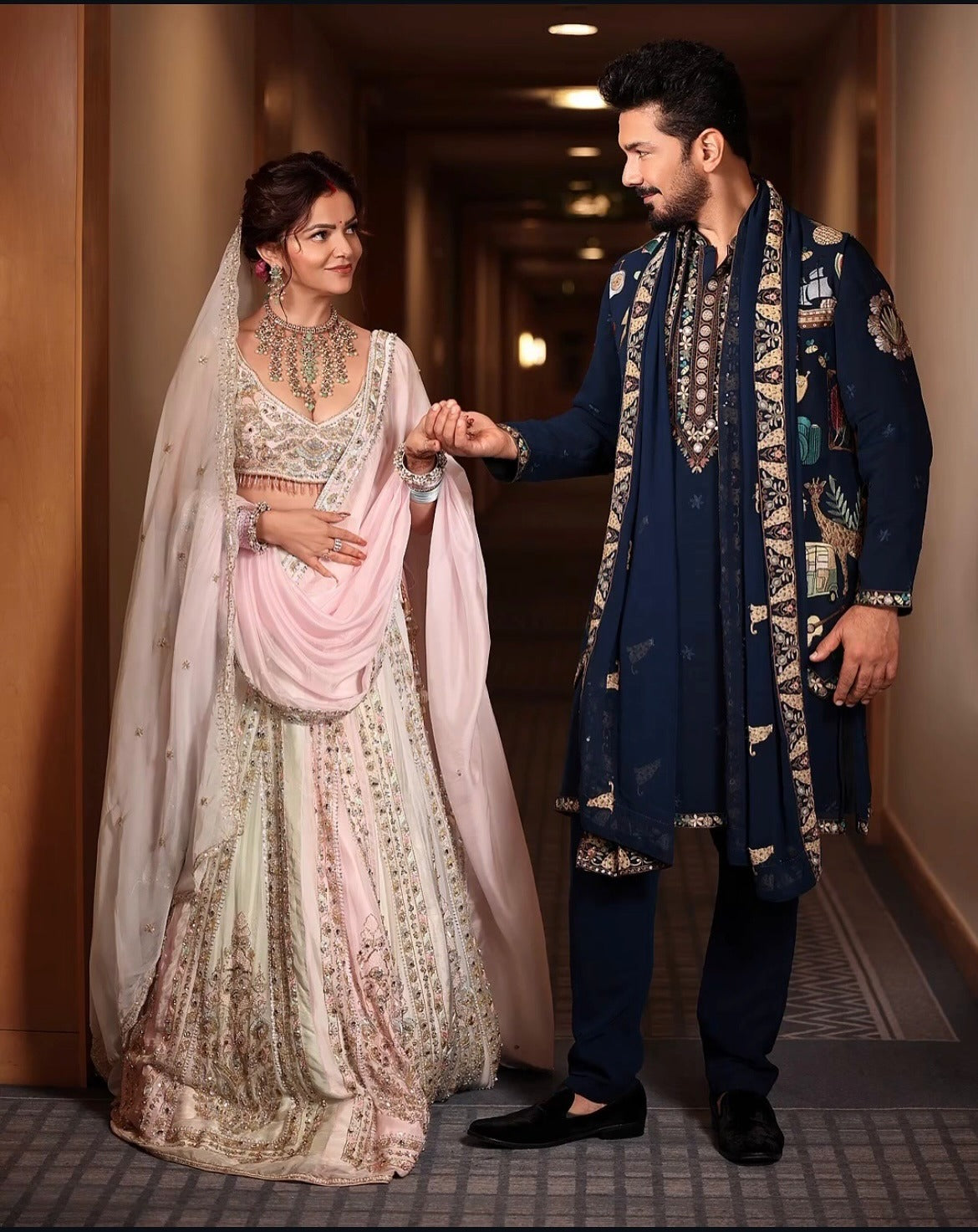 This outfit is a striking traditional ensemble in an elegant navy blue hue, featuring a beautifully embroidered kurta jacket that blends cultural artistry with contemporary charm. The intricate embroidery is a vibrant mix of motifs, including leopards, architectural elements, musical instruments, and everyday objects, creating a storytelling effect on the fabric. The detailed borders add a refined touch, enhancing the regal appeal of the ensemble. Paired with a matching ivory kurta and tailored trousers, the look is both sophisticated and artistic. The combination of heritage craftsmanship and modern whimsy makes this outfit perfect for special occasions, embodying a unique blend of tradition and creativity.