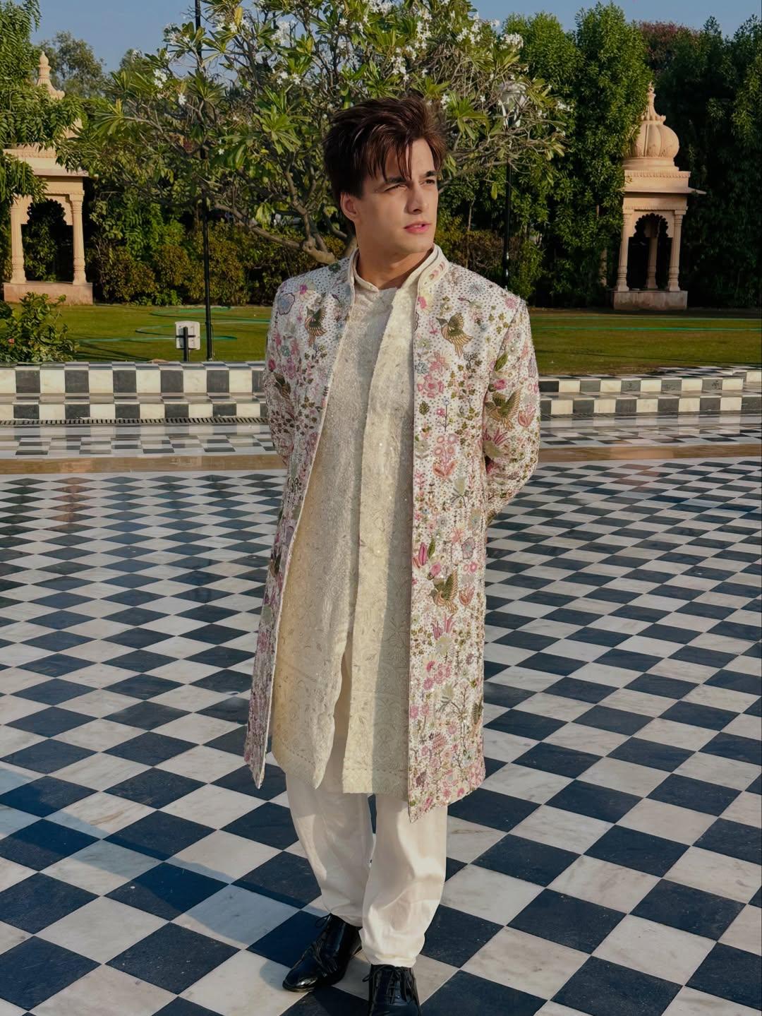 An elegant Indo-Western ensemble where detailed embroidery brings floral and nature-inspired motifs to life. The long sherwani, layered over an embroidered kurta, flows into straight trousers, creating a harmonious balance of regality and contemporary charm. Every stitch reflects artistry, making this outfit a refined choice for grand celebrations.