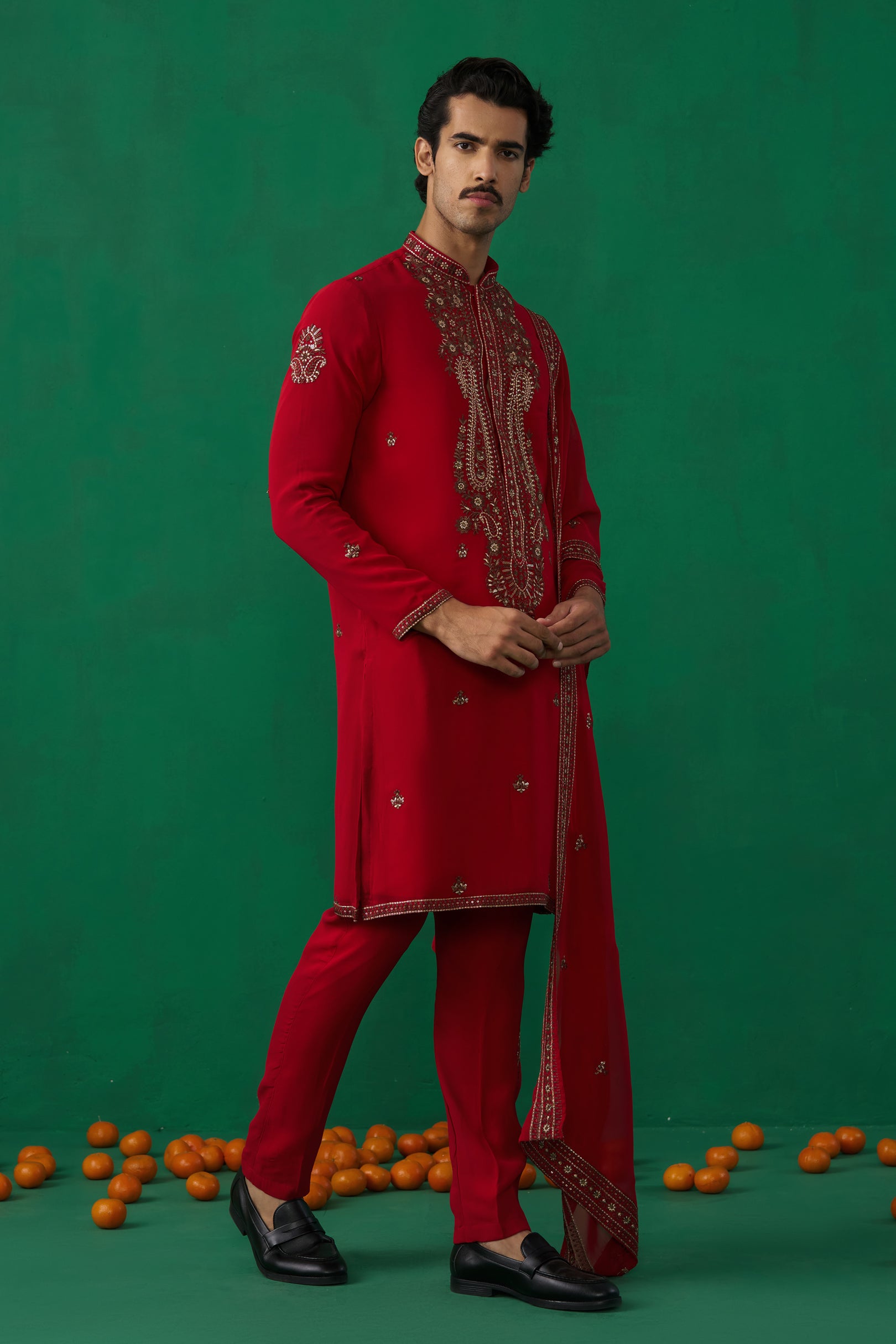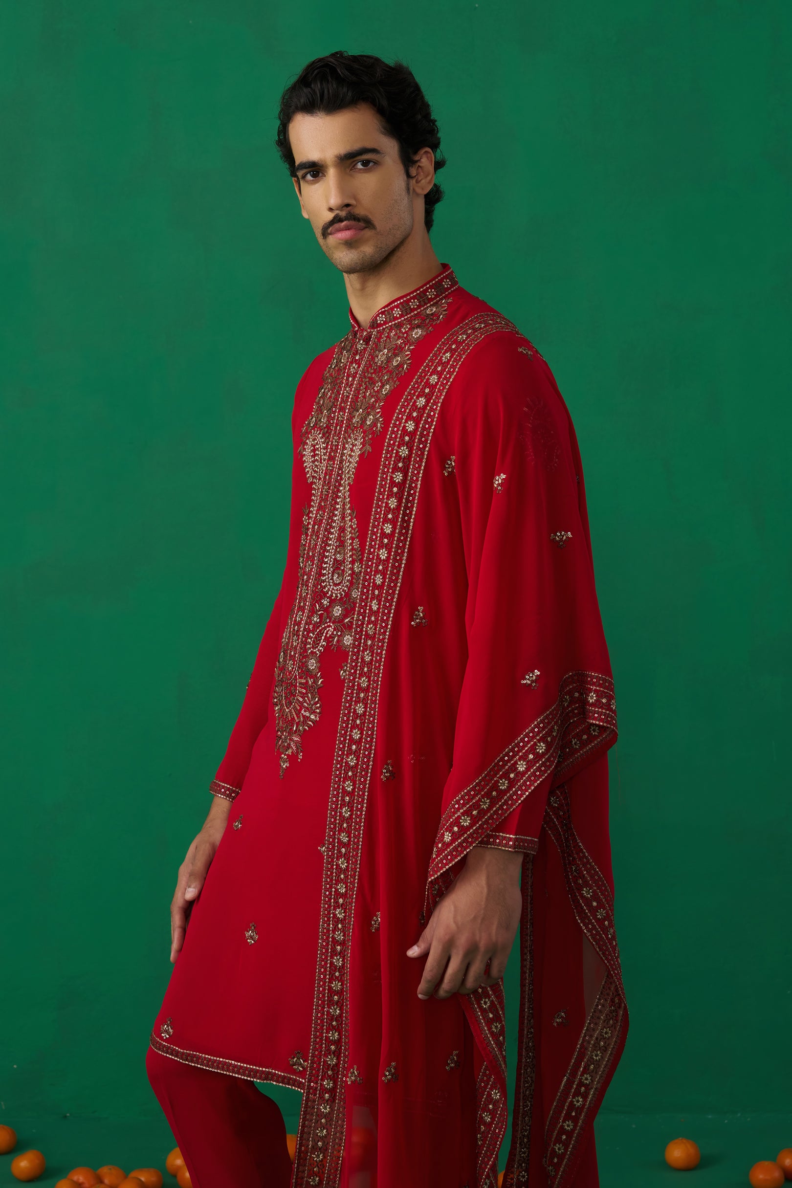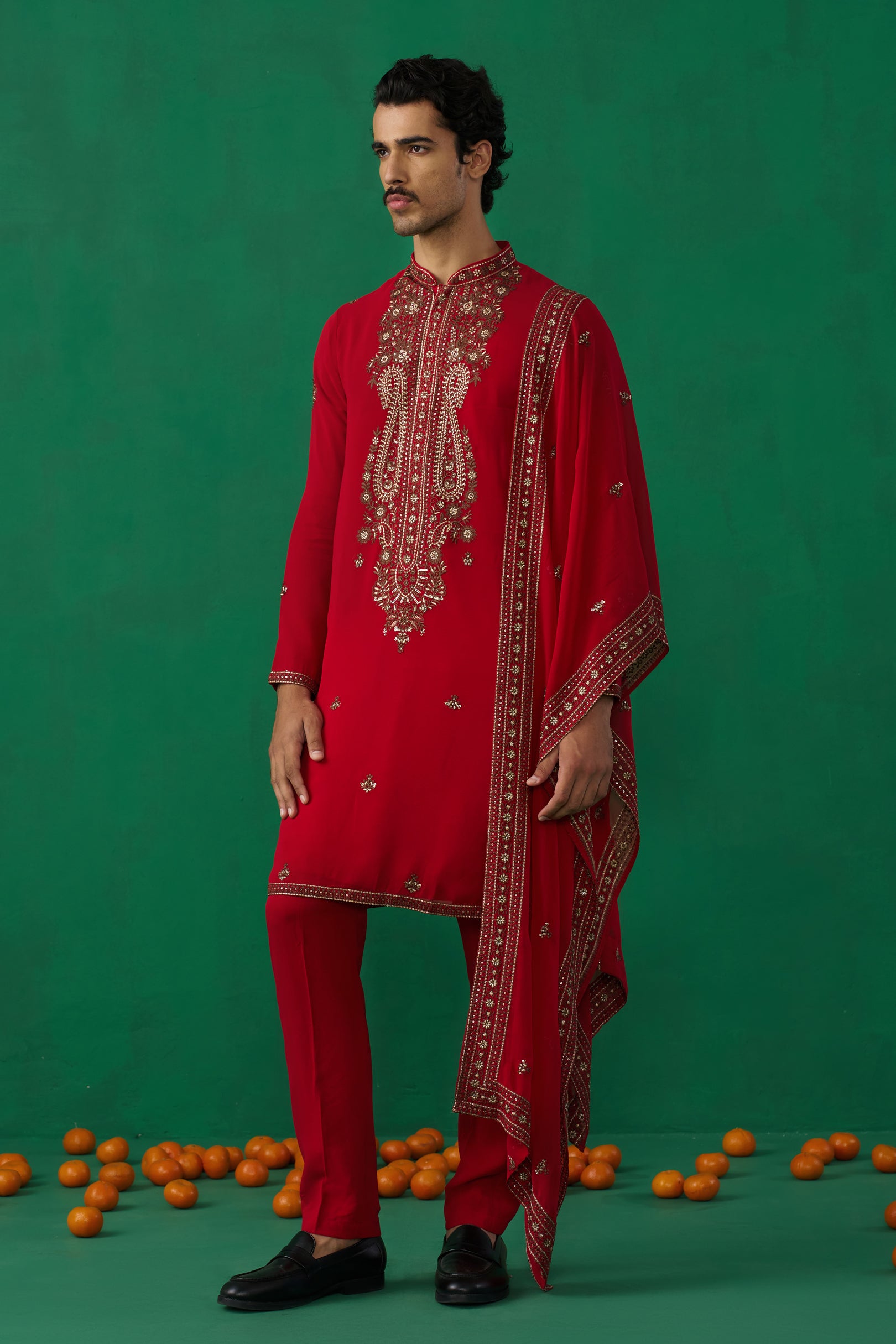 This kurta set features a long-sleeved kurta with a prominent, elaborate embroidery on the front placket and neckline, crafted in an Arabic style. The detailed pattern extends vertically down the center of the garment. The sleeves are also adorned with small embroidered motifs. The set includes a pair of straight-cut trousers and a long dupatta with an embroidered border that mirrors the Arabic-style pattern of the kurta.