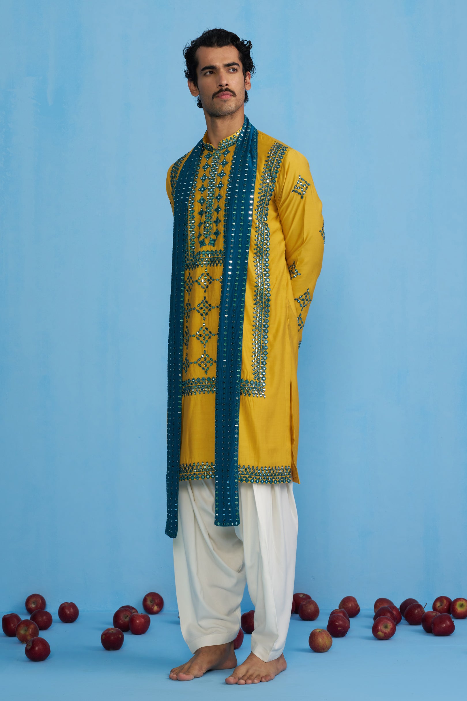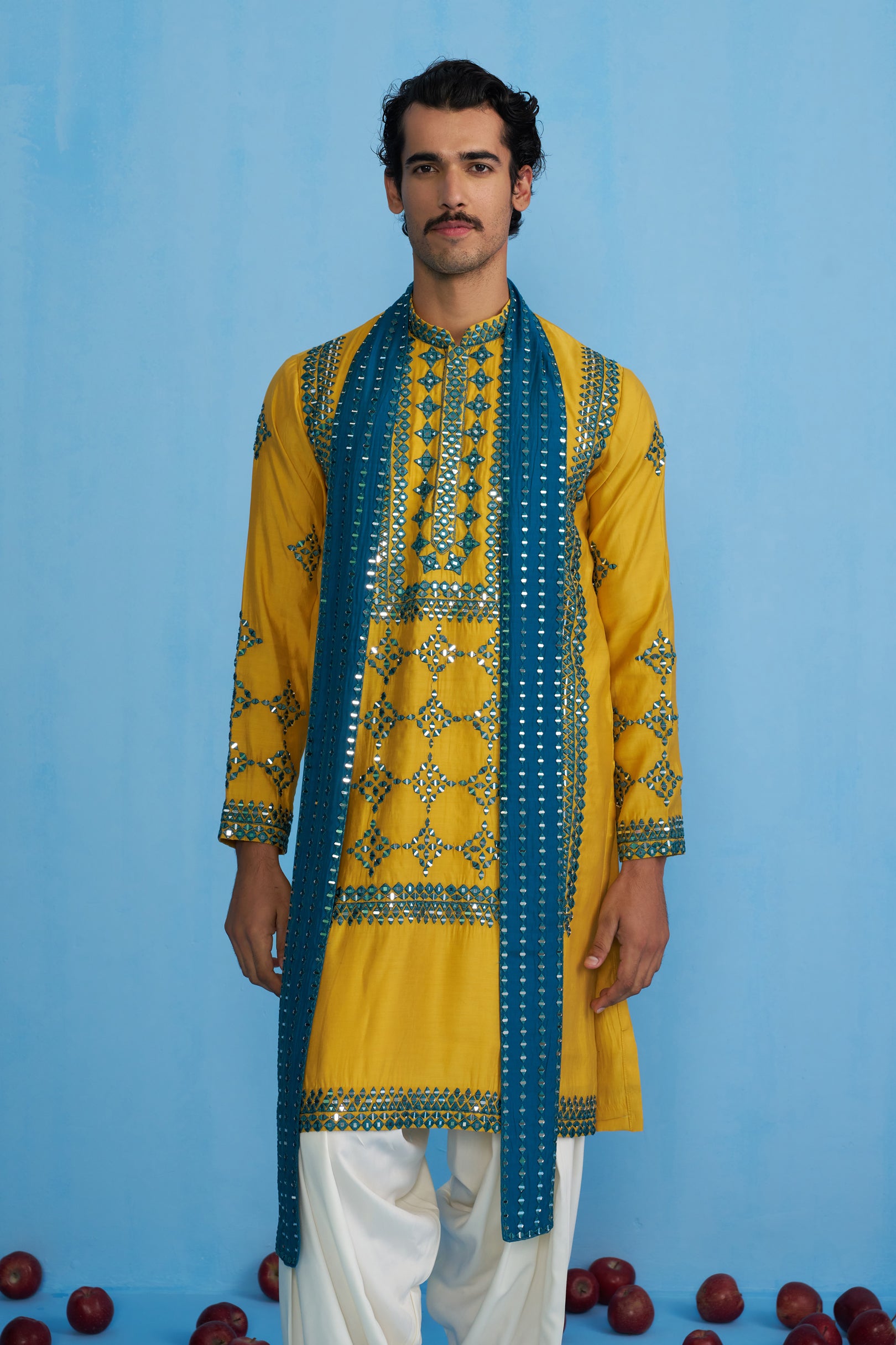 This striking ensemble is perfect for festive and wedding wear. It features a long-sleeved kurta with a prominent, geometric-style embroidery and intricate mirror work detailing on the front and sleeves. Paired with the traditional drape of Patiyala trousers, the outfit is completed with a slim stole. The stole itself is a statement piece, densely adorned with a parallel arrangement of mirror work, creating a linear, modern accent that stands out against the rich texture of the kurta.