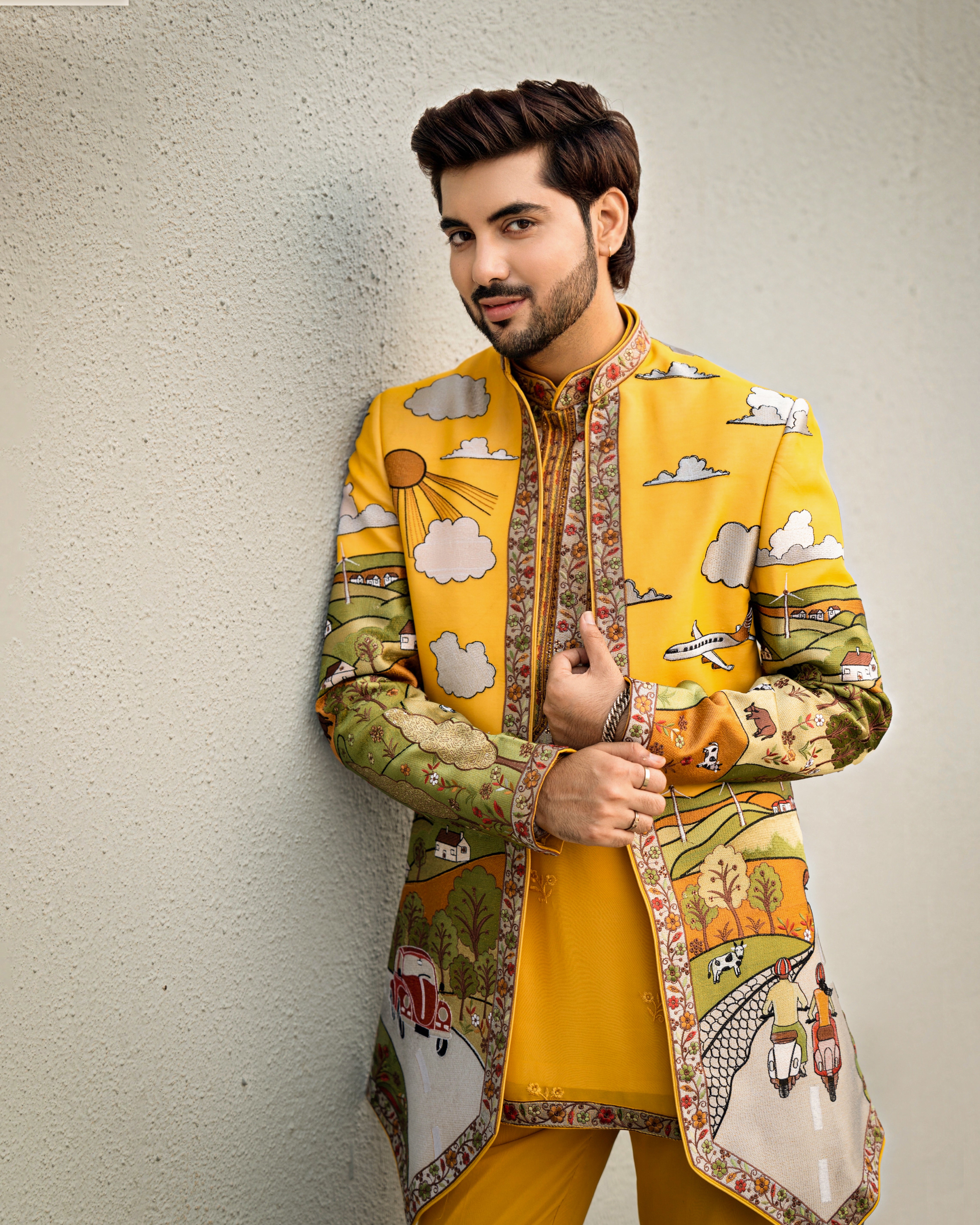 This Jodhpuri suit is designed as a vibrant statement piece, featuring scenic and narrative embroidery that illustrates landscapes, clouds, trees, and artistic figures. The detailed motifs transform the jacket into a storytelling canvas, while its structured cut maintains the classic Jodhpuri elegance. Paired with a matching Shirt and straight trousers, the ensemble blends traditional artistry with contemporary flair, making it ideal for festive and statement occasions.