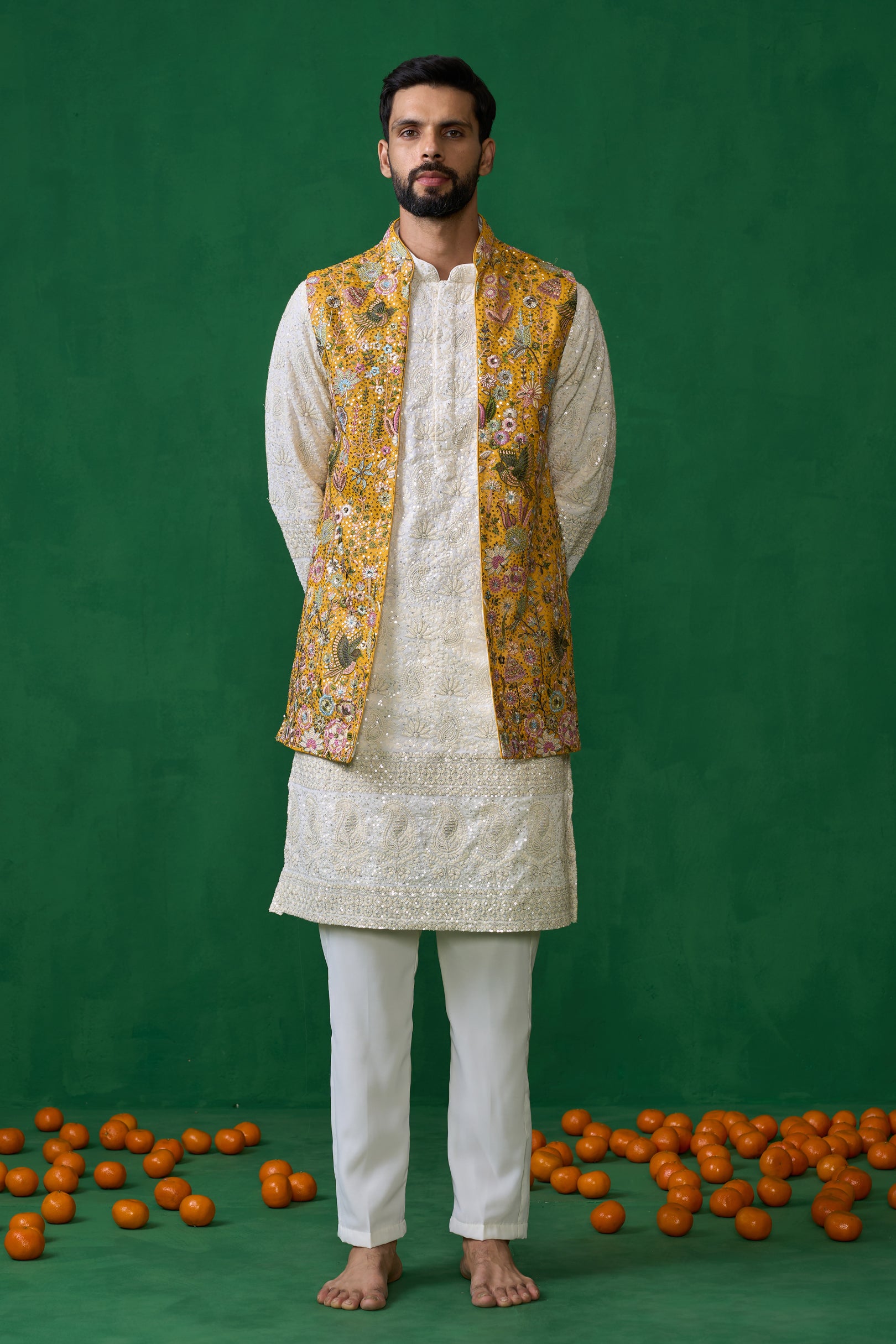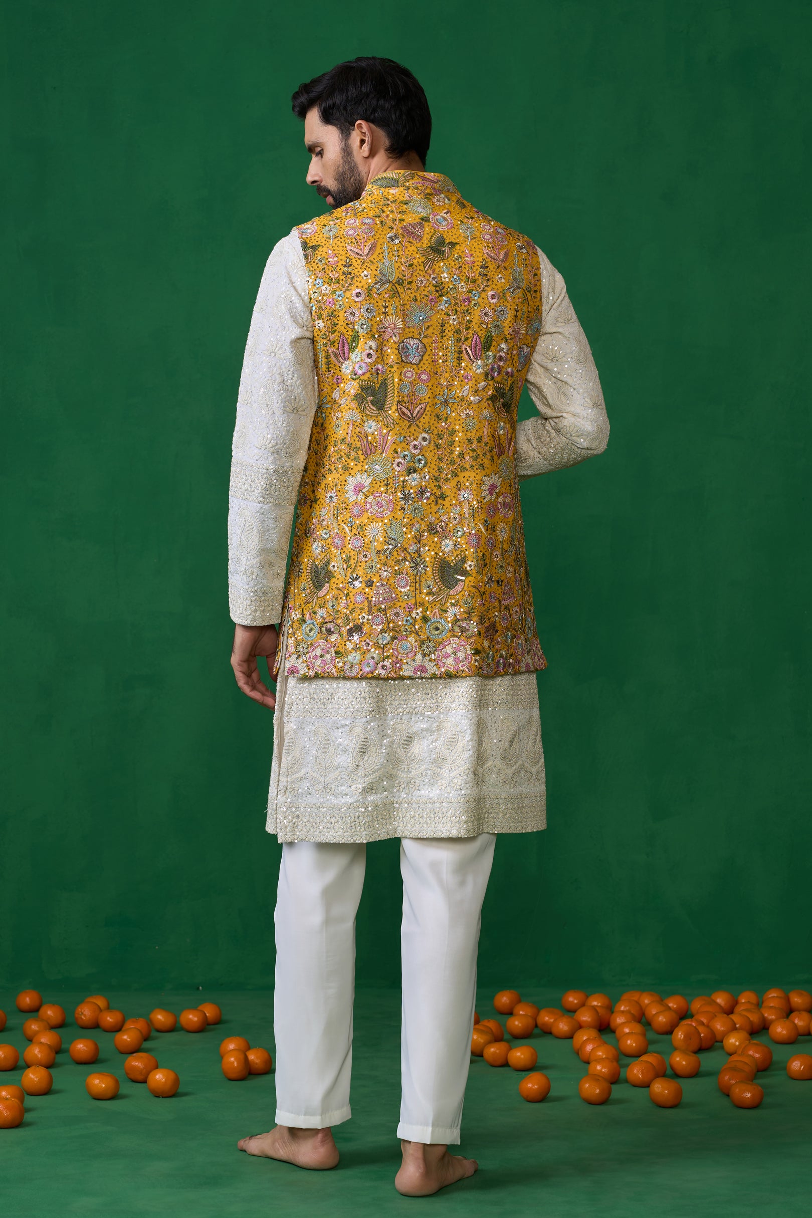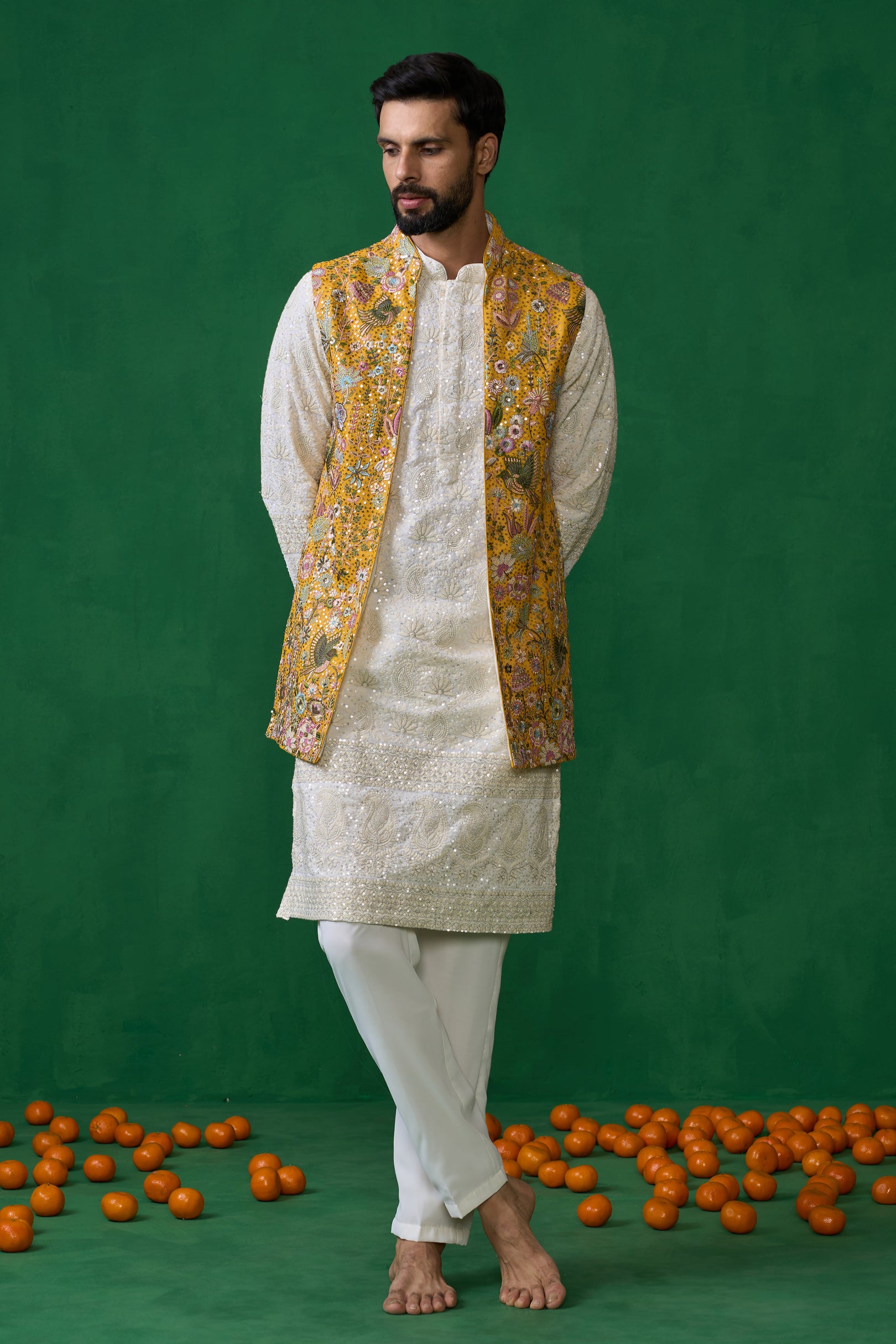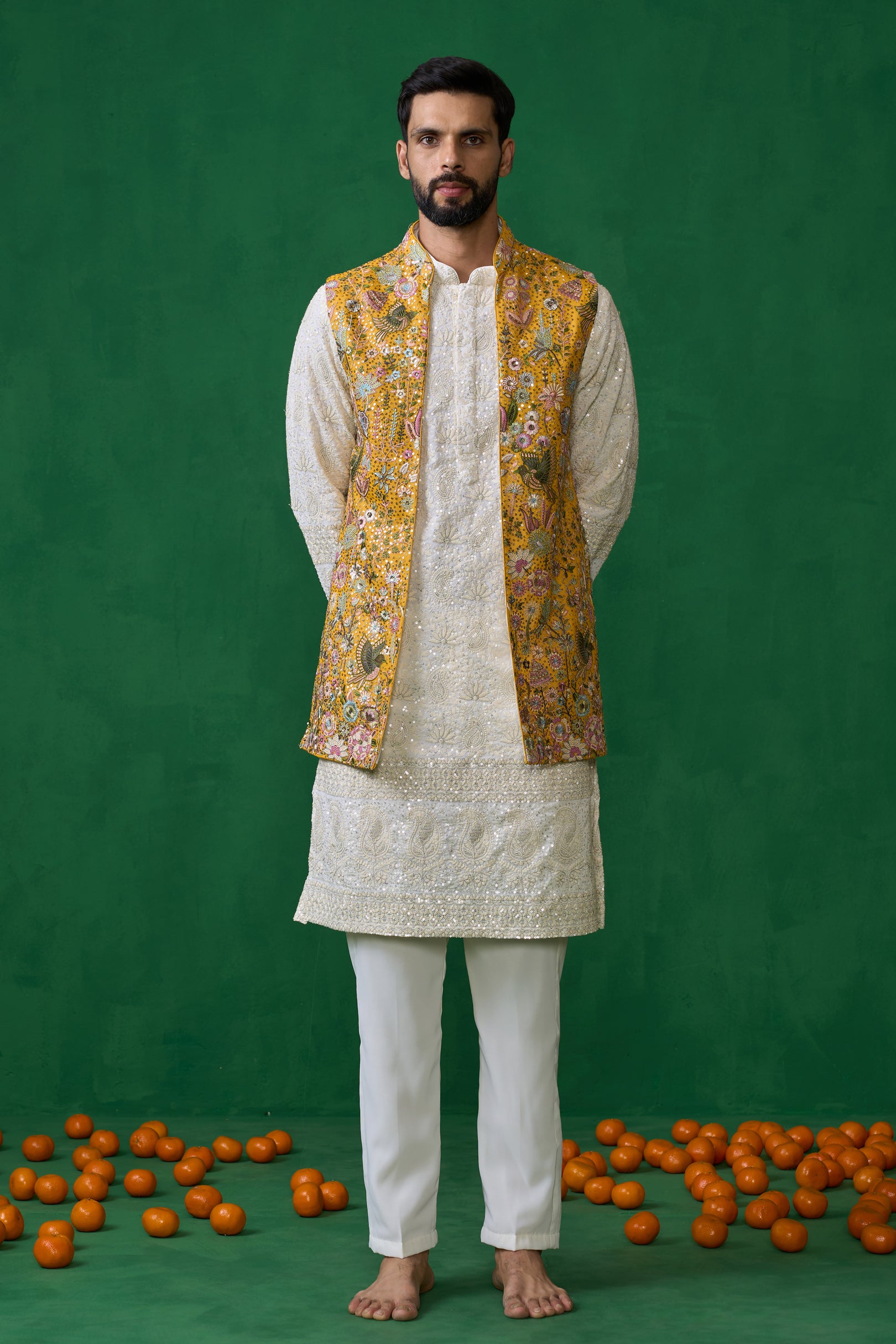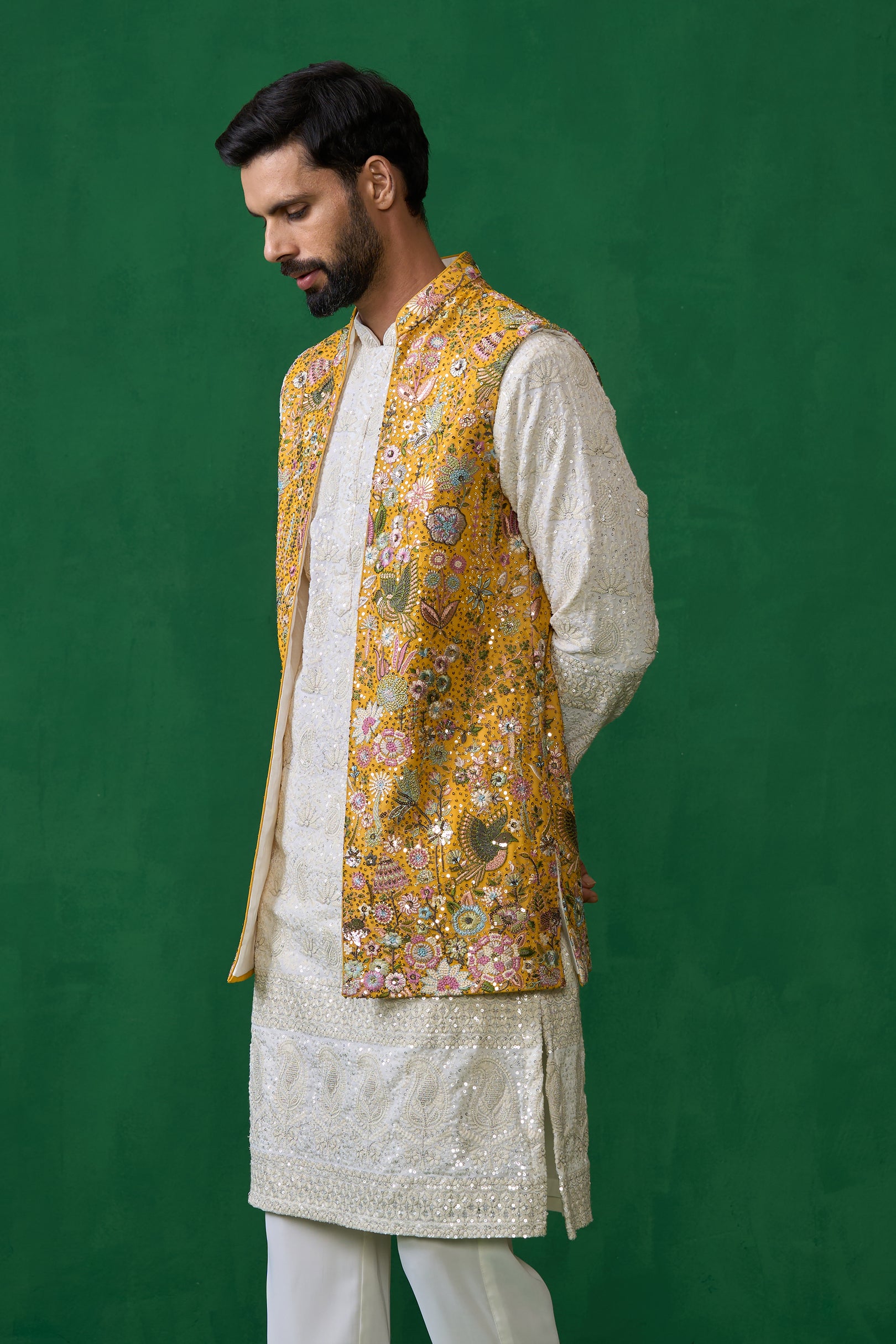 The outfit consists of a long kurta with an embroidered repeating pattern. The kurta is paired with trousers, which are wide at the top and gathered at the ankles, creating a pleated, draped effect. Over the kurta, a short, sleeveless jacket is worn, adorned with floral embroidery.