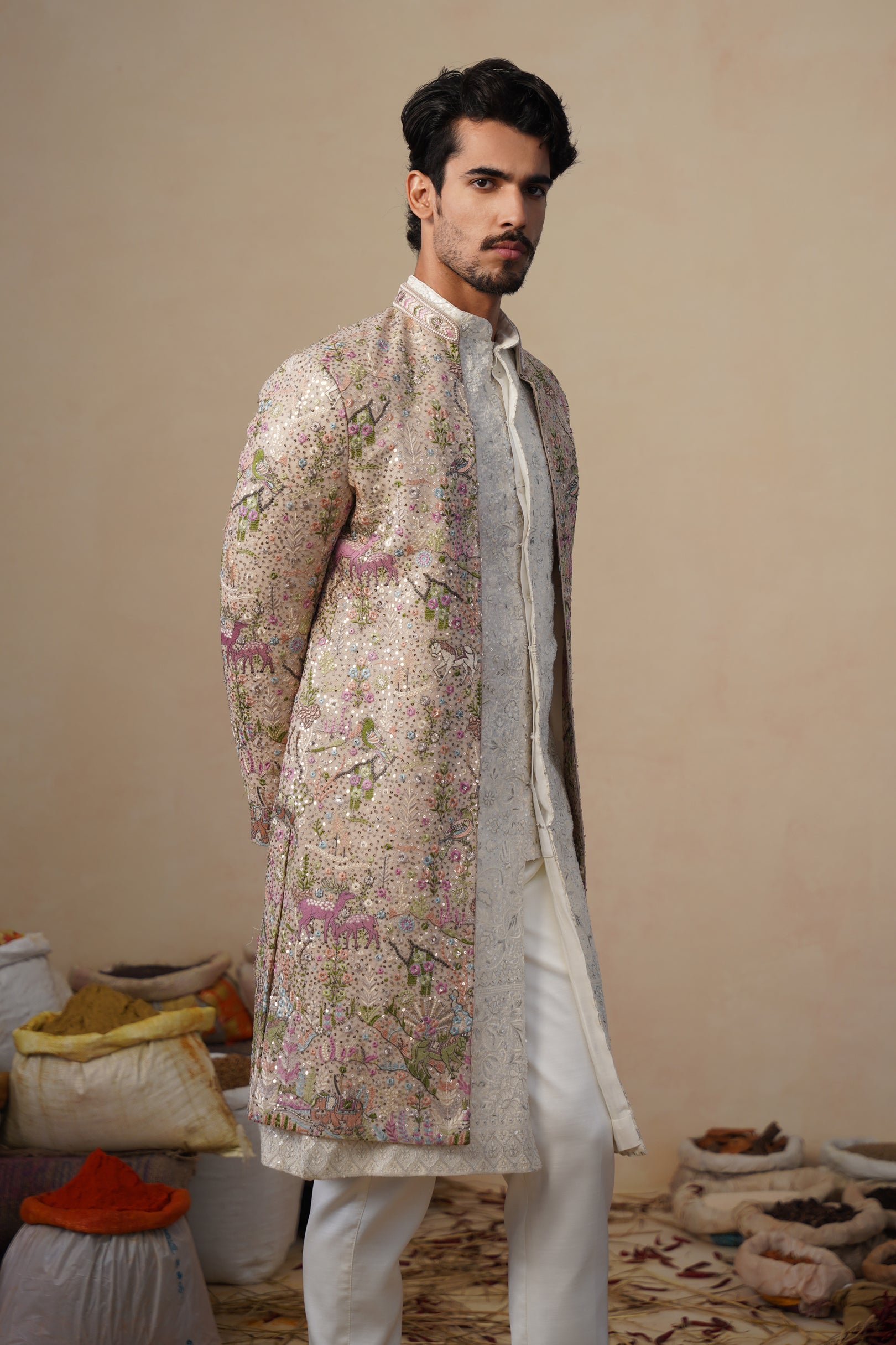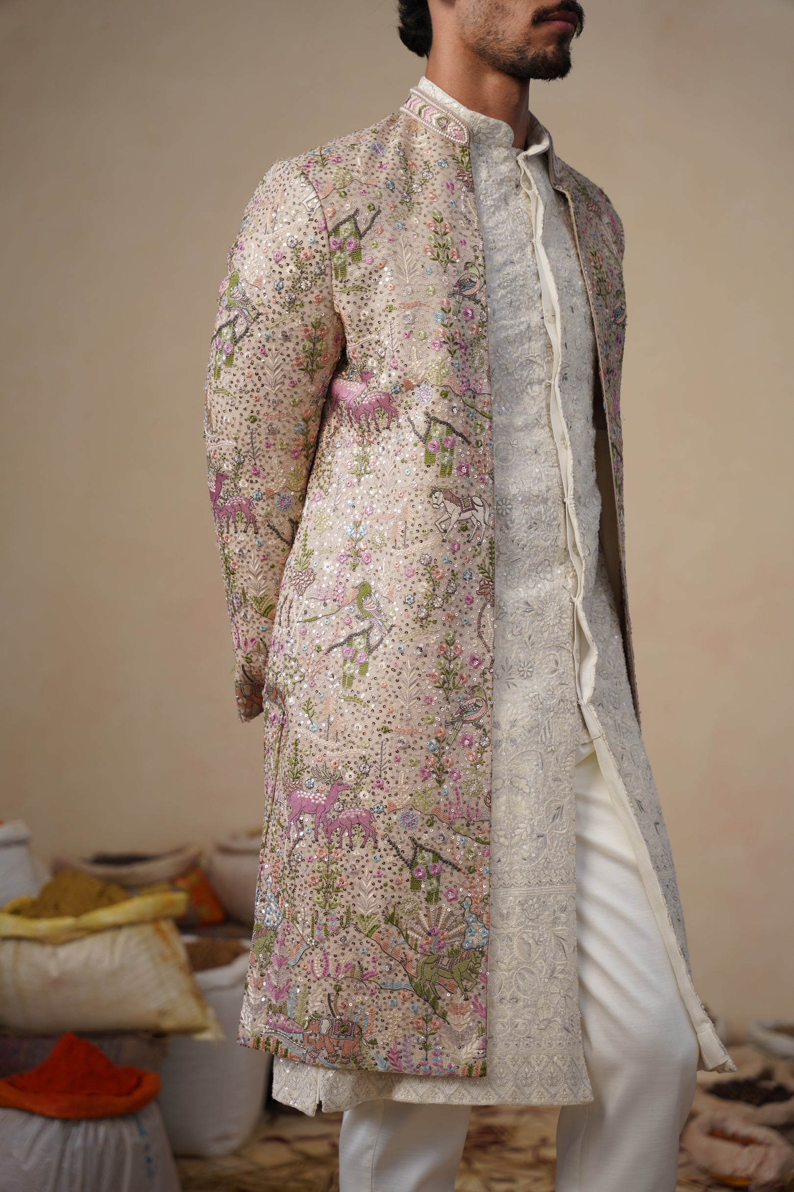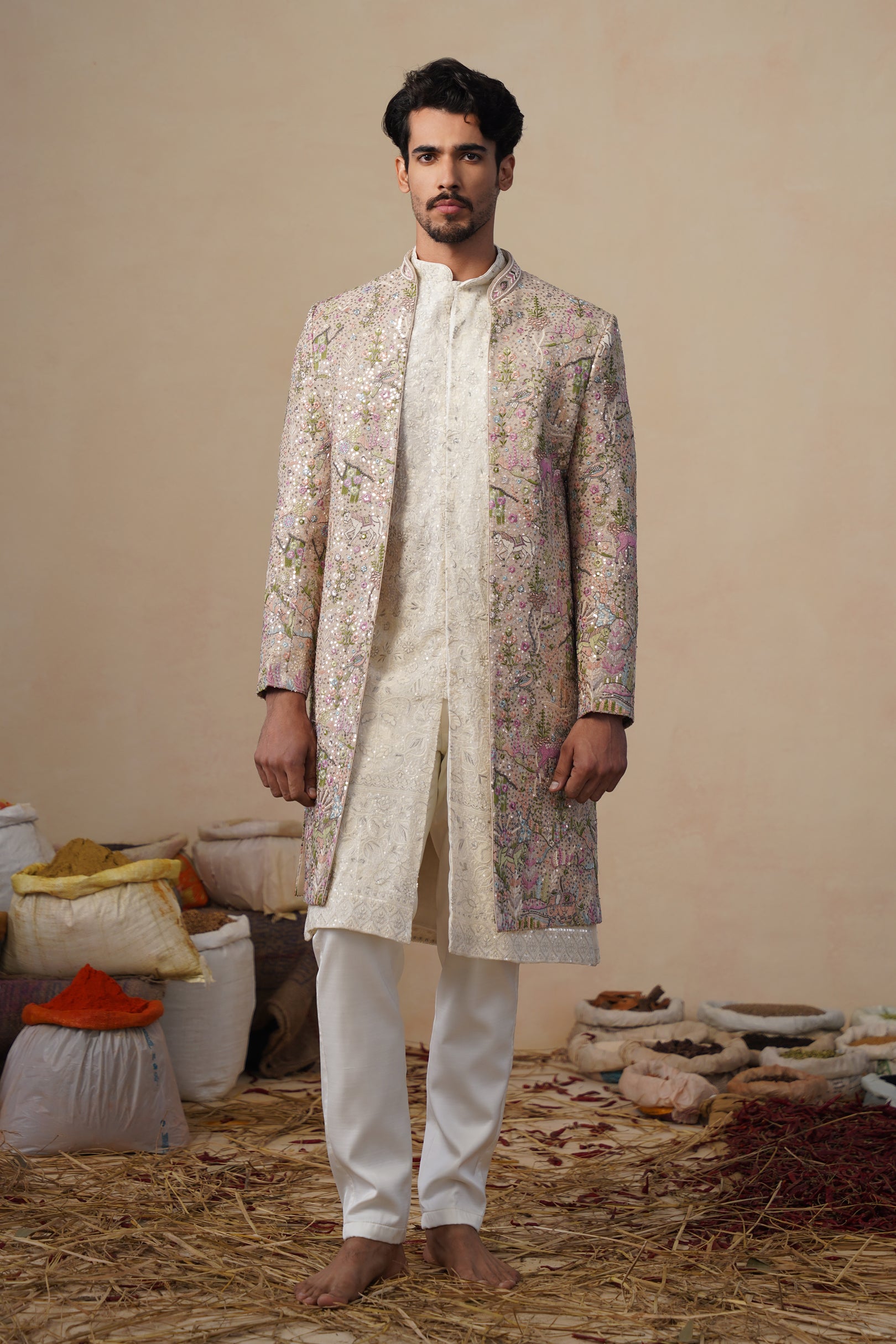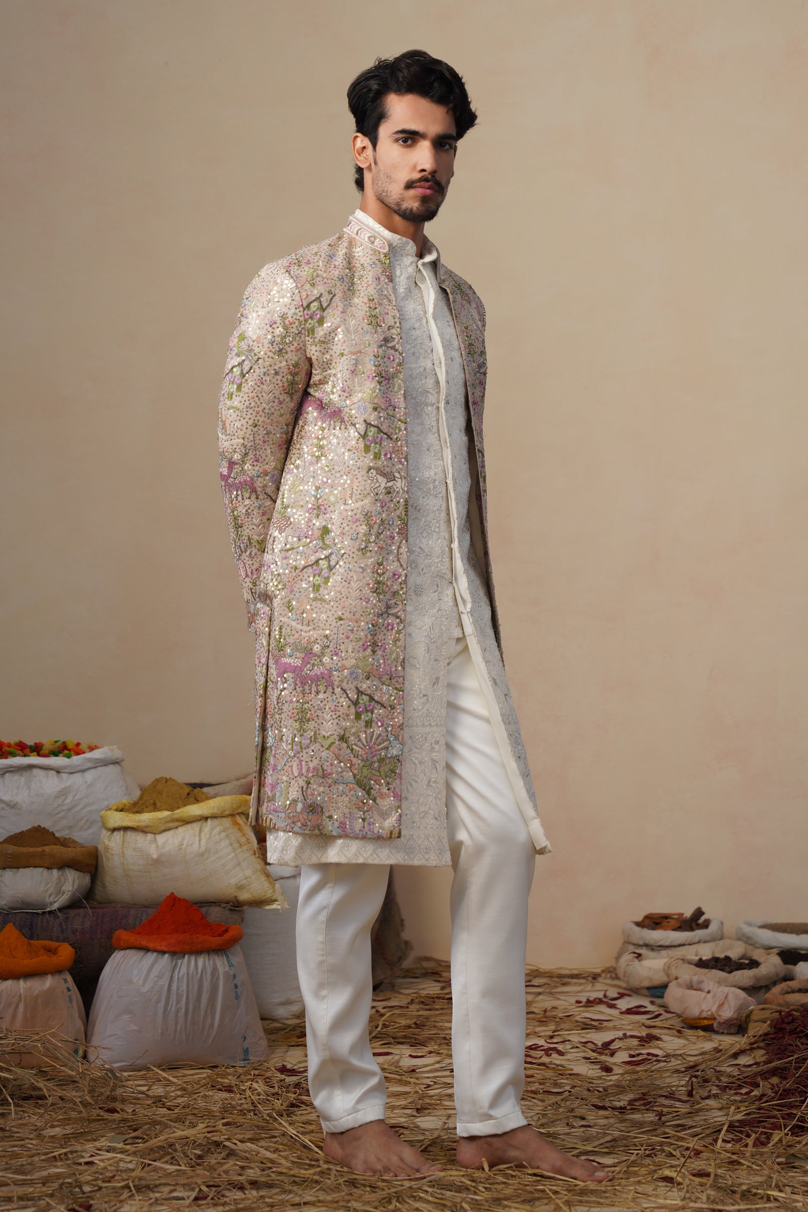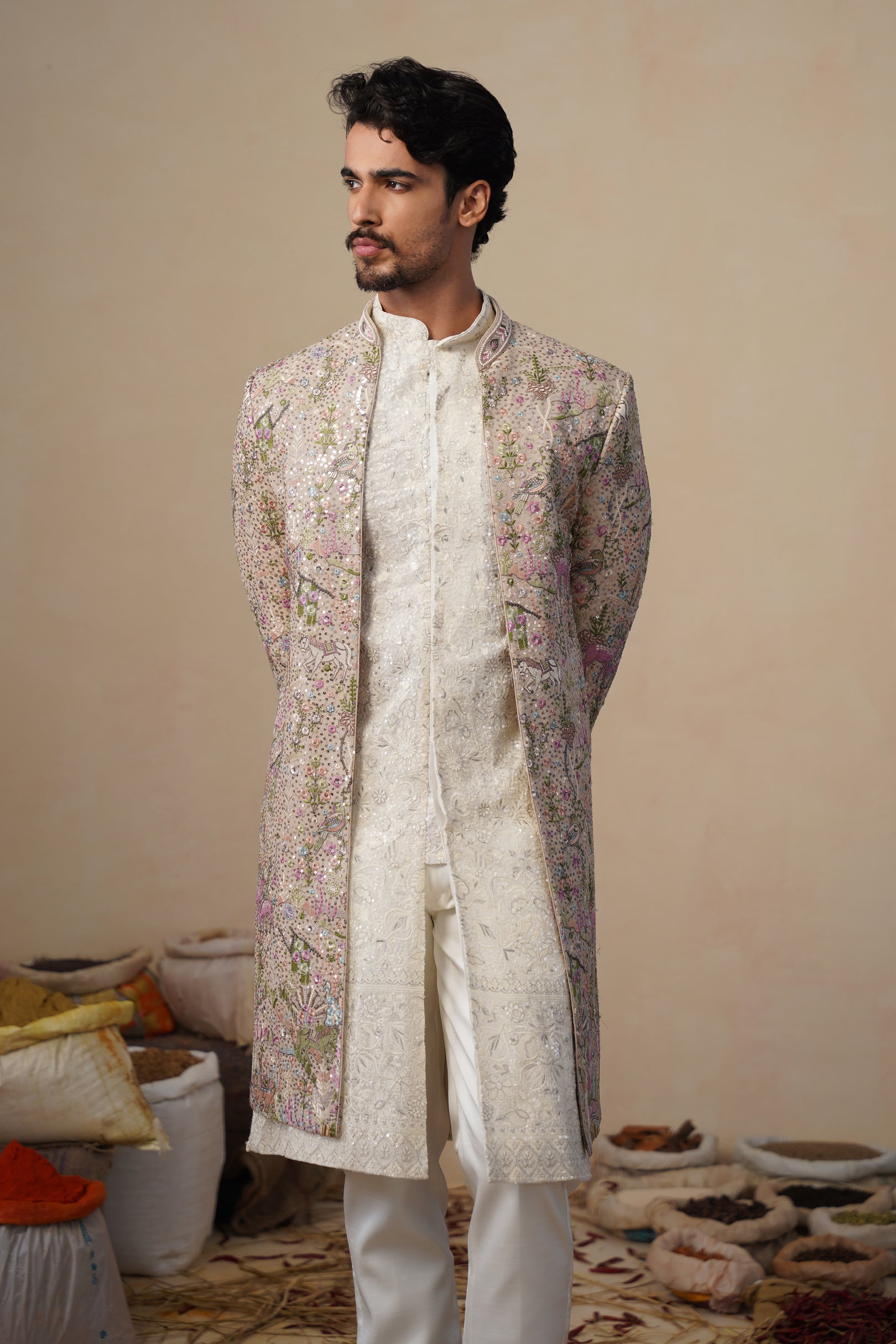This sherwani set features a contemporary front-open kurta layered with a long embroidered jacket and paired with straight pants. The front-open kurta has a sleek, tailored silhouette with subtle all-over surface detailing that adds refined texture. The long jacket is the focal point, showcasing intricate nature-inspired embroidery with finely detailed motifs arranged across the surface, creating a rich handcrafted and artistic appeal. The straight pants complete the ensemble with a clean, structured finish, making this indo-western set ideal for festive and statement occasion wear.