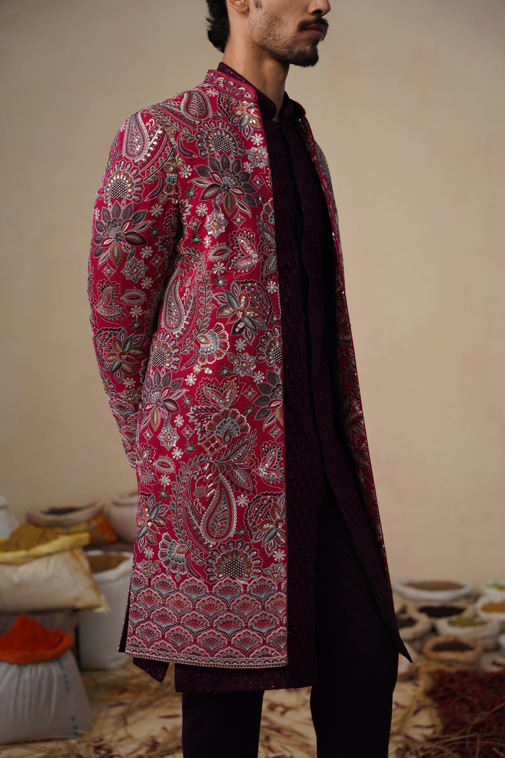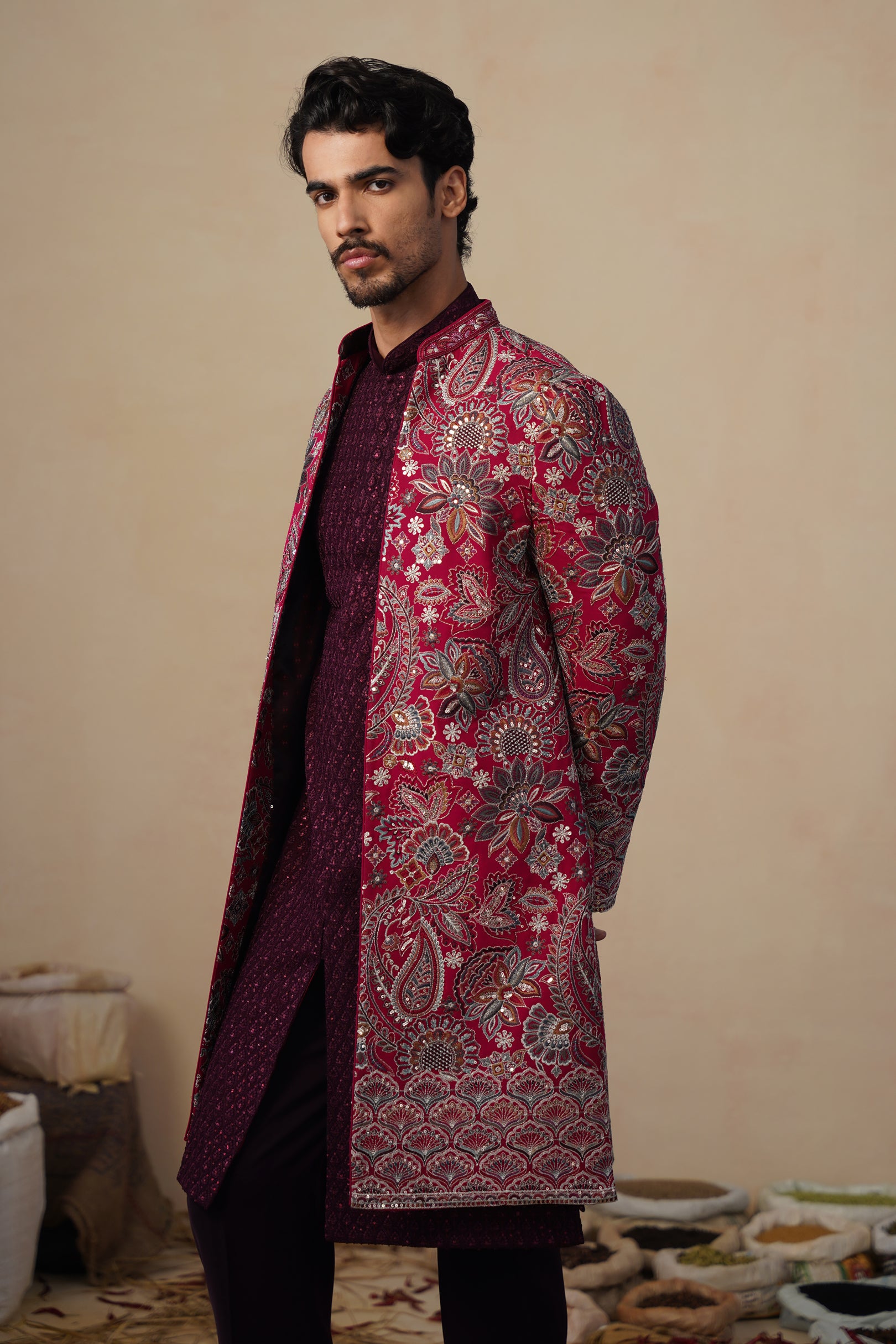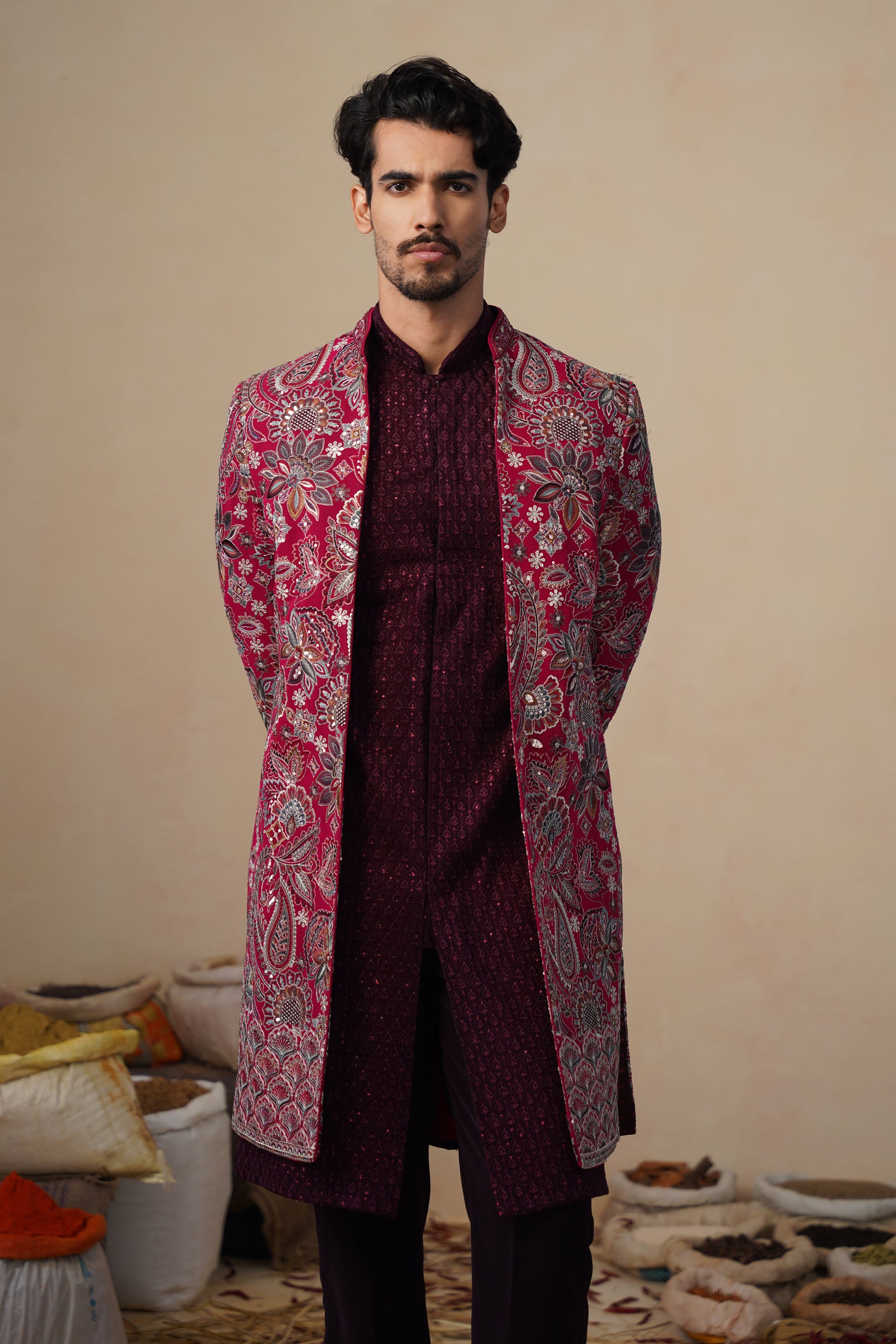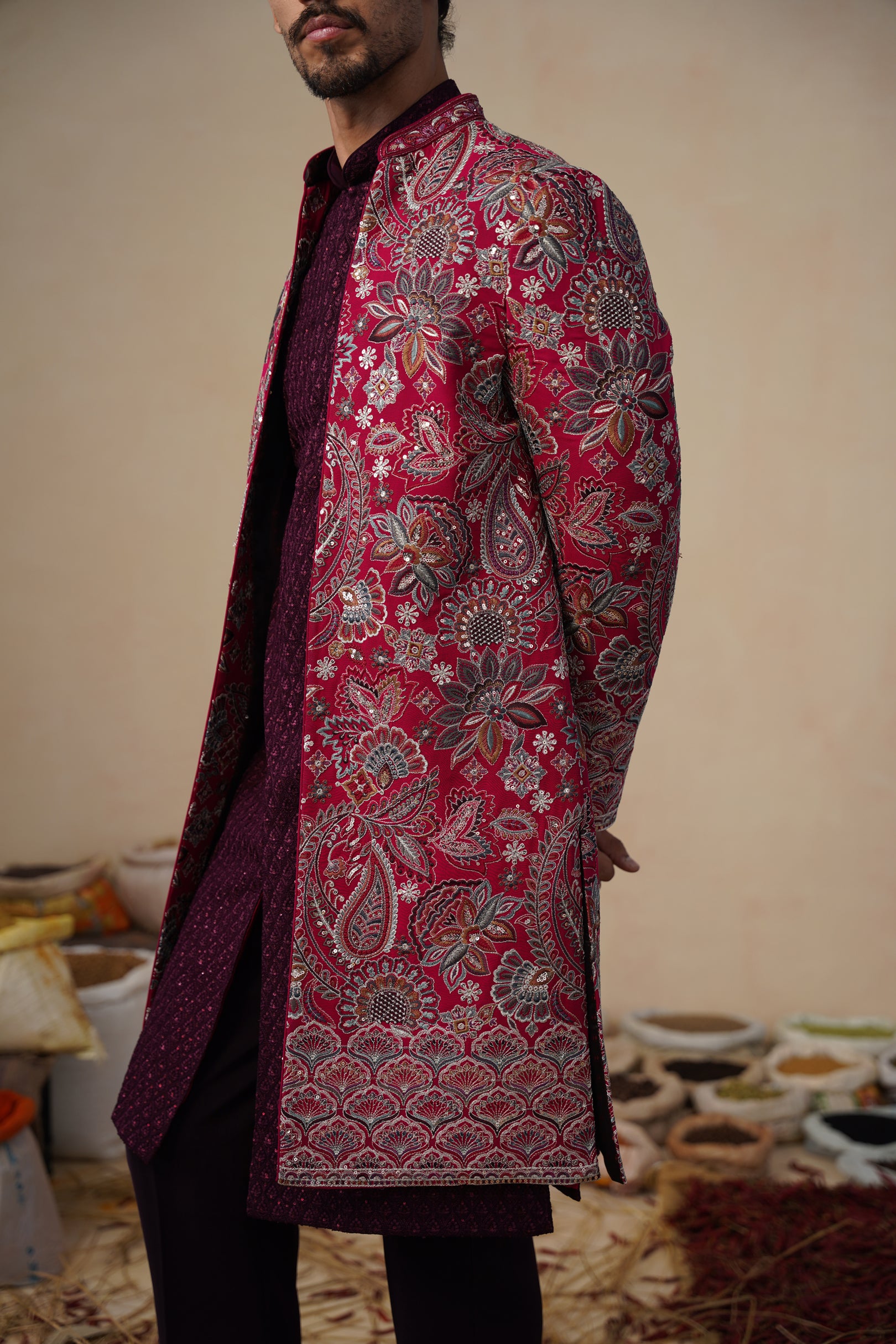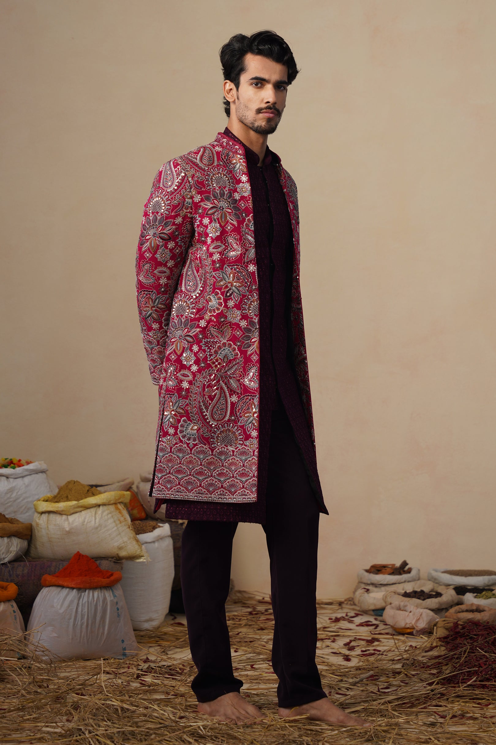This indo-western set features a contemporary front-open kurta layered with a long embroidered jacket and paired with straight pants. The front-open kurta has a sleek, tailored silhouette with subtle all-over surface detailing that adds refined texture. The long jacket is the focal point, showcasing intricate nature-inspired embroidery with finely detailed motifs arranged across the surface, creating a rich handcrafted and artistic appeal. The straight pants complete the ensemble with a clean, structured finish, making this indo-western set ideal for festive and statement occasion wear.