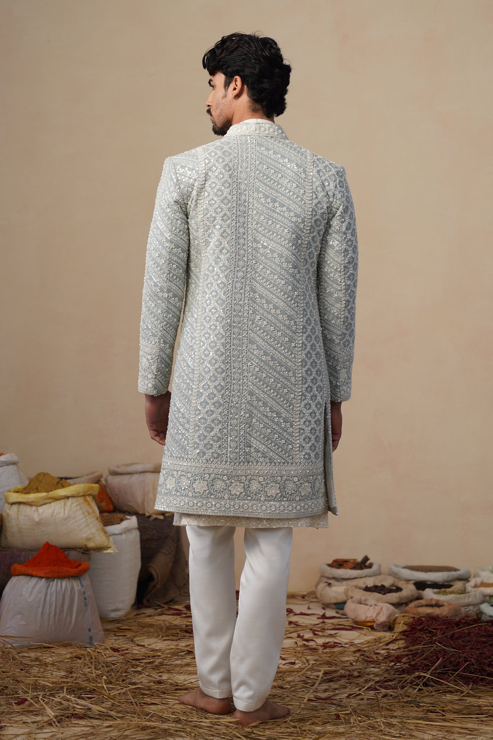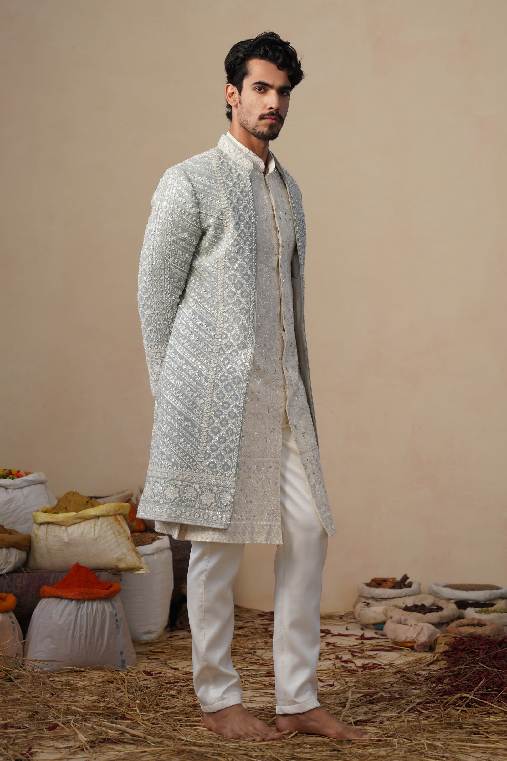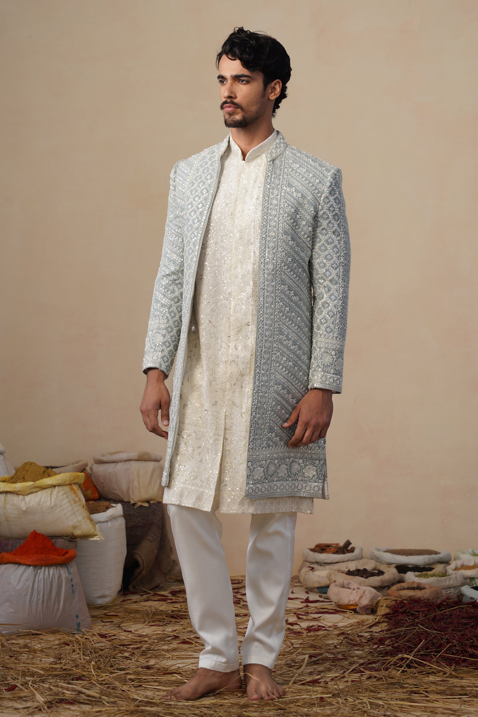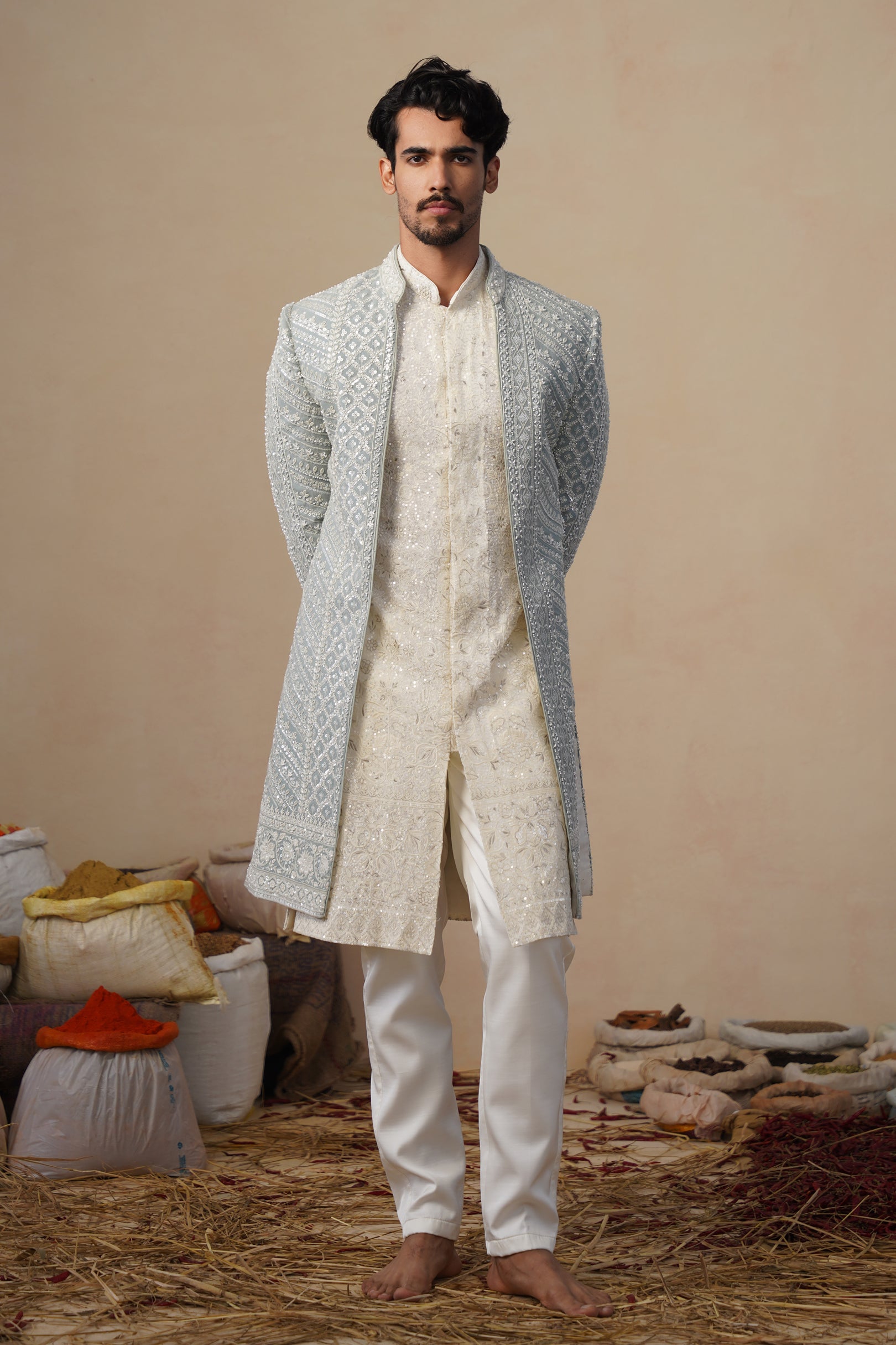 The inner kurta complements the sherwani with understated detailing, creating a balanced contrast to the ornate outer layer. Finished with tailored straight pants, the ensemble offers a polished and graceful finish, making it ideal for weddings, receptions, and ceremonial celebrations where classic craftsmanship meets sophisticated styling.
