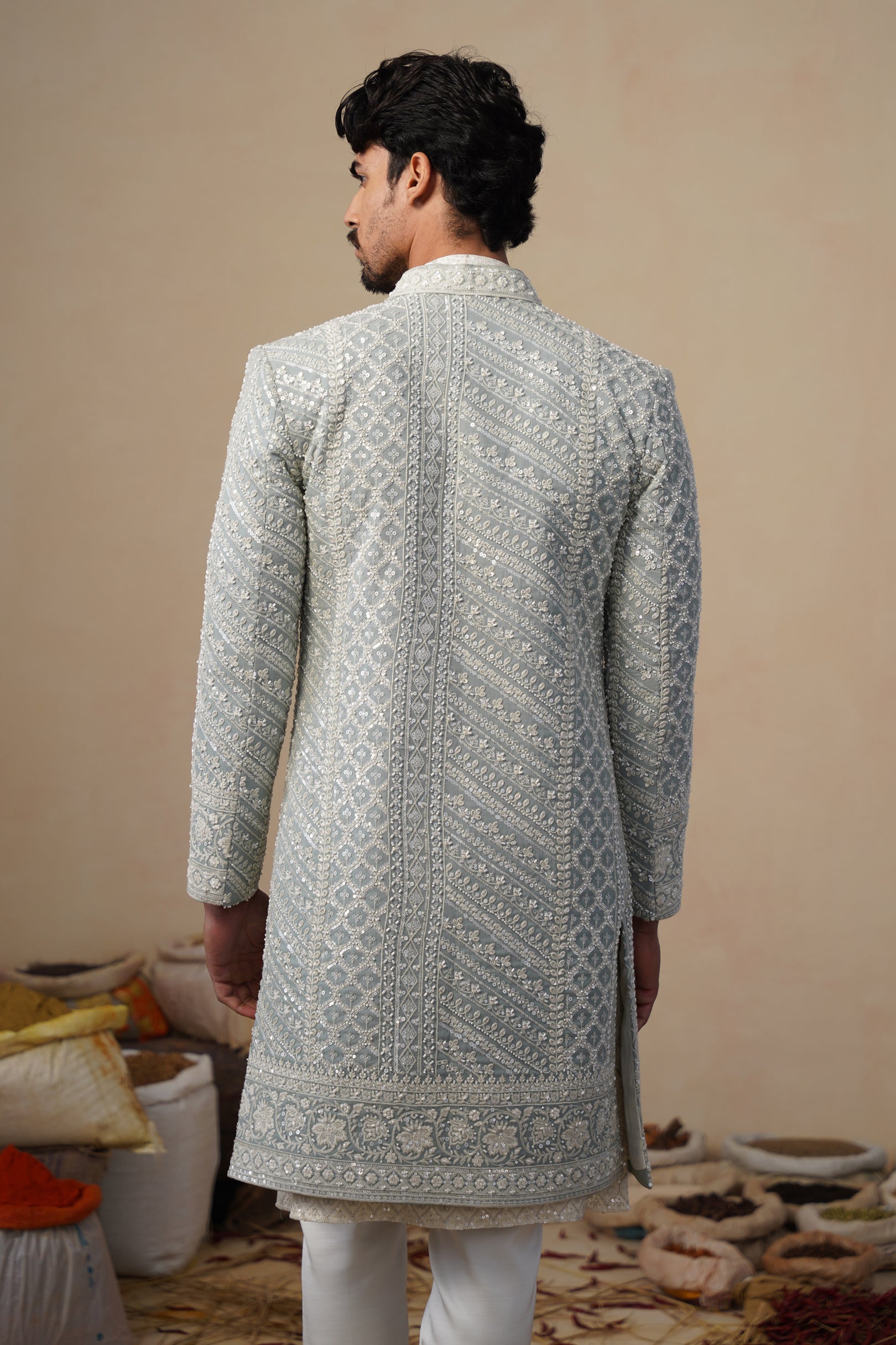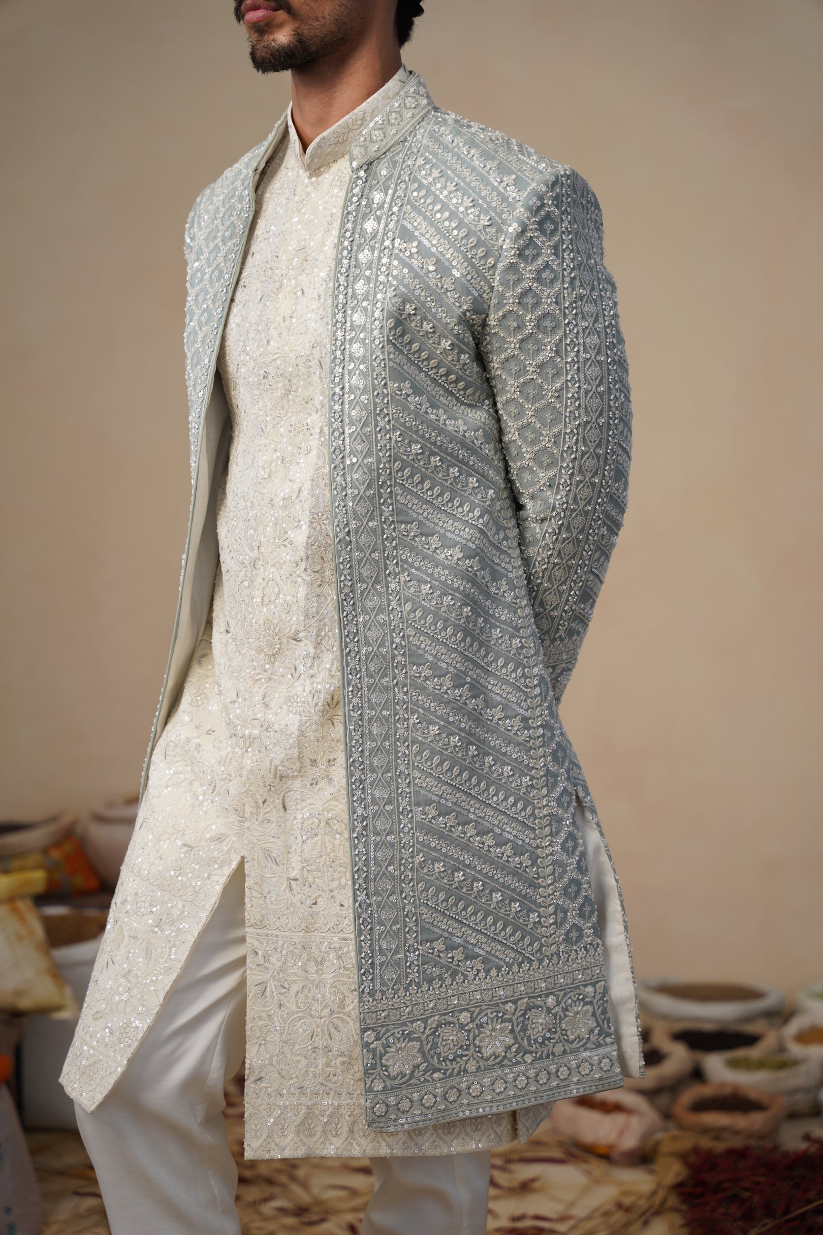 This sherwani set features a long, structured silhouette, paired with a coordinated inner kurta for a refined and regal look. The sherwani is intricately embellished with cutdana embroidery, arranged in detailed floral and ornamental patterns that add depth, texture, and a subtle shimmer. The clean neckline and straight, elongated cut enhance its timeless elegance.