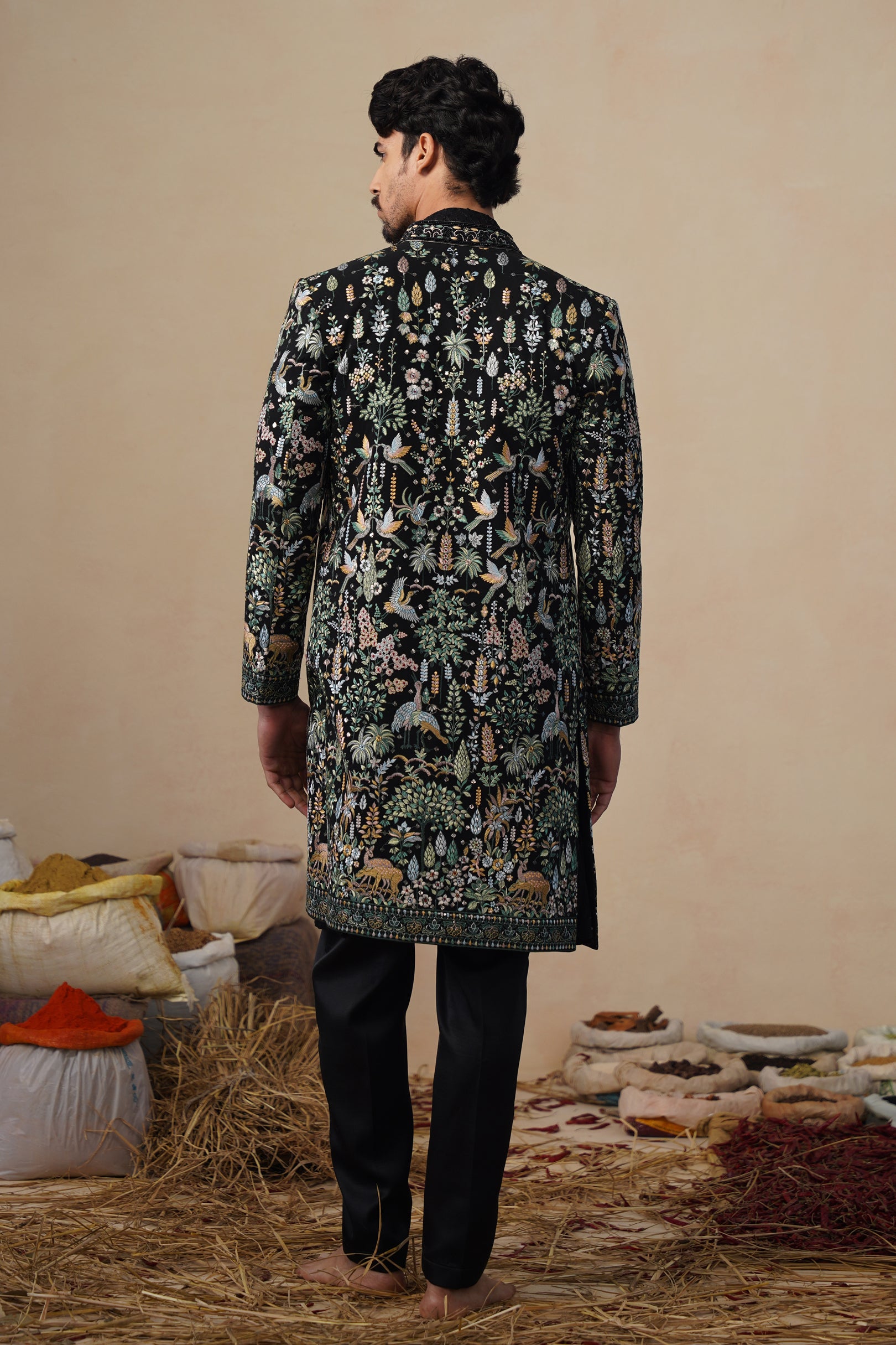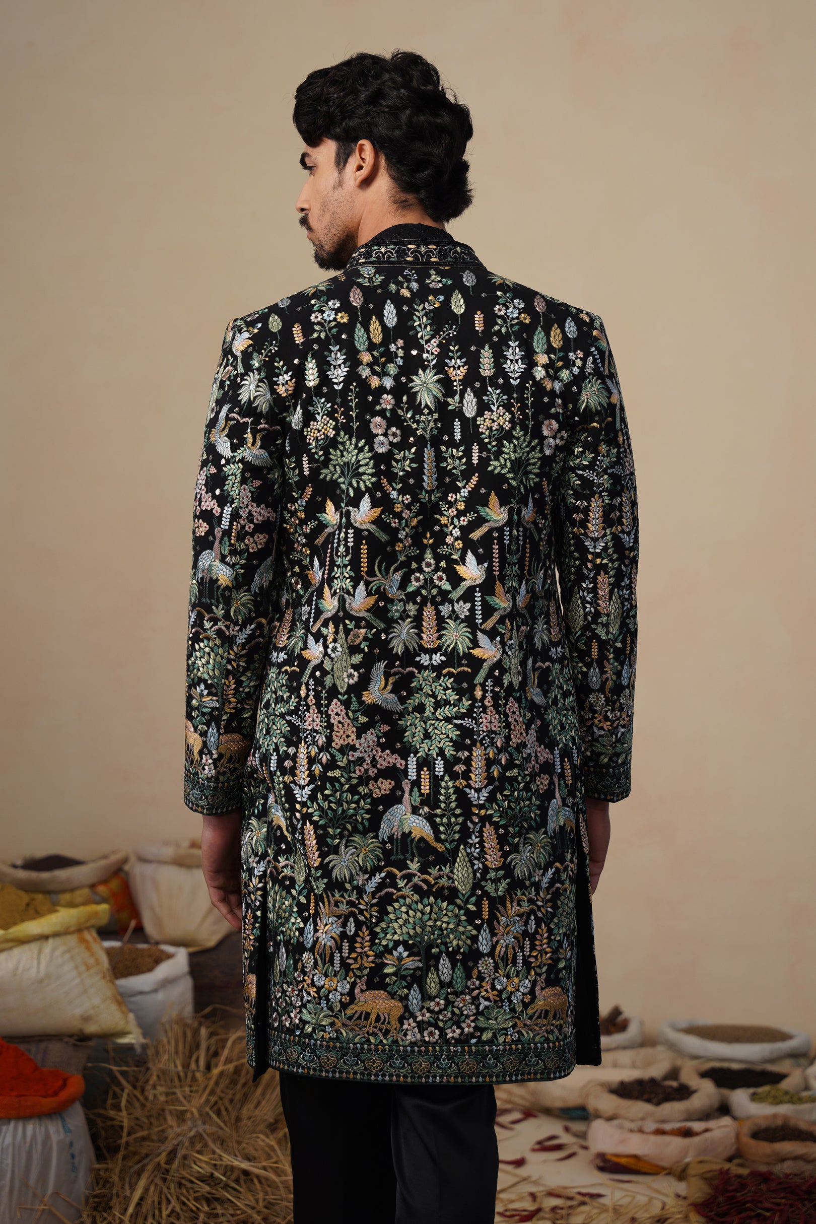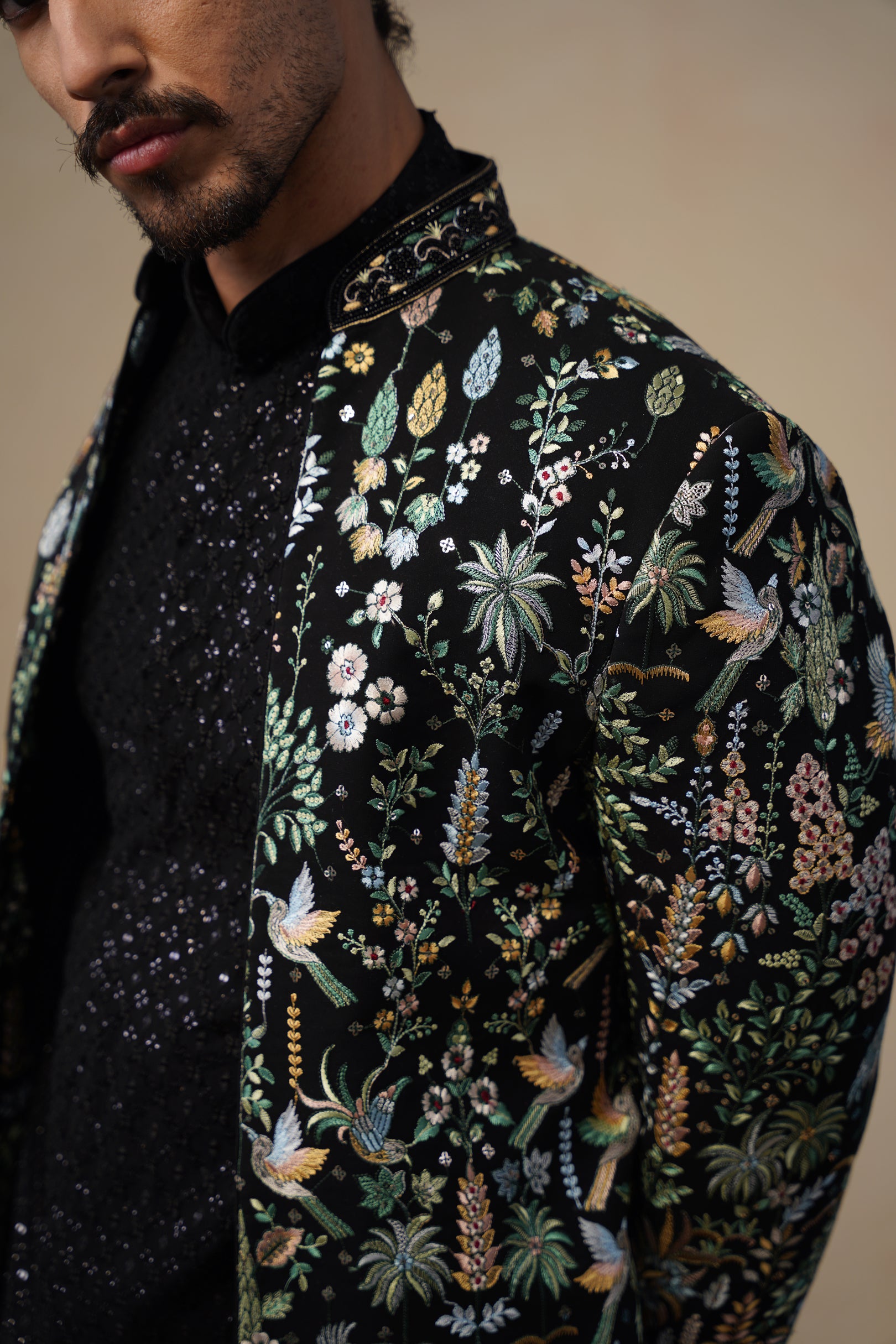 This indo-western set features a contemporary front-open kurta layered with a long embroidered jacket and paired with straight pants. The front-open kurta has a sleek, tailored silhouette with subtle all-over surface detailing that adds refined texture. The long jacket is the focal point, showcasing intricate nature-inspired embroidery with finely detailed motifs arranged across the surface, creating a rich handcrafted and artistic appeal. The straight pants complete the ensemble with a clean, structured finish, making this indo-western set ideal for festive and statement occasion wear.