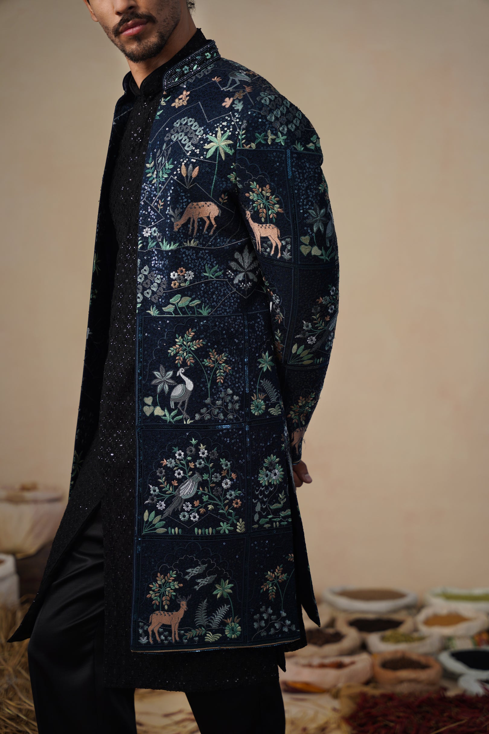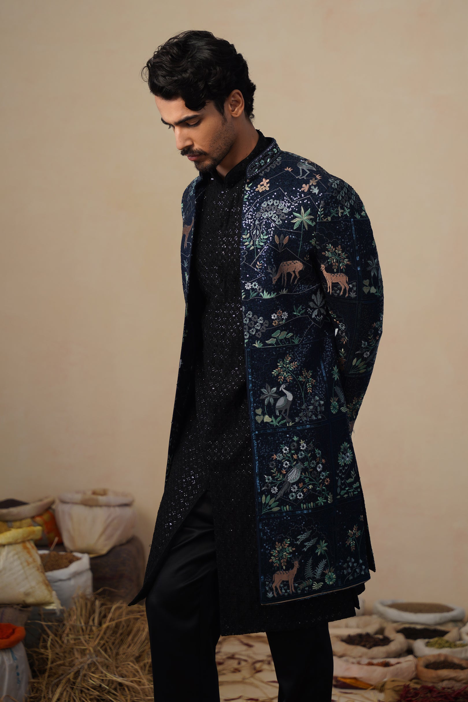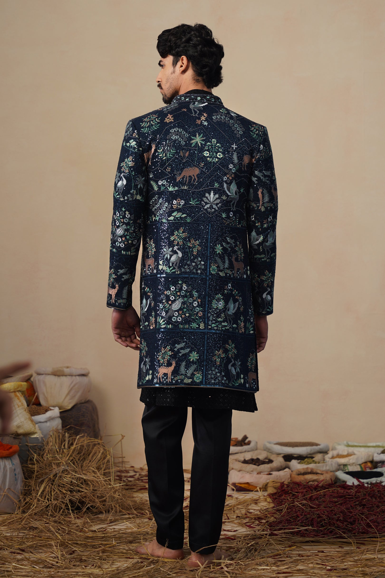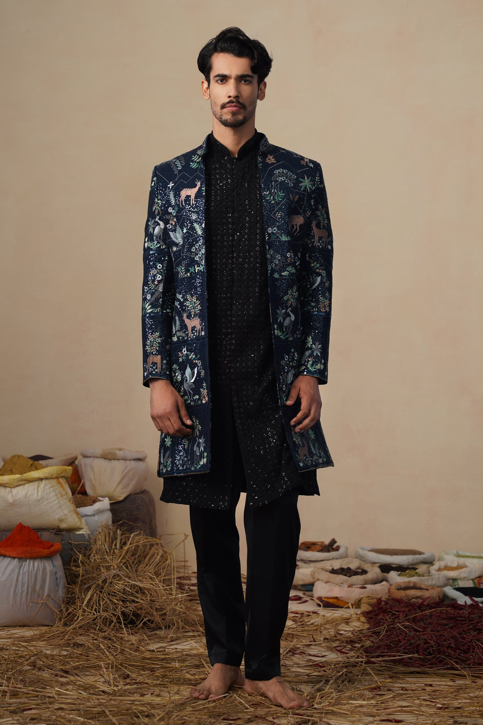 This indo-western set features a contemporary front-open kurta layered with a long embroidered jacket and paired with straight pants. The front-open kurta has a sleek, tailored silhouette with subtle all-over surface detailing that adds refined texture. The long jacket is the focal point, showcasing intricate nature-inspired embroidery with finely detailed motifs arranged across the surface, creating a rich handcrafted and artistic appeal. The straight pants complete the ensemble with a clean, structured finish, making this indo-western set ideal for festive and statement occasion wear.