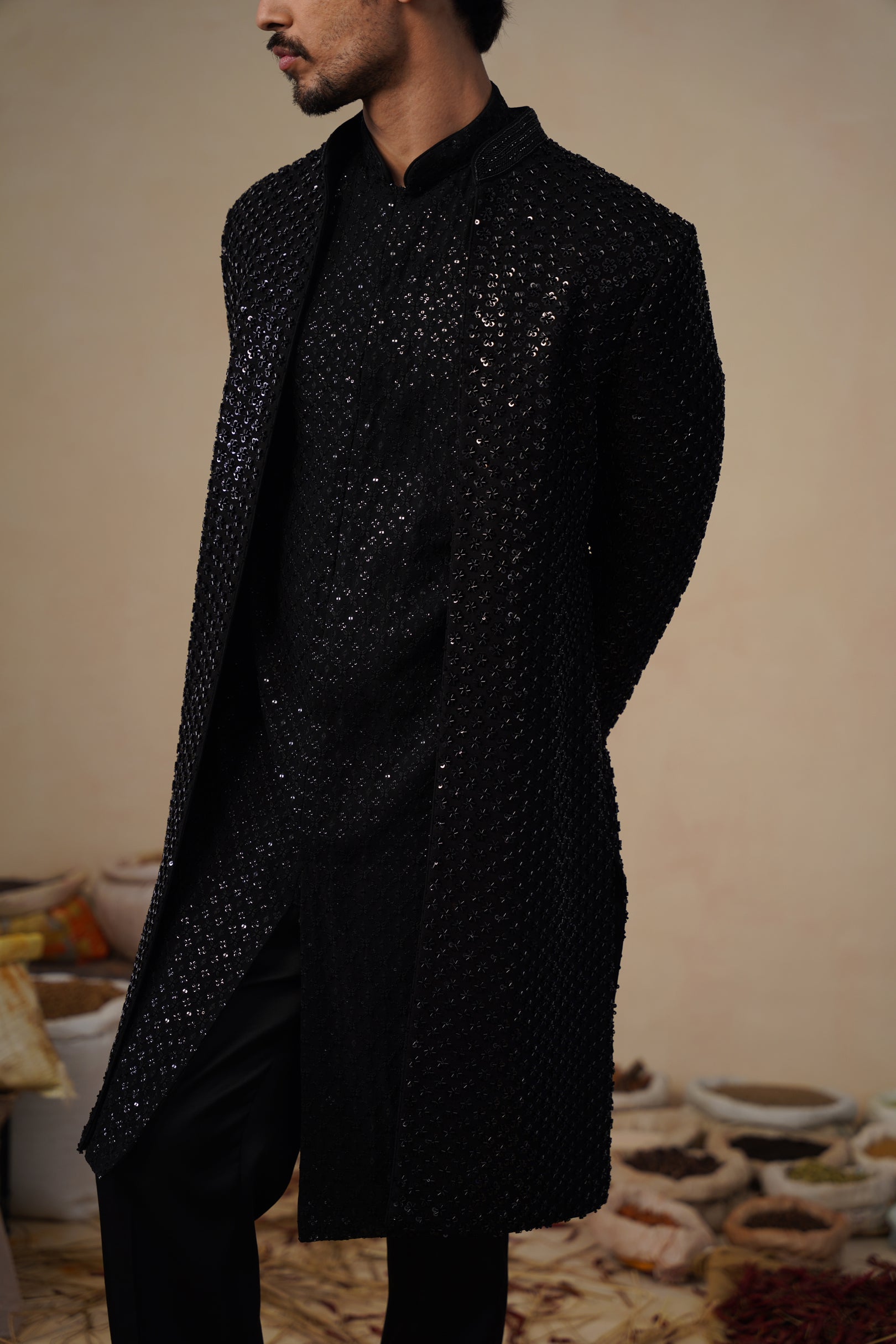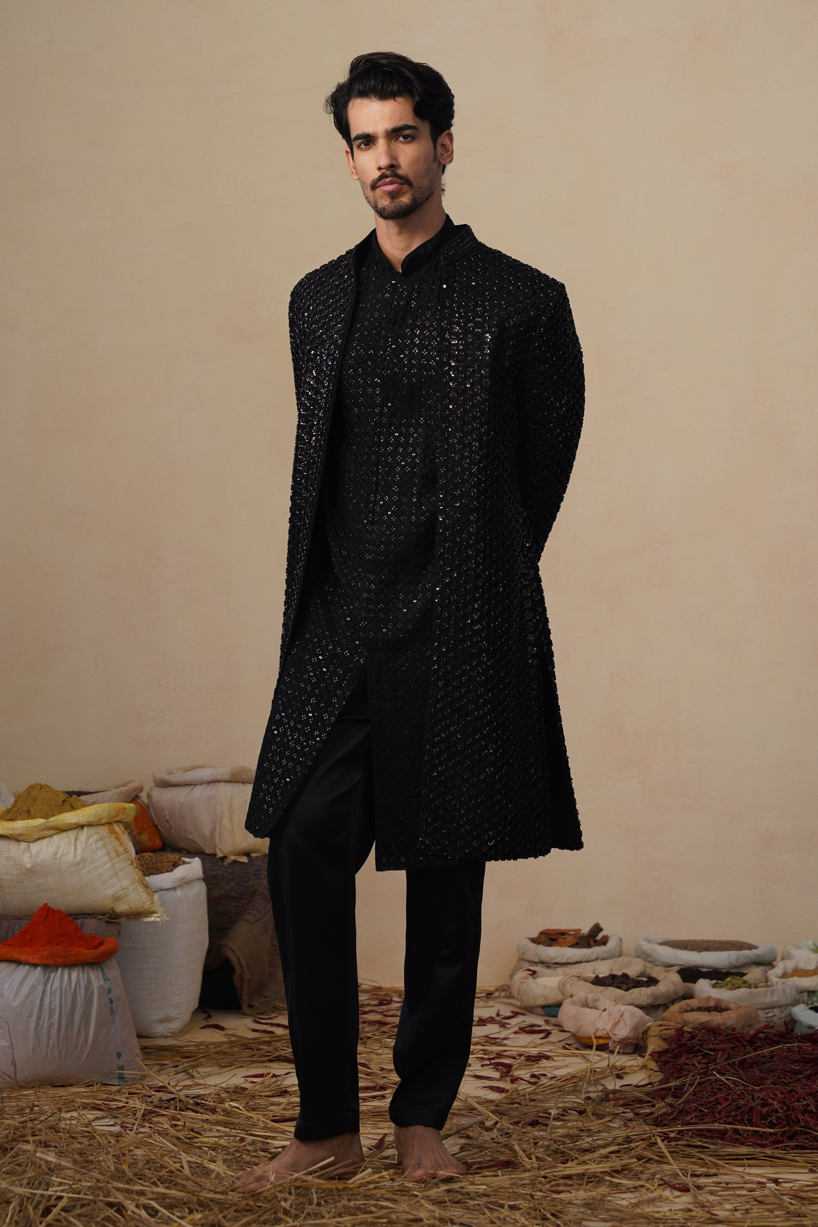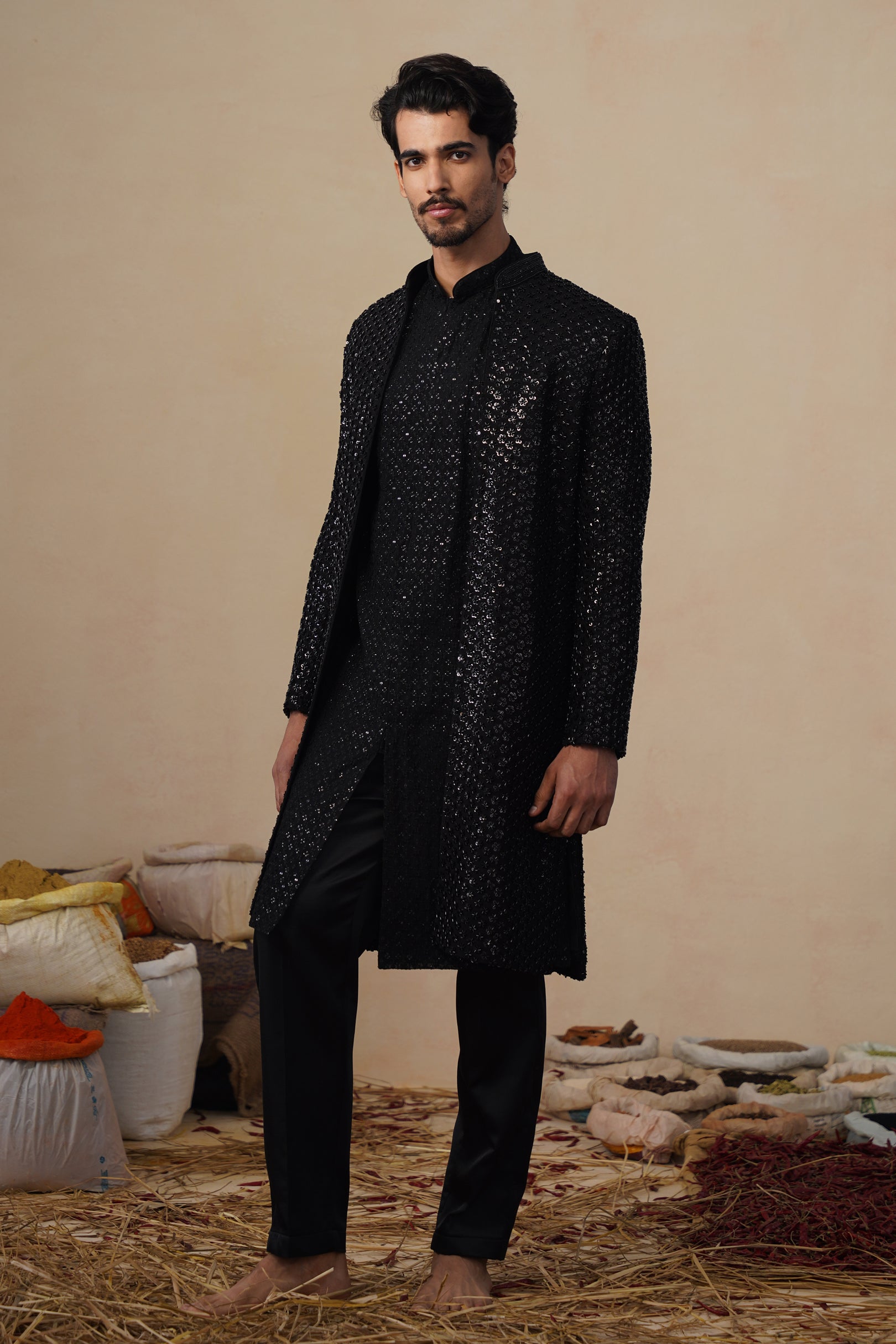 This Indo-western set features a front-open long jacket paired with coordinated bottoms, creating a refined yet contemporary silhouette. The jacket is densely embellished with linear cutdana embroidery, arranged in a subtle all-over pattern that adds depth, texture, and a soft sheen without overpowering the design. The straight, elongated cut gives it a sharp Indo-western appeal, while the clean neckline and minimal closures keep the look sophisticated.