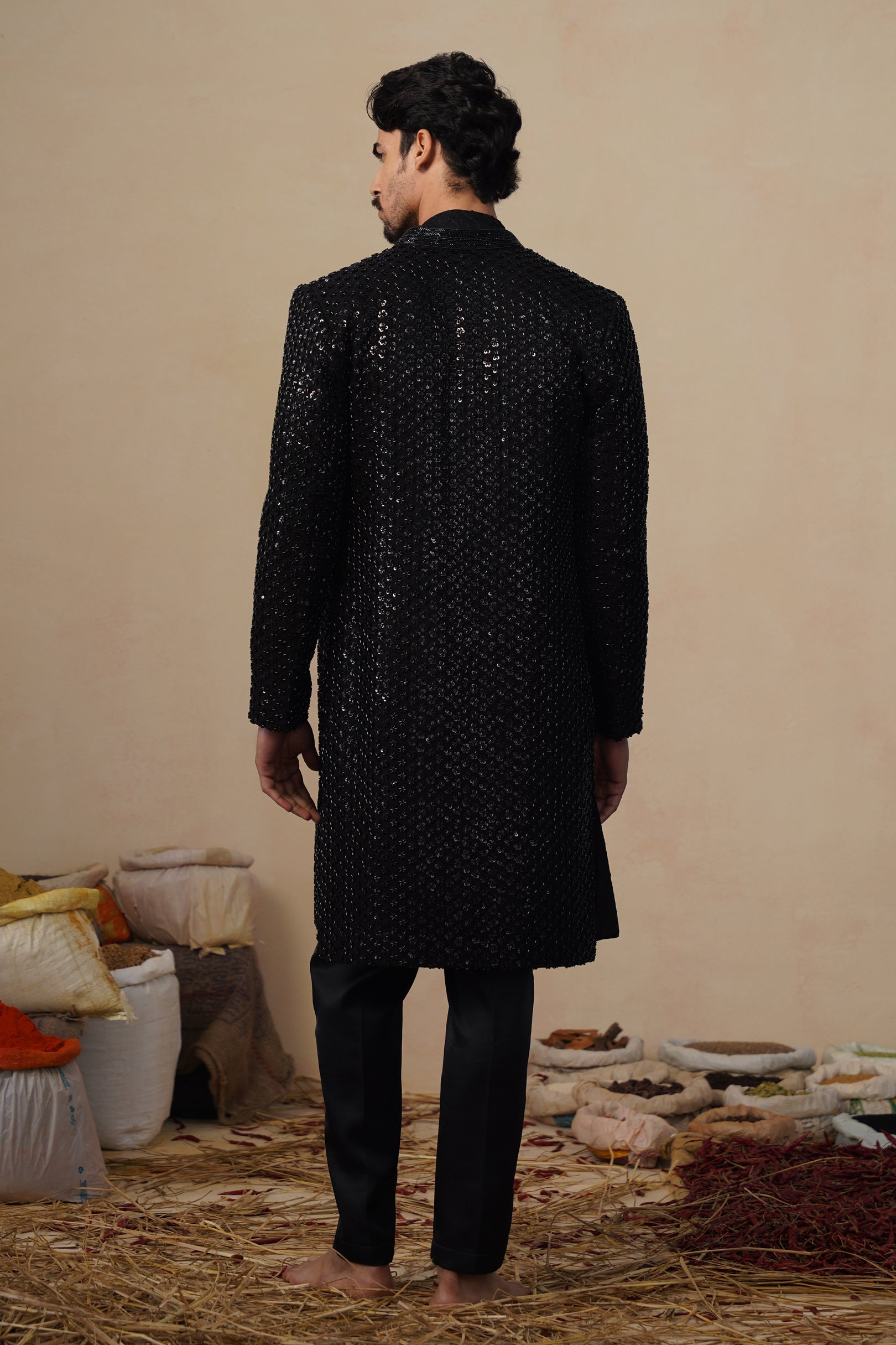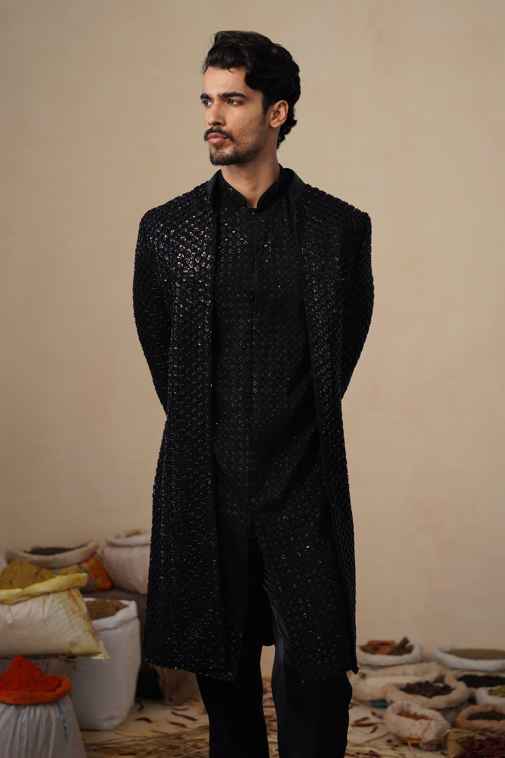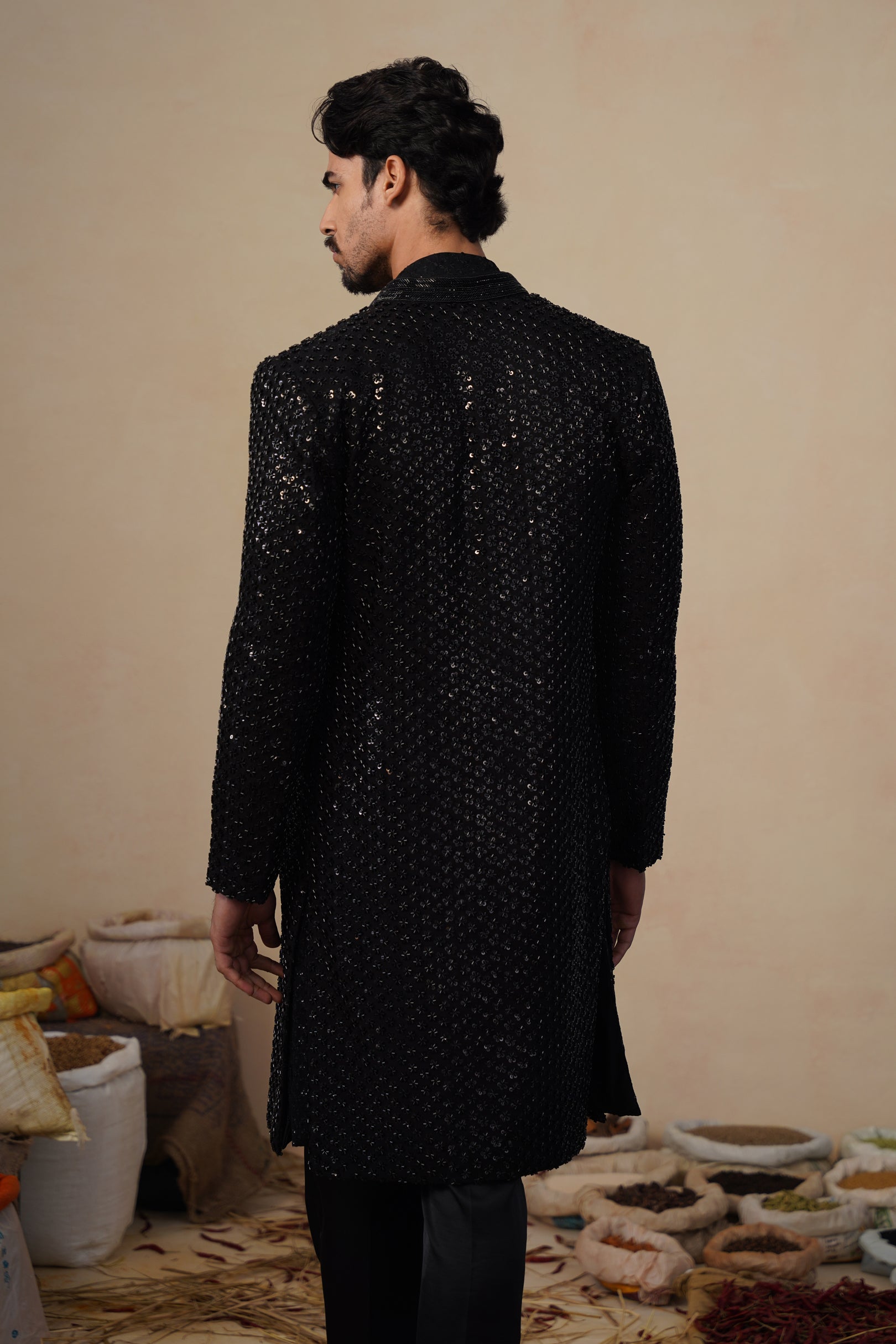 This Indo-western set features a front-open long jacket paired with coordinated bottoms, creating a refined yet contemporary silhouette. The jacket is densely embellished with linear cutdana embroidery, arranged in a subtle all-over pattern that adds depth, texture, and a soft sheen without overpowering the design. The straight, elongated cut gives it a sharp Indo-western appeal, while the clean neckline and minimal closures keep the look sophisticated.