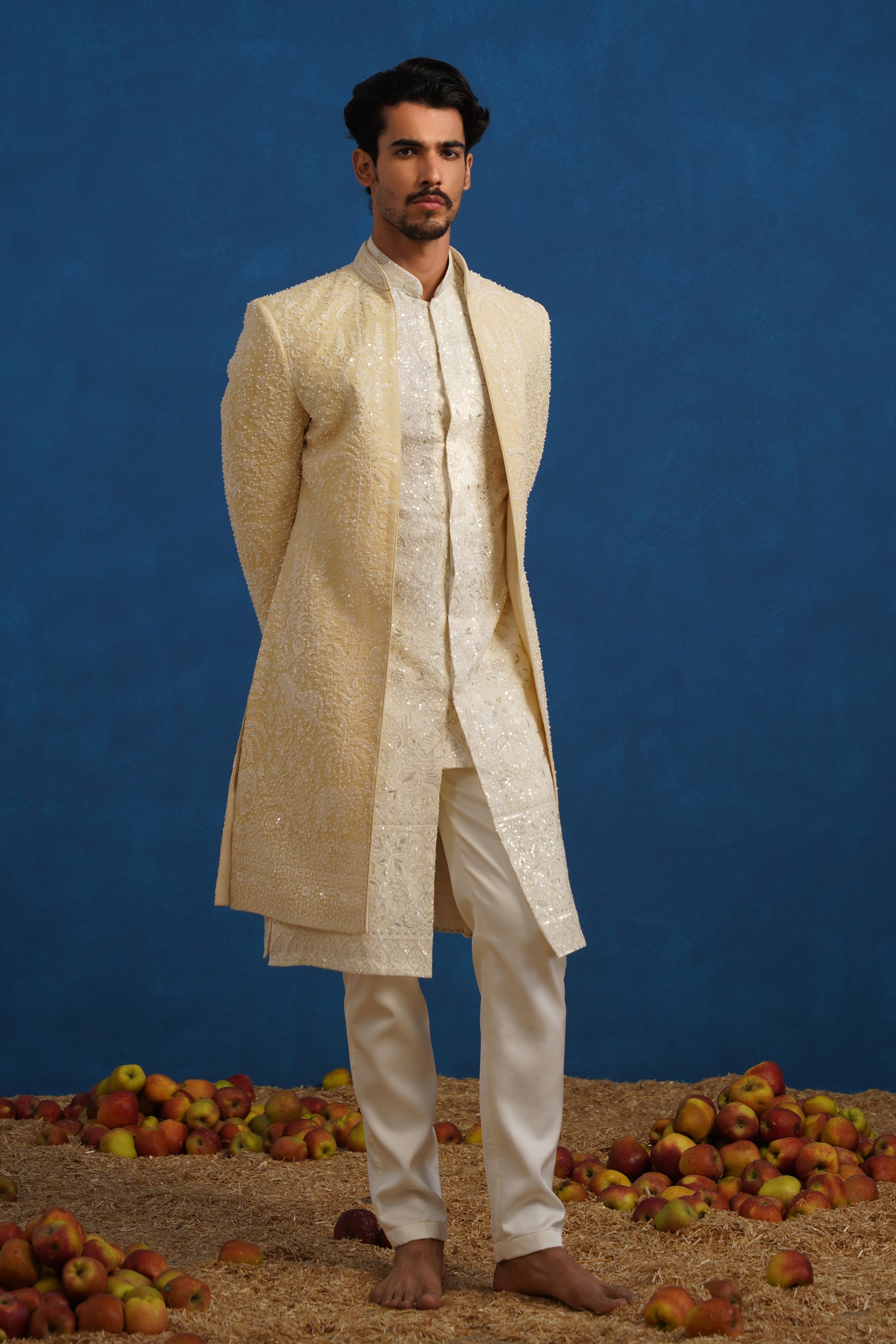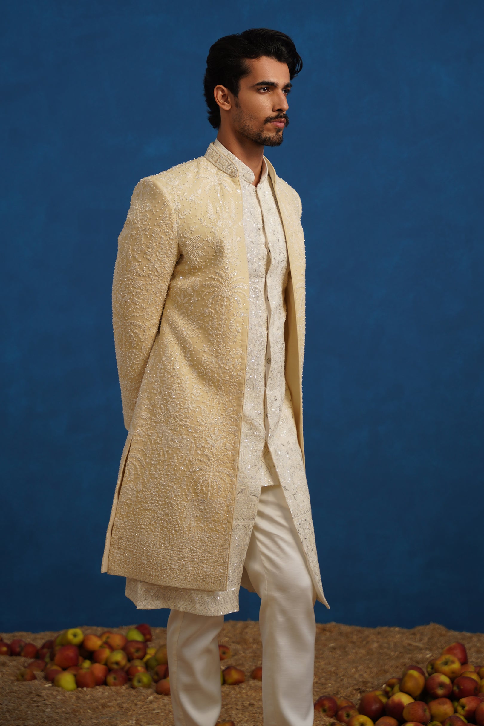 The inner kurta complements the sherwani with understated detailing, creating a balanced contrast to the ornate outer layer. Finished with tailored straight pants, the ensemble offers a polished and graceful finish, making it ideal for weddings, receptions, and ceremonial celebrations where classic craftsmanship meets sophisticated styling.