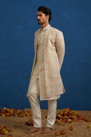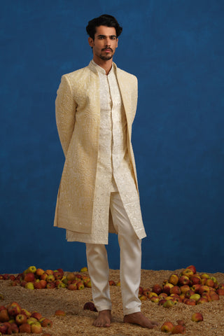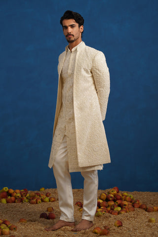 - Classic Minimalism – Ivory and white tones such as the Kyran Sherwani Set White are timeless picks for rituals and traditional occasions.