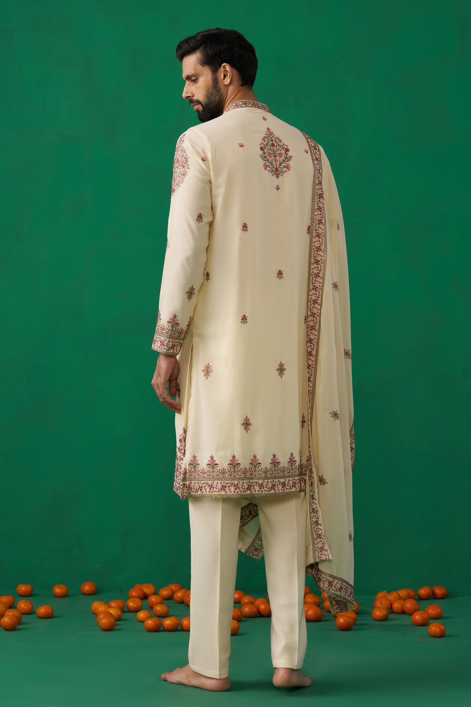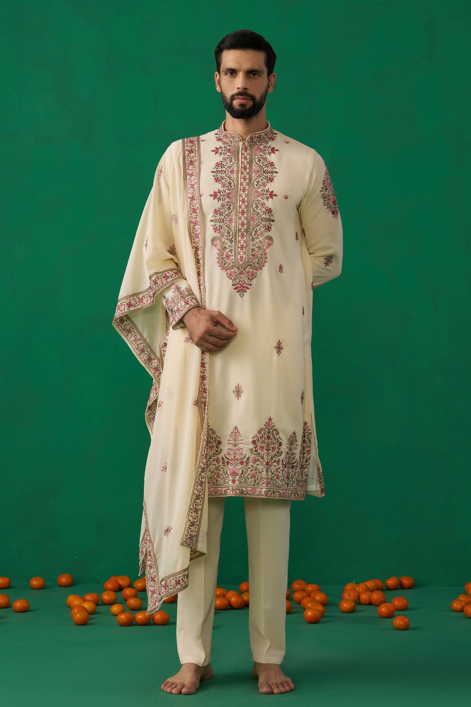 This kurta set features a long-sleeved kurta with elaborate, decorative embroidery on the front, centered around the placket and extending vertically down the garment. The intricate design includes floral and vine-like motifs. Small, scattered embroidered details are also visible on the sleeves and throughout the body of the kurta. The bottom hem is finished with a detailed embroidered border. The set includes straight-cut trousers and a matching dupatta with a wide, ornate, embroidered border. The entire ensemble is suitable for festive and wedding wear.