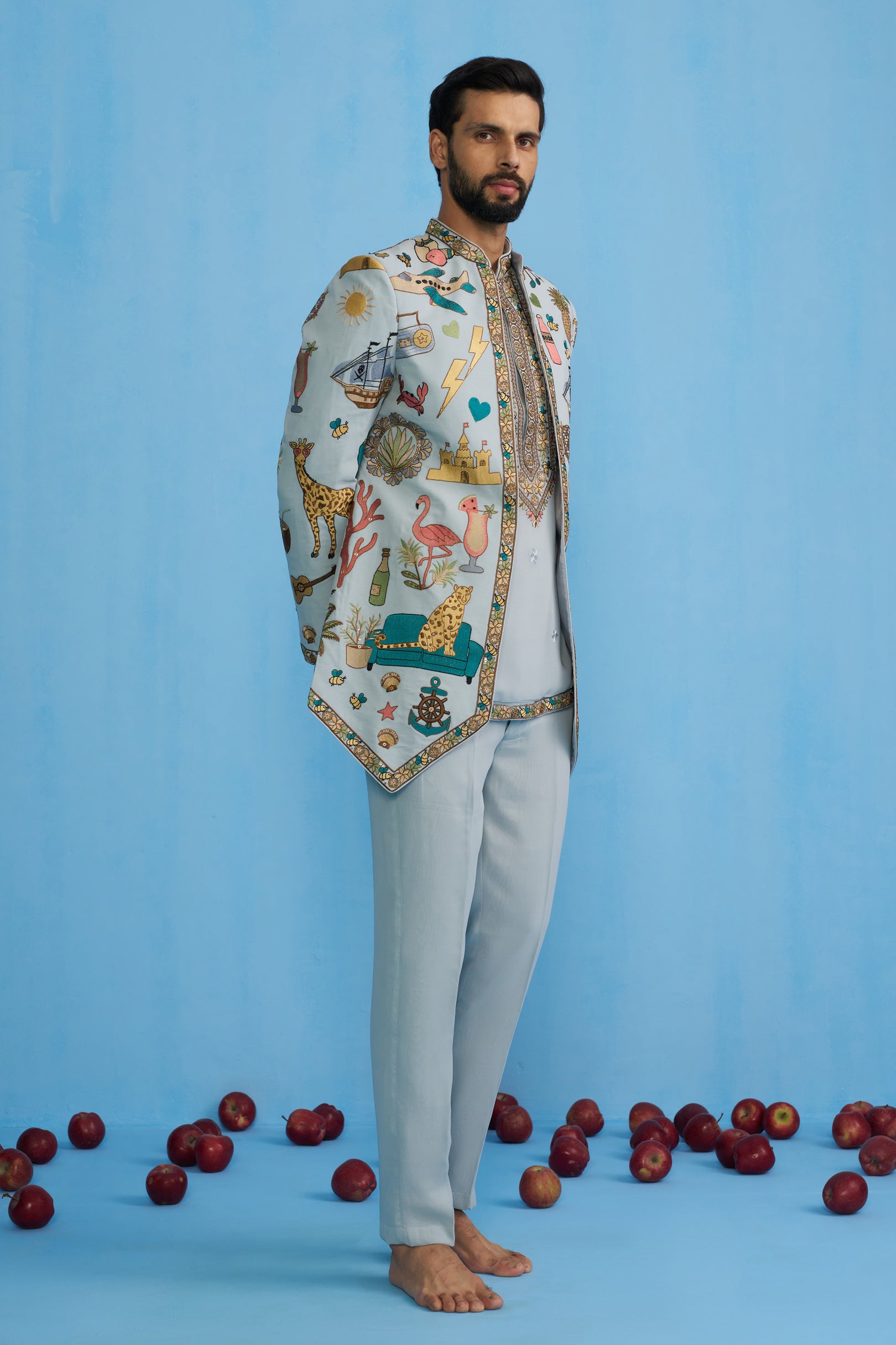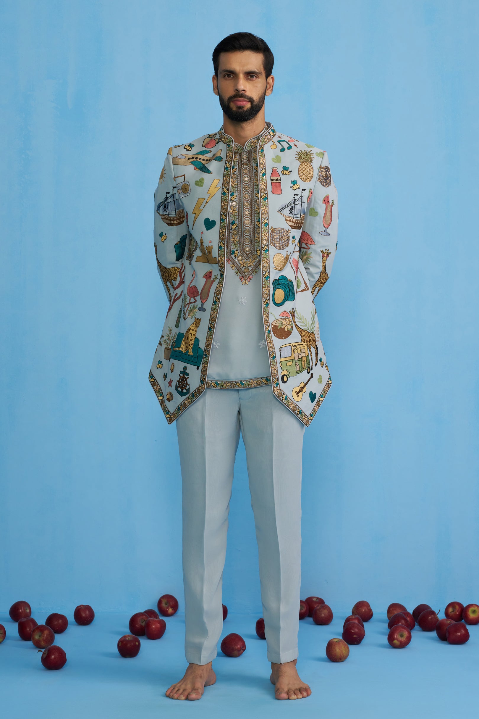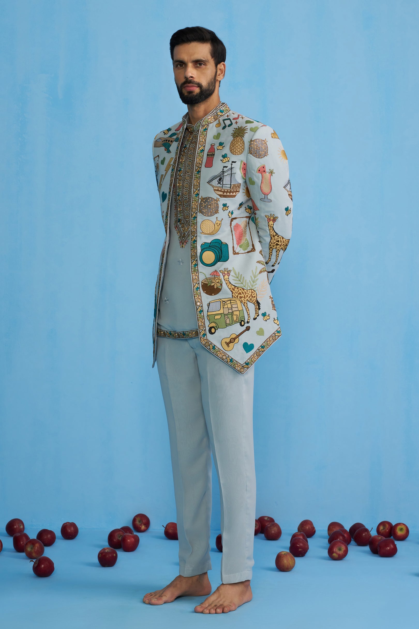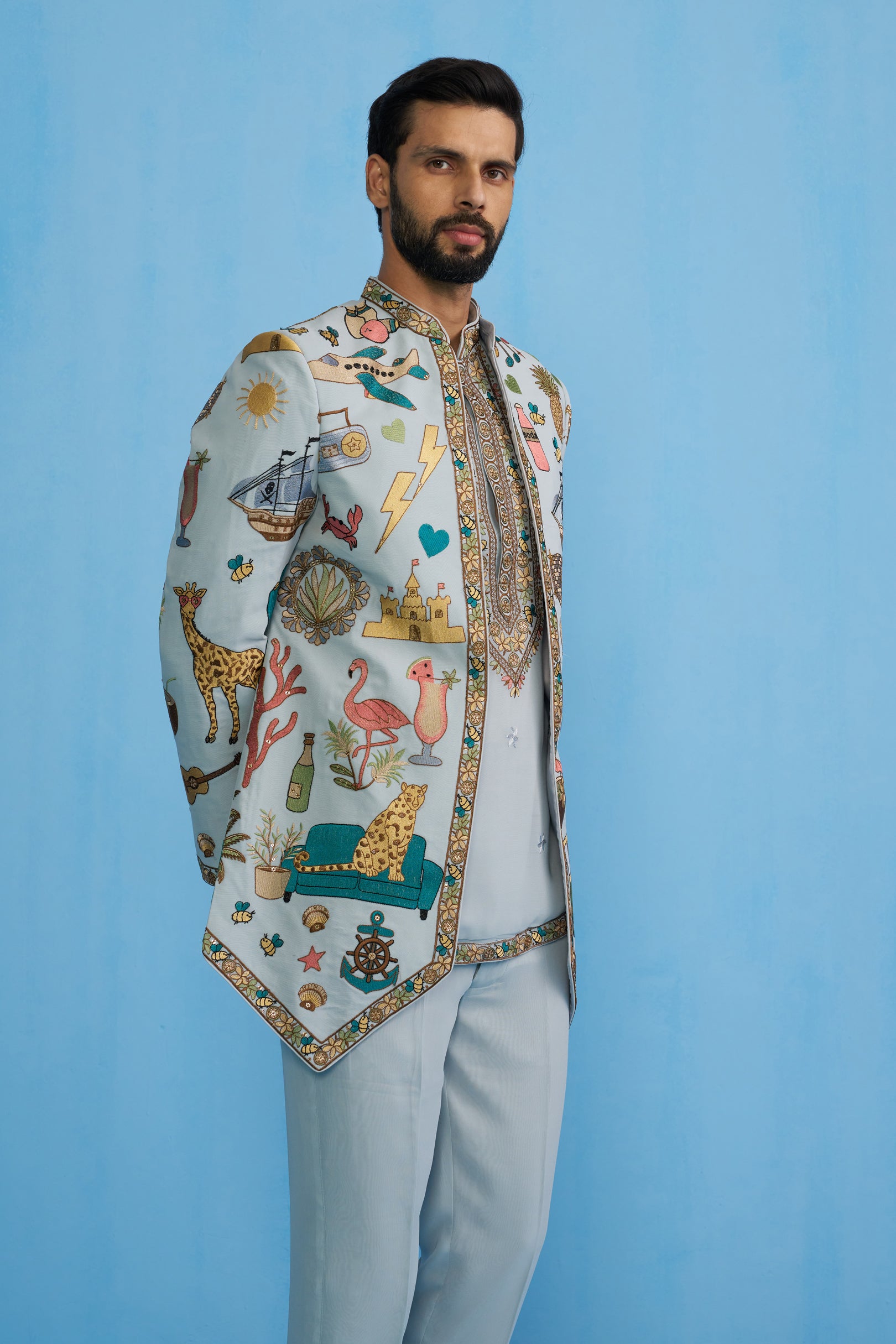 This Jodhpuri set features a long jacket with a sharp, structured cut and a bandhgala neckline. The jacket is decorated with eclectic, playful motifs including animals, ships, fruits, instruments, and travel-inspired elements, bordered with intricate embroidery along the edges. It is worn over a shirt detailed with a heavily embroidered placket and hem, paired with straight trousers. The ensemble blends traditional tailoring with whimsical storytelling motifs, giving it a contemporary and artistic appeal.