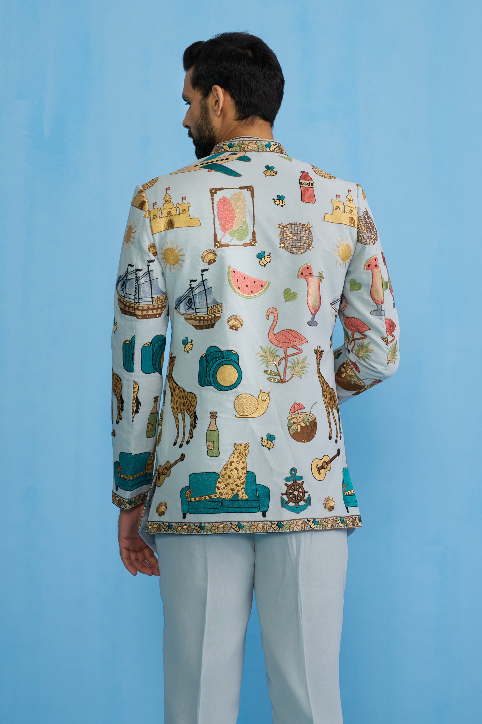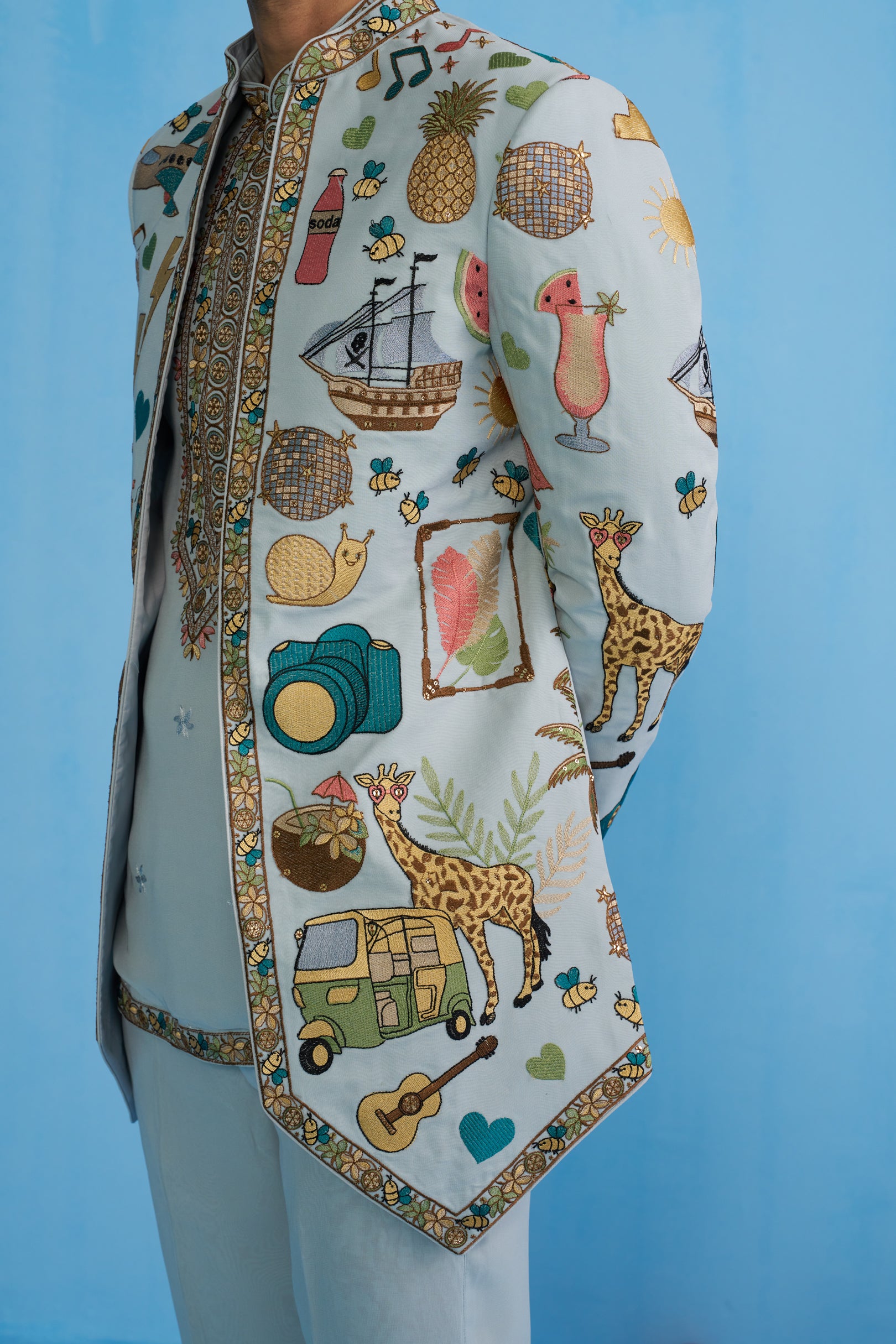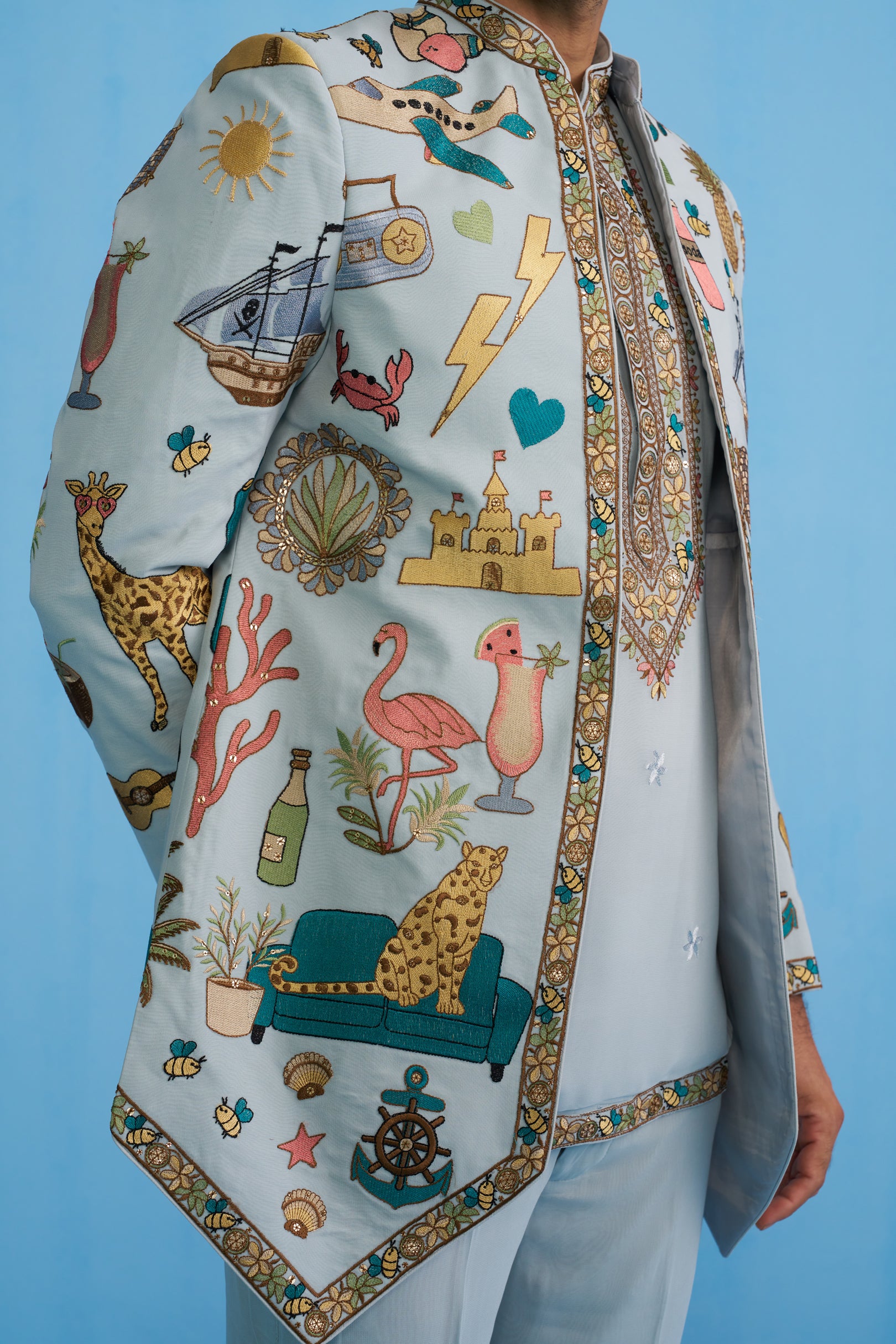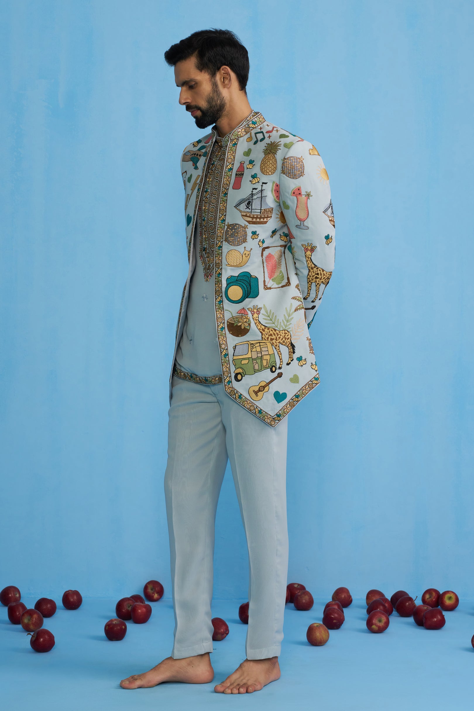 This Jodhpuri set features a long jacket with a sharp, structured cut and a bandhgala neckline. The jacket is decorated with eclectic, playful motifs including animals, ships, fruits, instruments, and travel-inspired elements, bordered with intricate embroidery along the edges. It is worn over a shirt detailed with a heavily embroidered placket and hem, paired with straight trousers. The ensemble blends traditional tailoring with whimsical storytelling motifs, giving it a contemporary and artistic appeal.