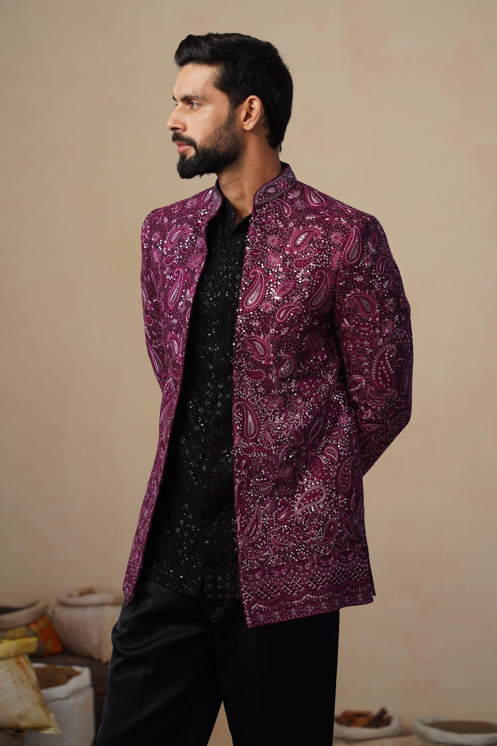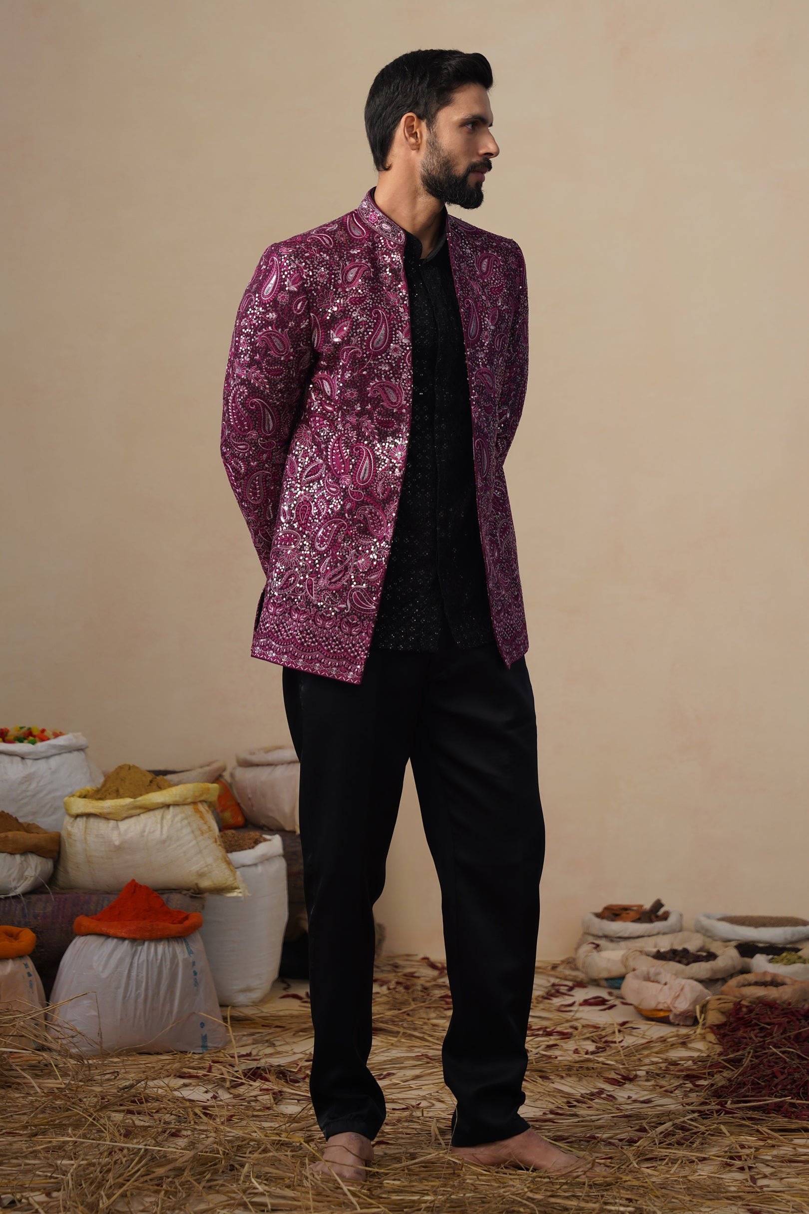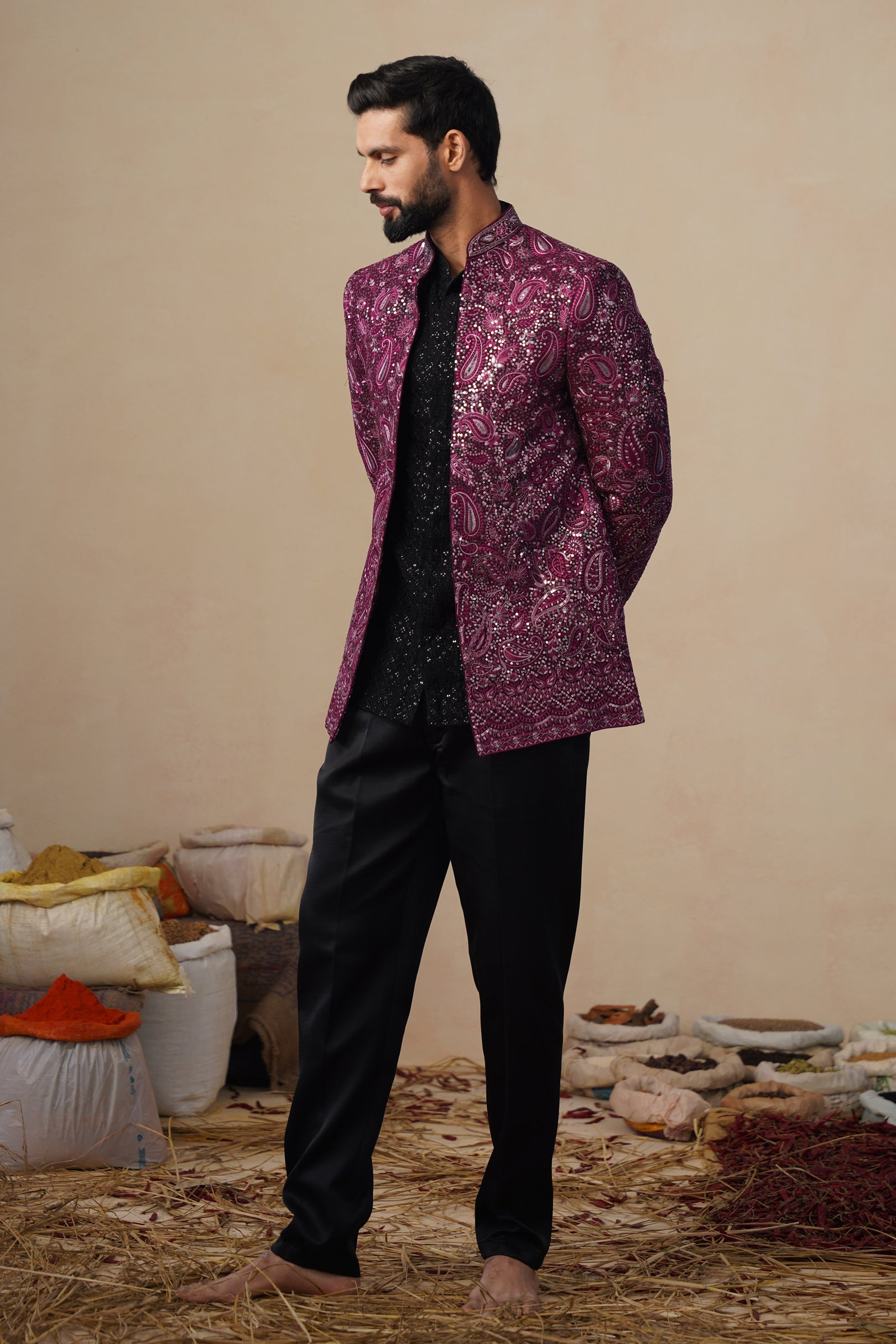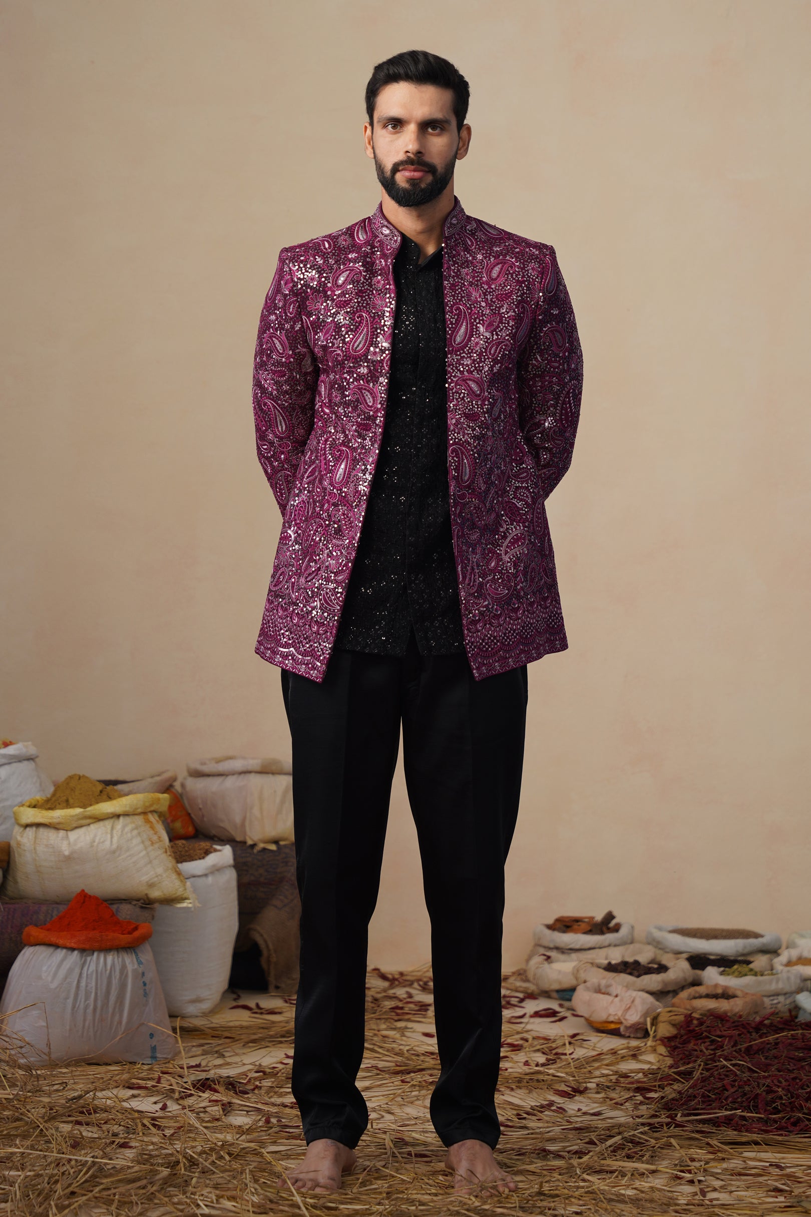 This Jodhpuri set features a structured, tailored jacket with intricate ethnic paisely embroidery giving it a refined and artistic appeal. It is styled over a shirt with subtle textural detailing, paired with classic trousers. The ensemble blends traditional craftsmanship with a modern silhouette, making it ideal for festive or formal occasions.