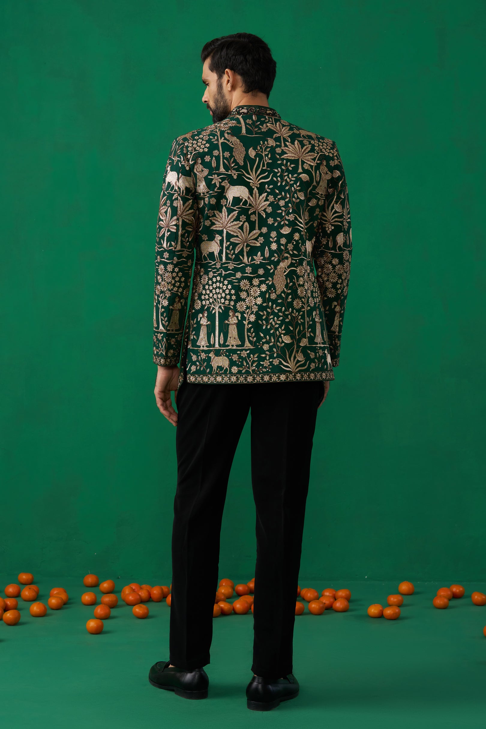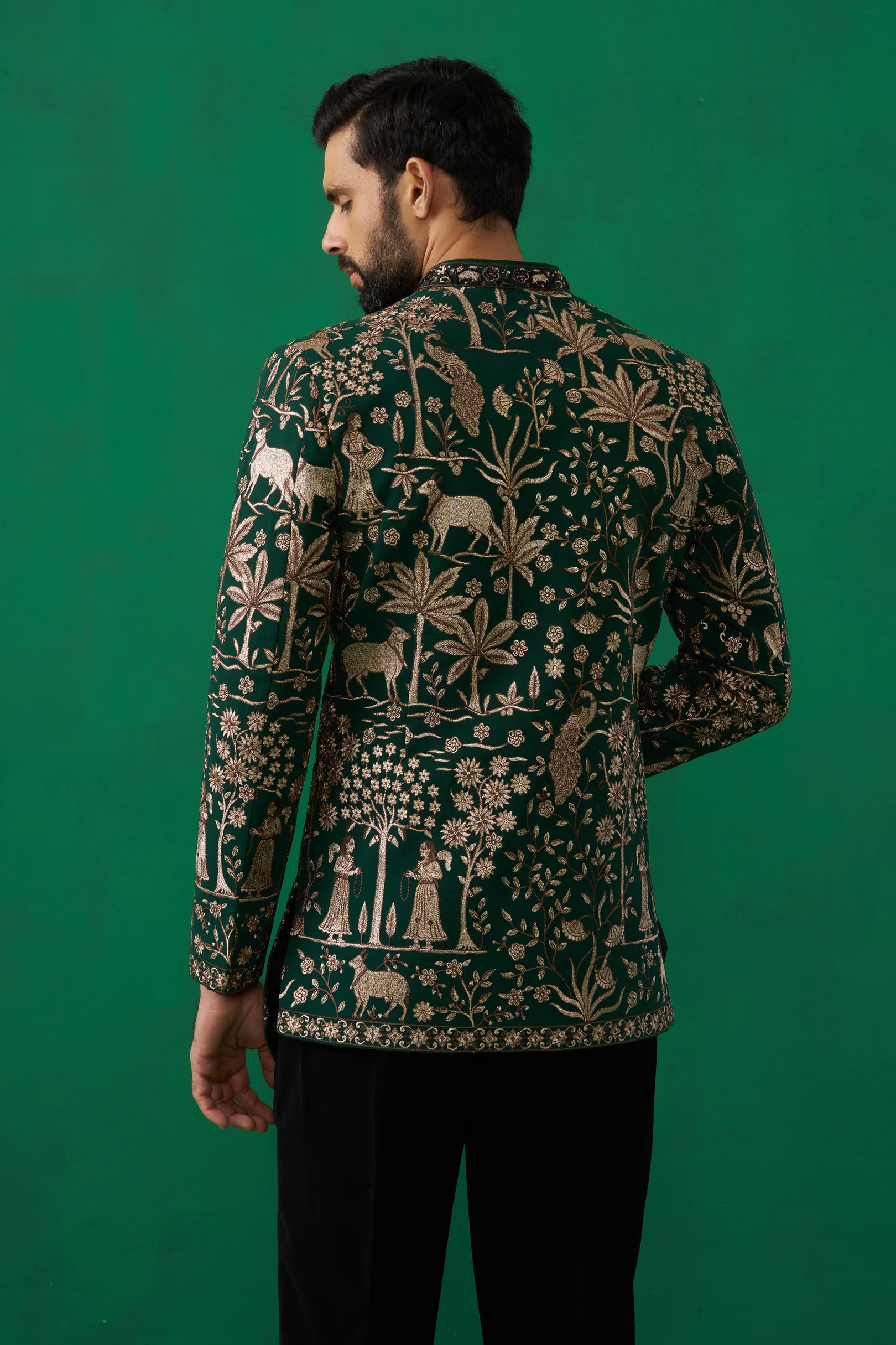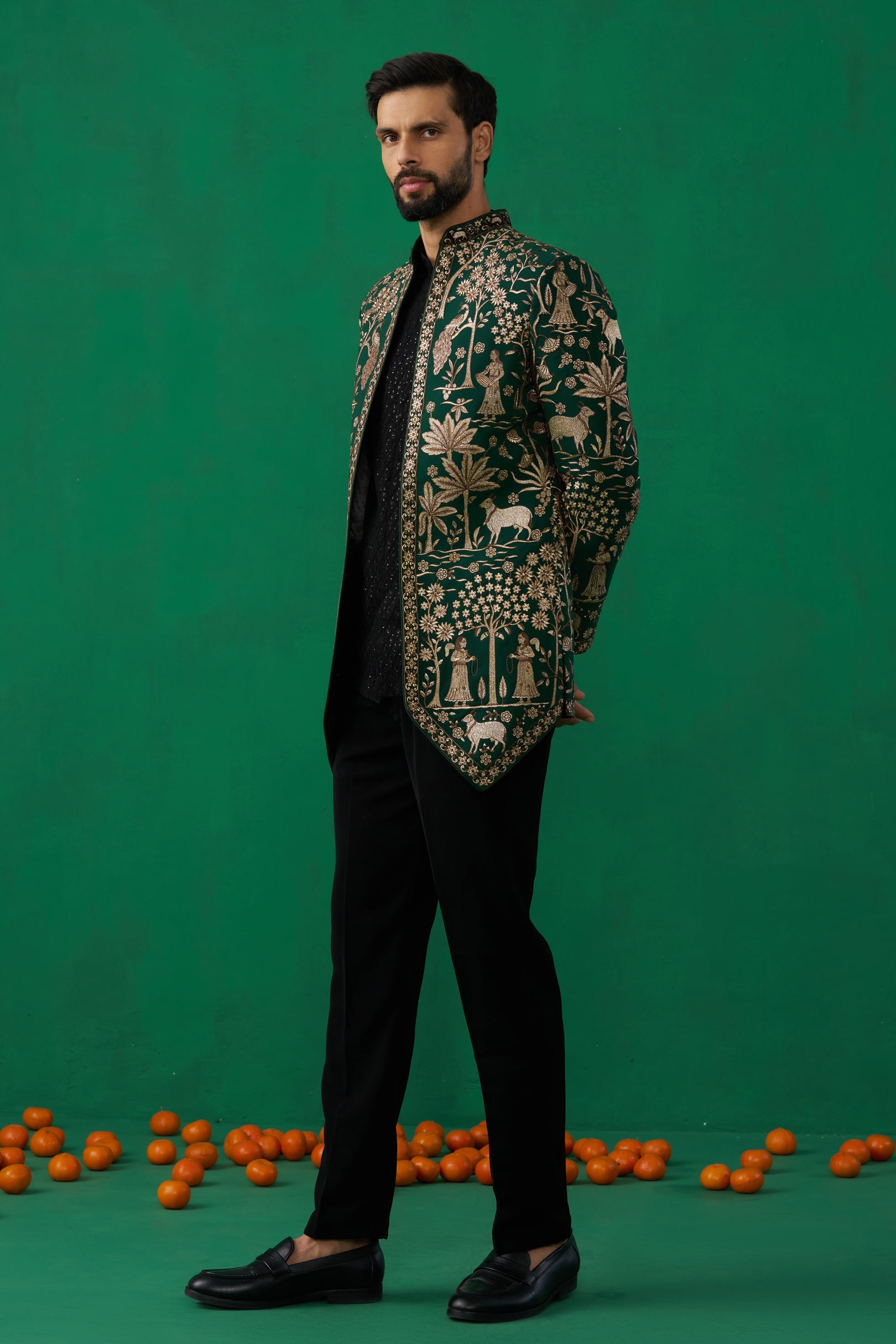 This Jodhpuri is elevated with exquisite Pichwai embroidery, featuring intricate floral and foliage motifs inspired by heritage artistry. The structured jacket with its sharp cut is paired with a sleek shirt and tailored trousers, creating a refined balance of tradition and modern sophistication, it makes a distinguished choice for evening celebrations and reception wear.