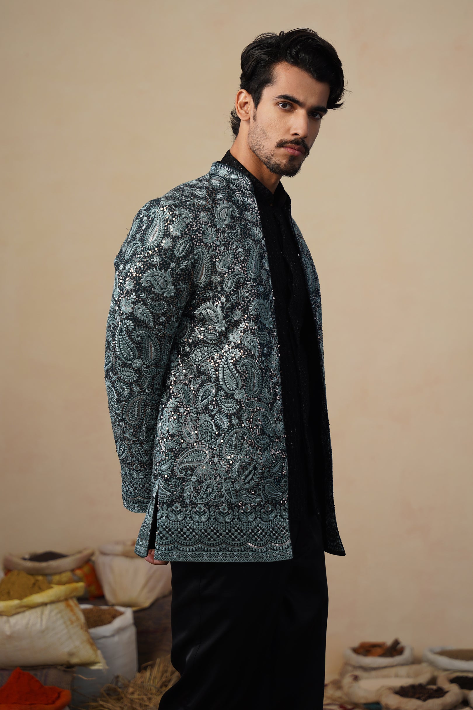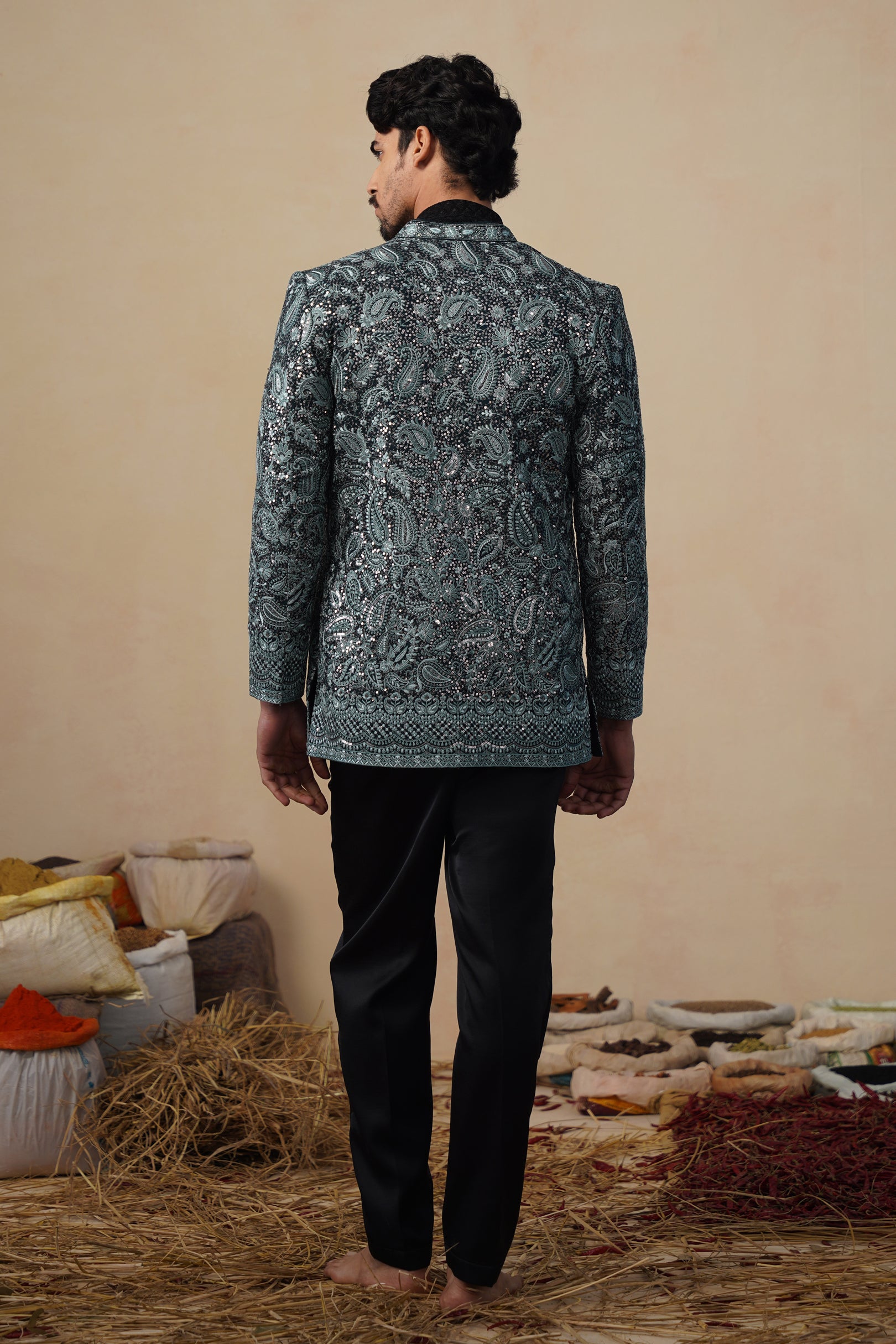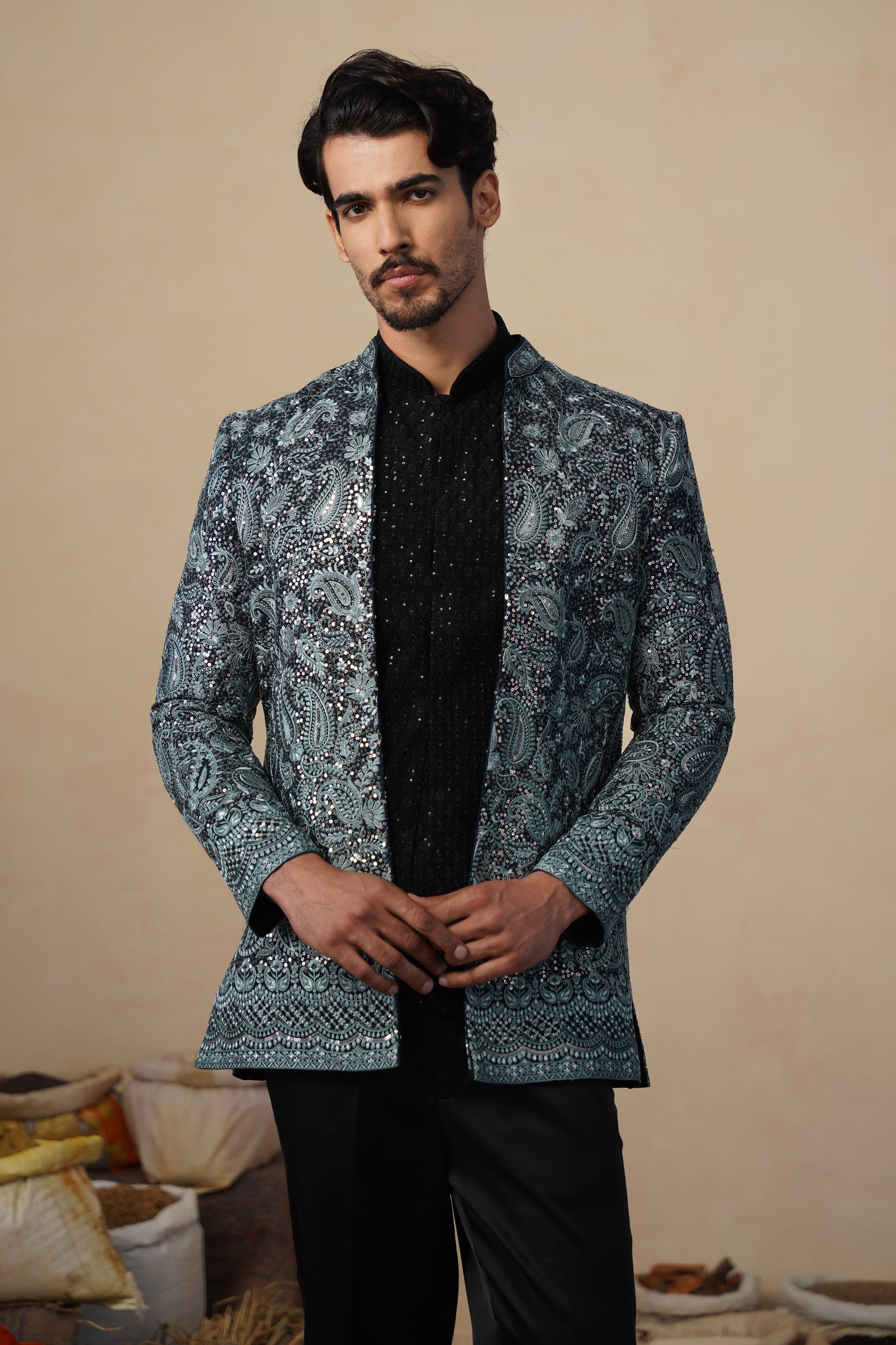 This Jodhpuri set features a structured, tailored jacket with intricate ethnic paisely embroidery giving it a refined and artistic appeal. It is styled over a shirt with subtle textural detailing, paired with classic trousers. The ensemble blends traditional craftsmanship with a modern silhouette, making it ideal for festive or formal occasions.