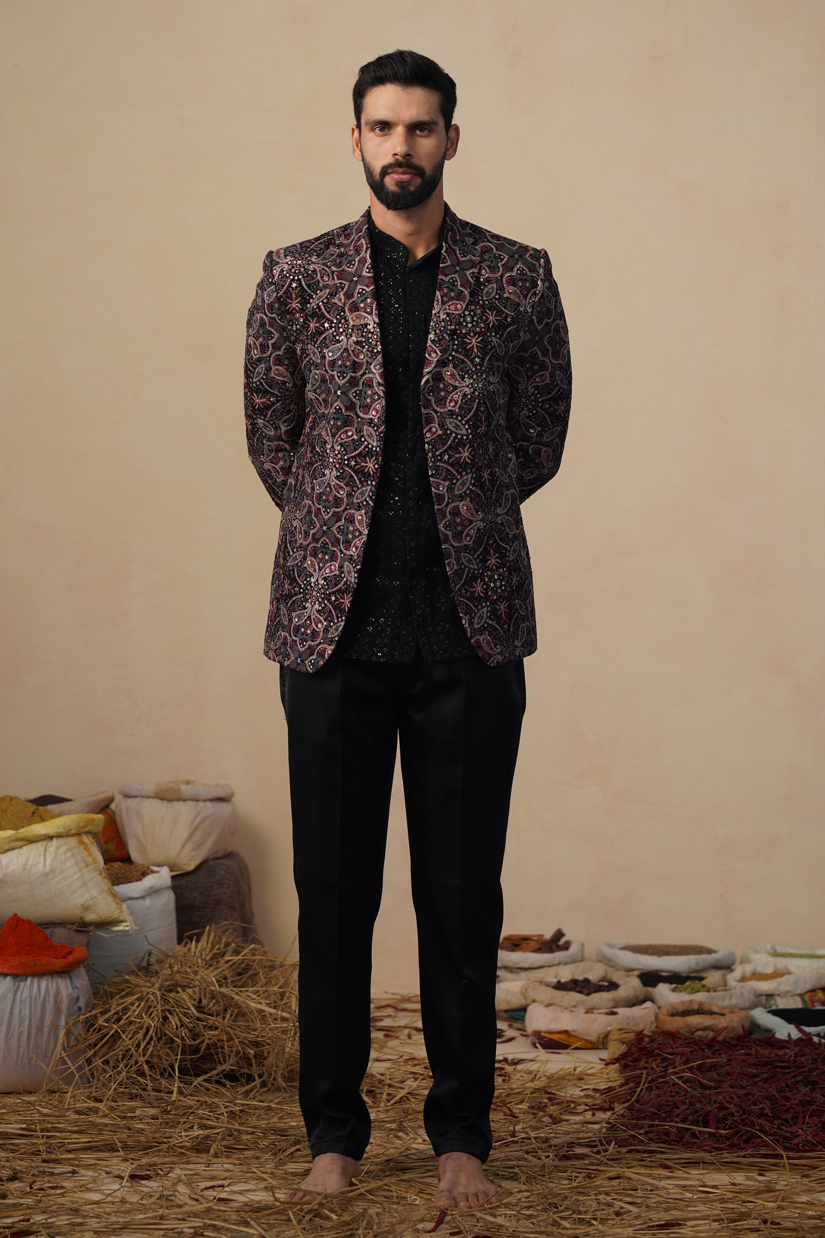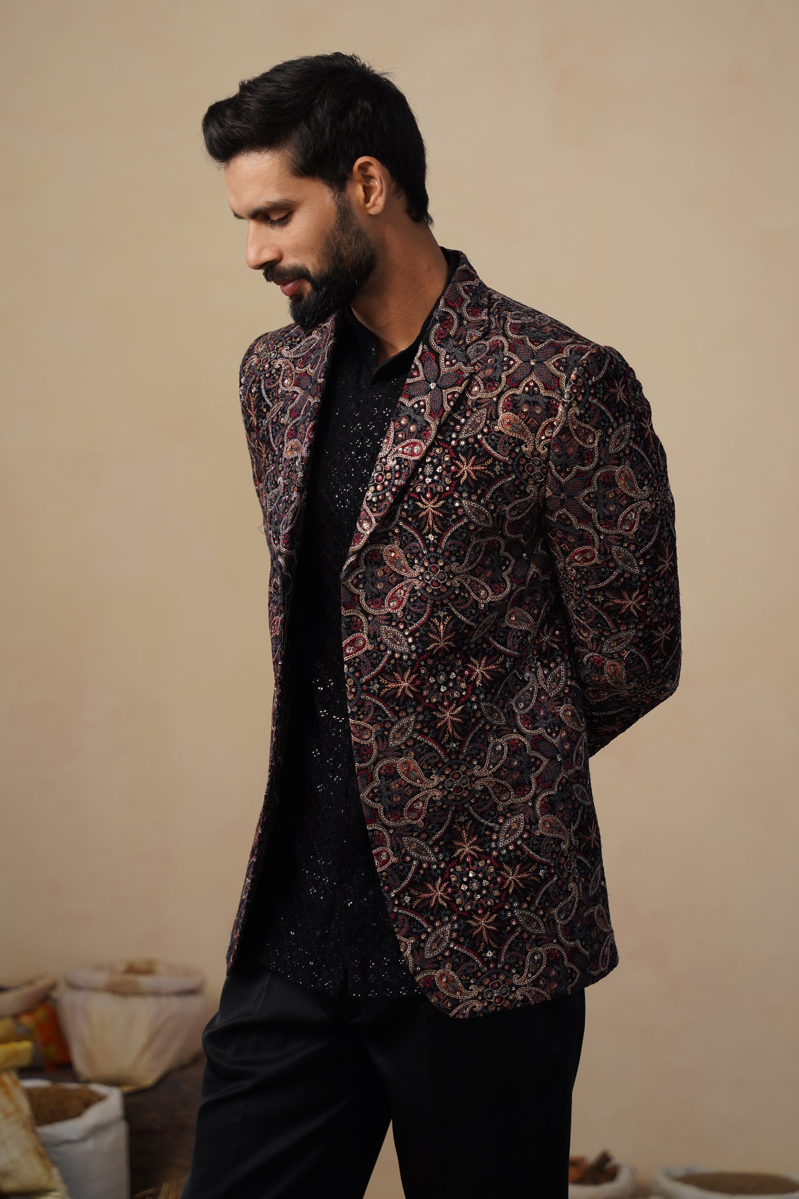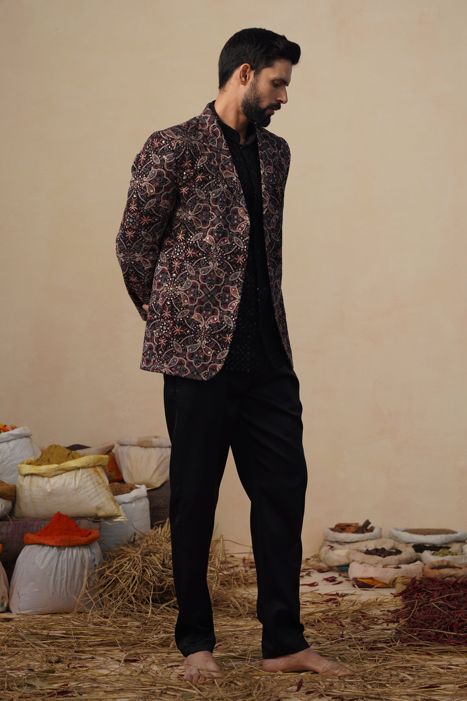 This Blazer set features a structured, tailored jacket with intricate embroidery and detailed geometric floral inspired motifs, giving it a refined and artistic appeal. It is styled over a shirt with subtle textural detailing, paired with classic trousers. The ensemble blends traditional craftsmanship with a modern silhouette, making it ideal for festive or formal occasions.