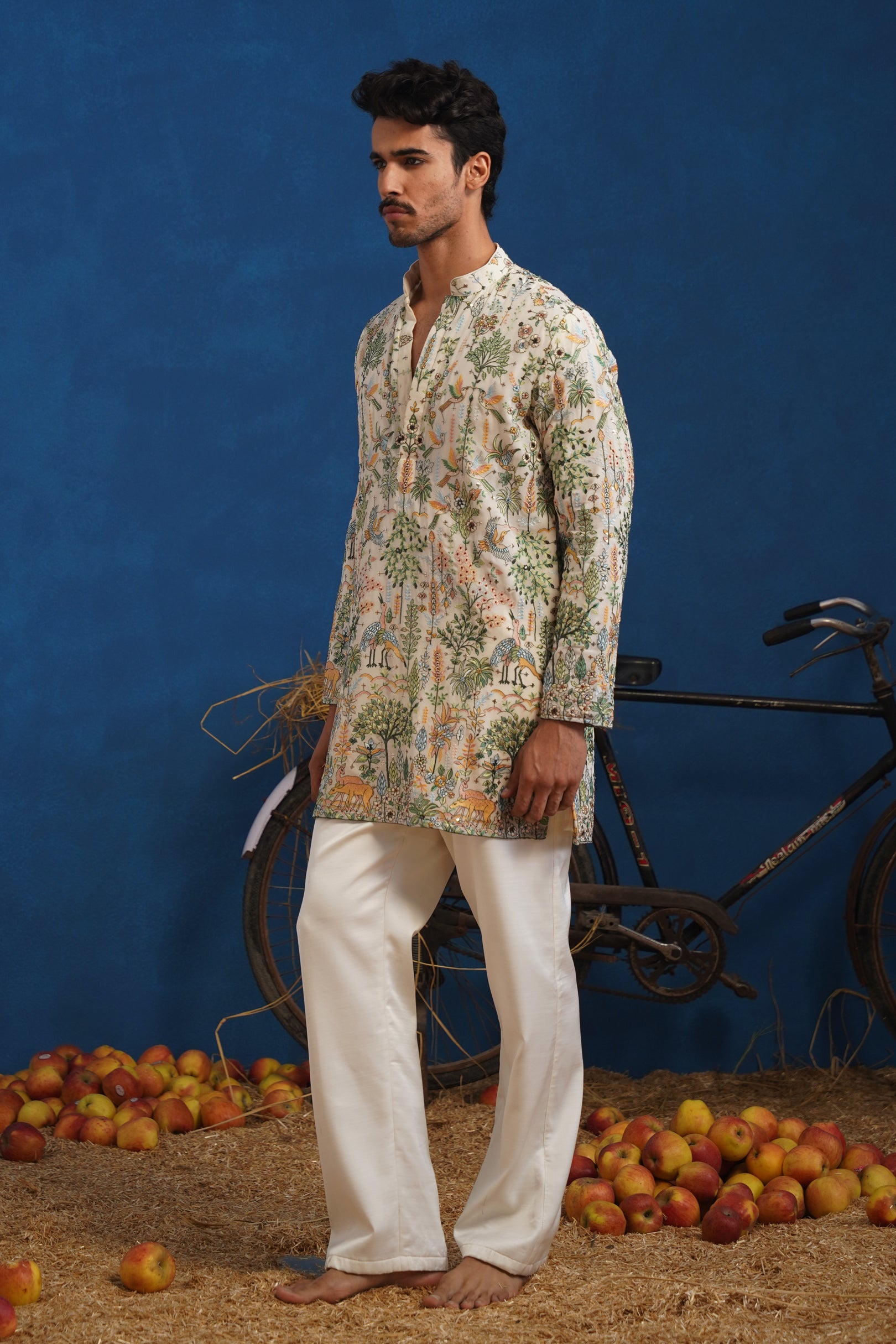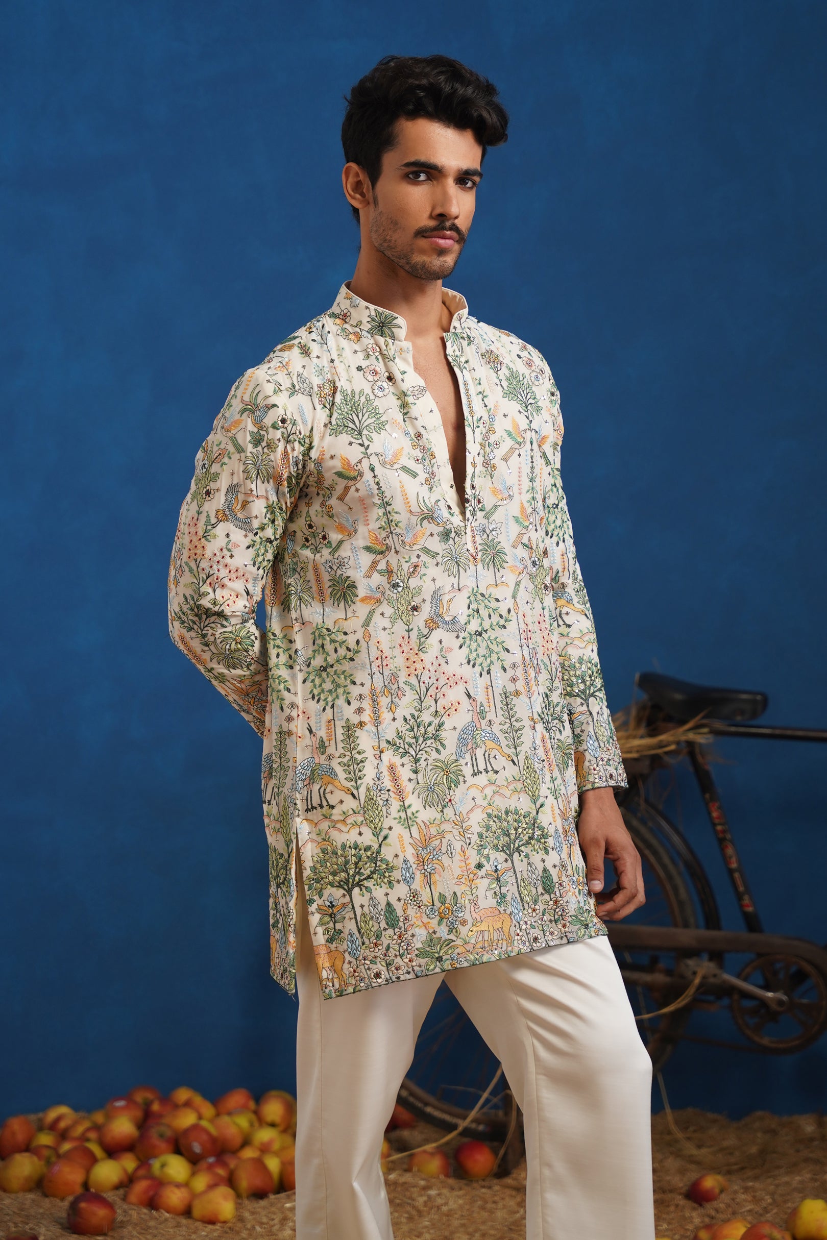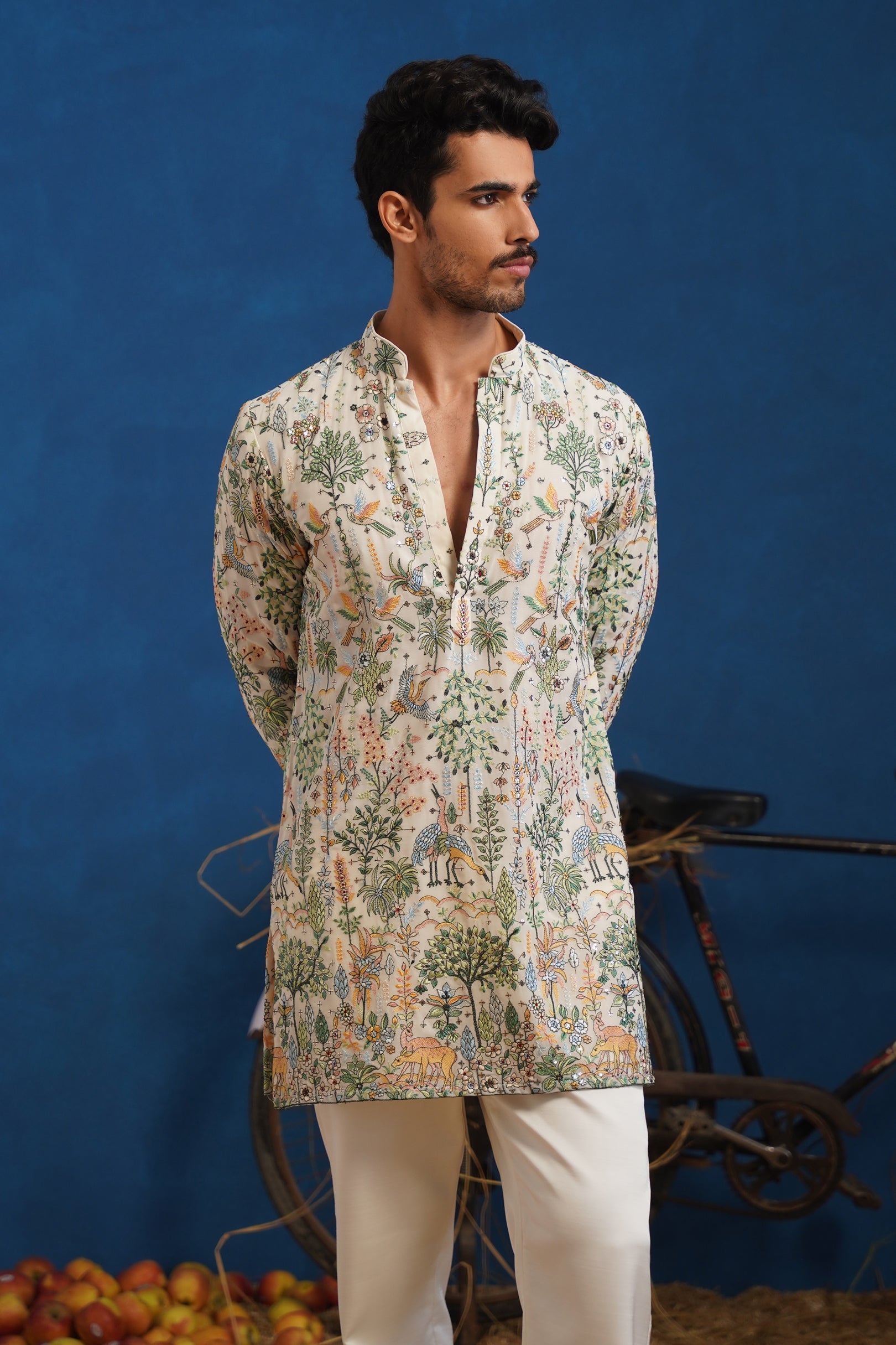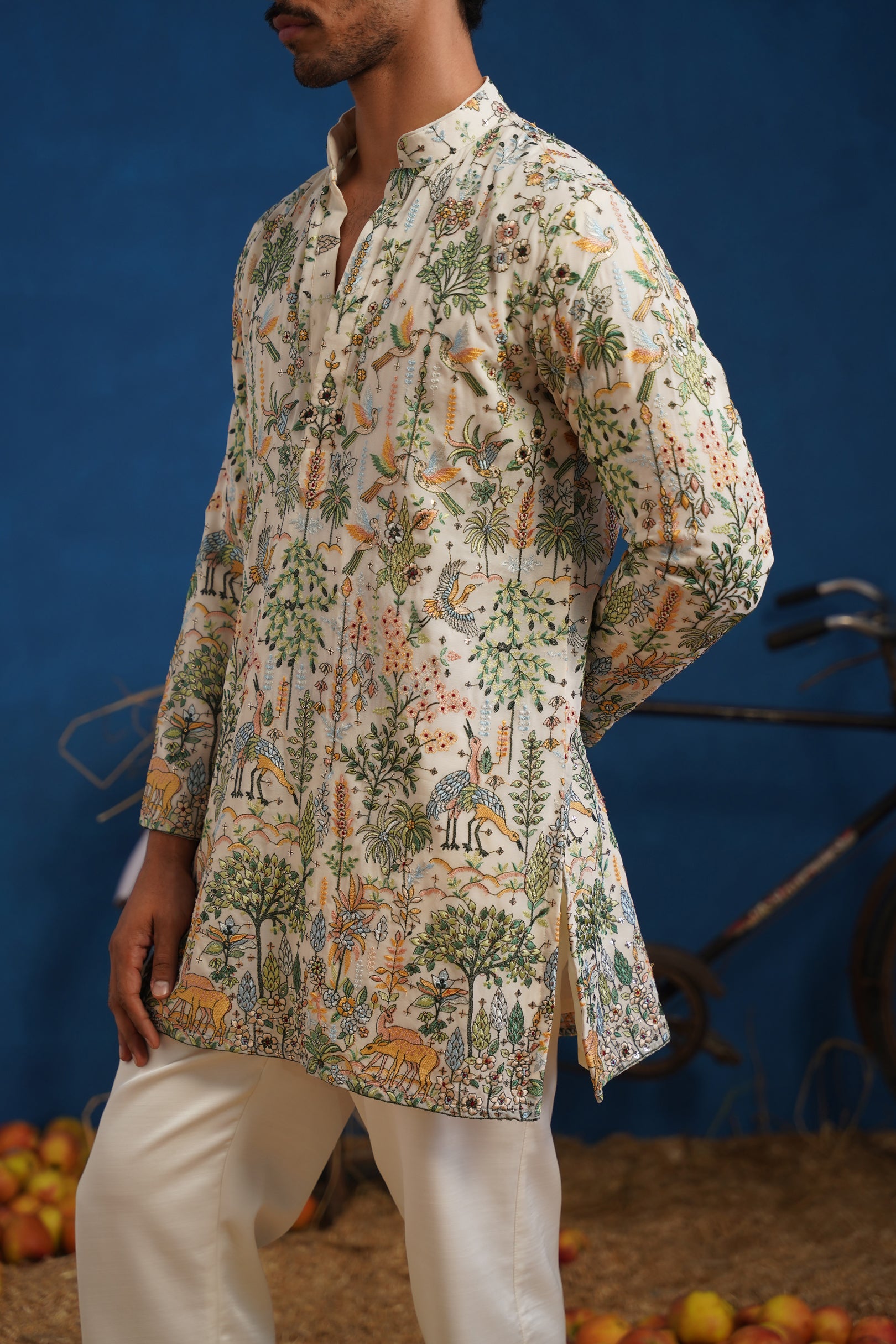 This short kurta features a structured band collar and full-length sleeves, highlighted by intricate all-over embroidery inspired by nature, rendered through fine threadwork that creates rich texture and visual depth. The detailed surface work is balanced and harmonious, enhancing the garment without overpowering its refined aesthetic. Designed to fall above the knee, the kurta offers a sharp, contemporary drape while retaining a traditional essence. Meticulously crafted, it is ideal for festive occasions, cultural gatherings, and elegant daytime celebrations, and pairs effortlessly with classic straight pants.