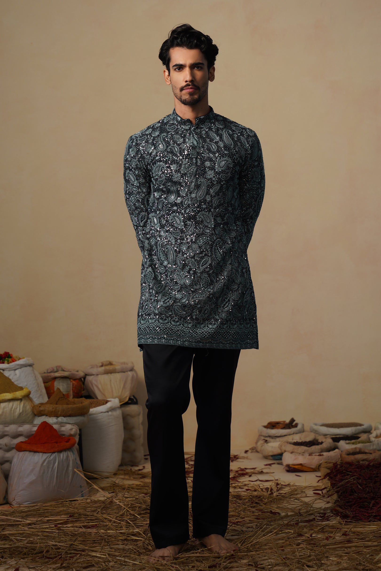 Its clean, contemporary silhouette ensures a flattering fit, while the intricate detailing adds a touch of sophistication. The look is balanced, graceful, and perfectly suited for celebratory occasions or evening gatherings. Every element comes together to create a piece that feels timeless, polished, and effortlessly stylish and pairs effortlessly with classic straight pants.