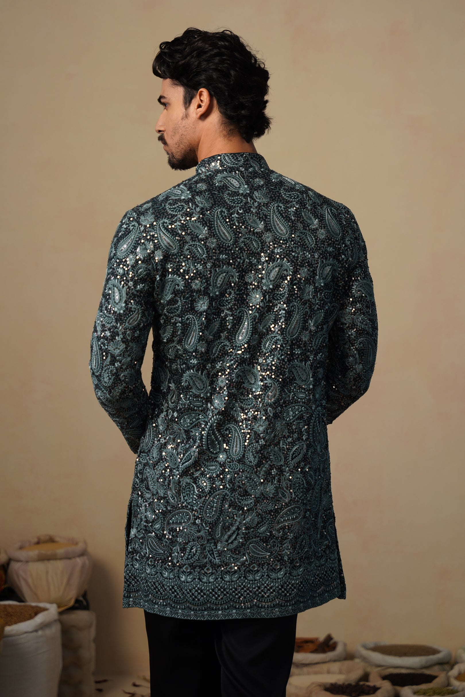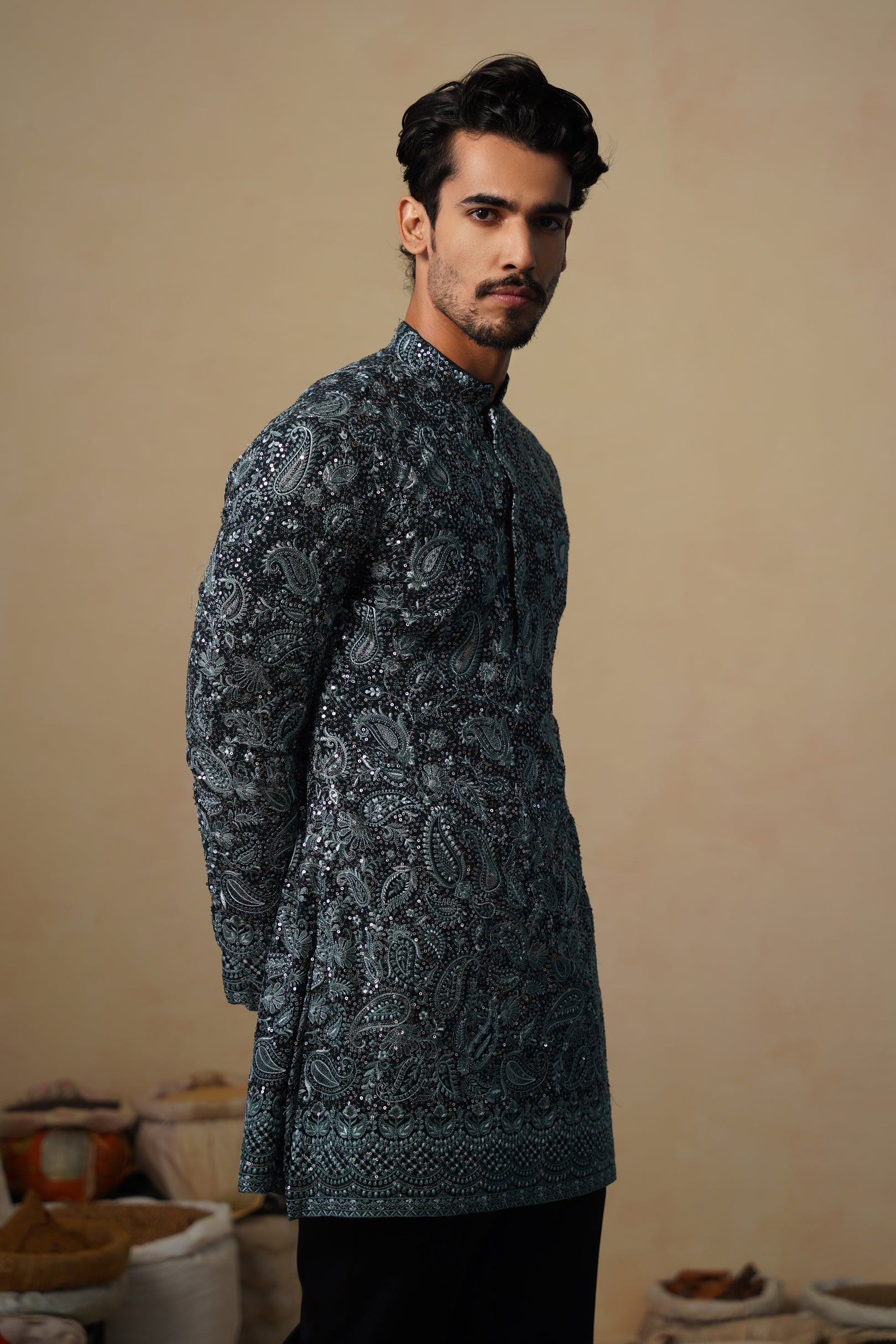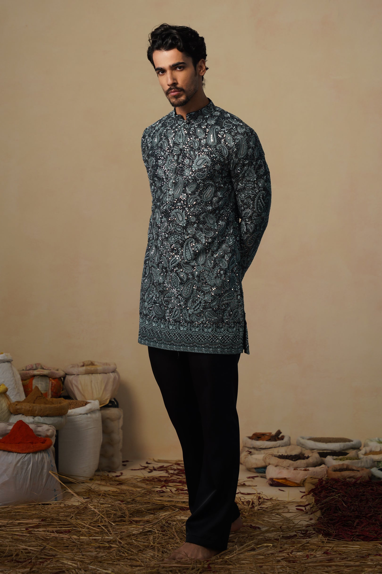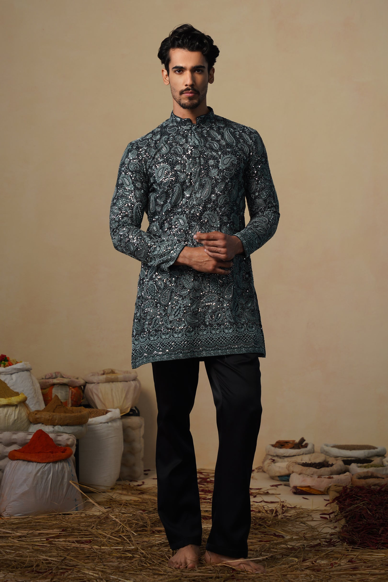 This short kurta is crafted with an emphasis on elegance and subtle richness. The surface features thoughtfully arranged patterns that add depth without overwhelming the design. Delicate handwork enhances the fabric with a gentle sheen, giving the kurta a refined, festive aura.