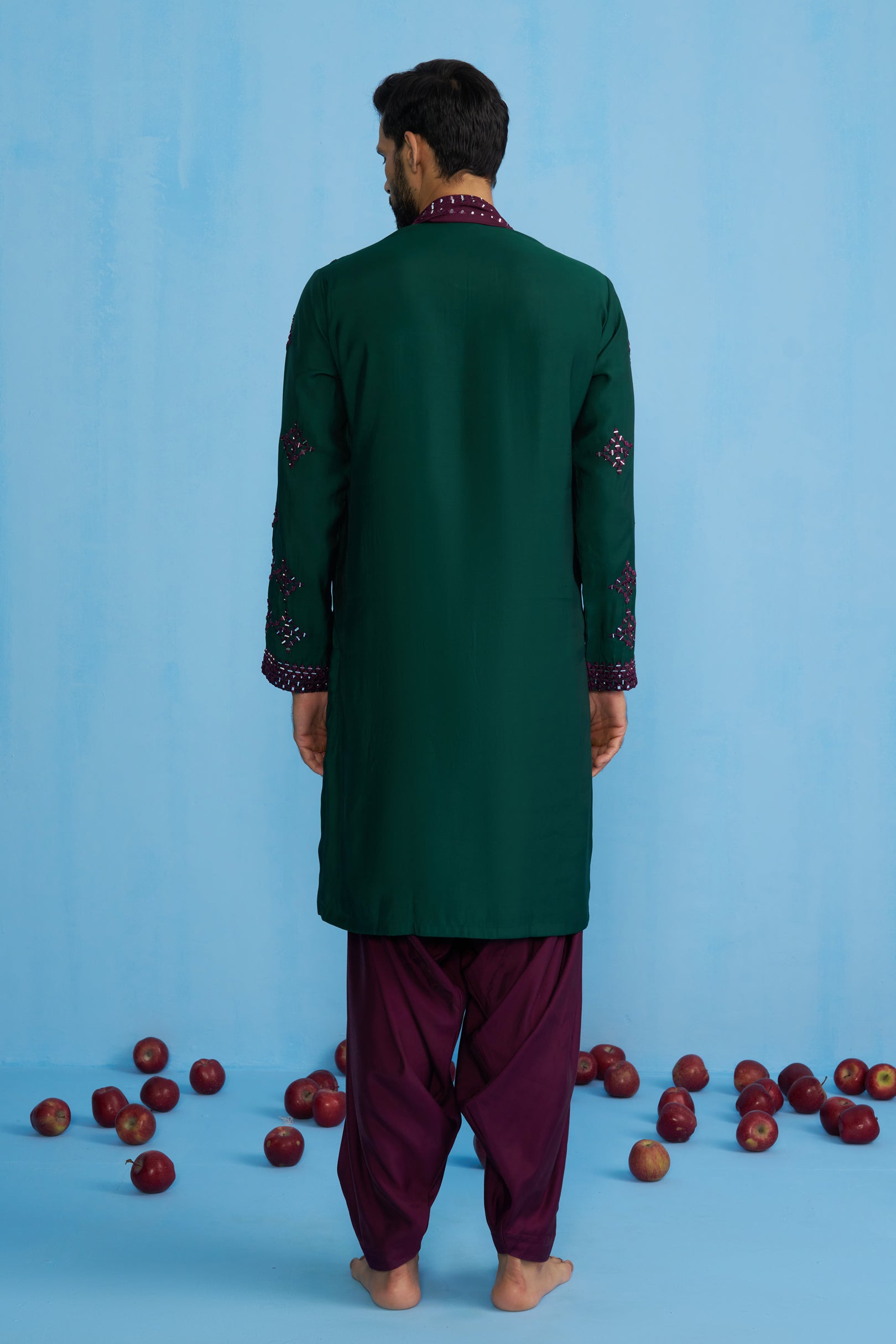This striking ensemble is perfect for festive and wedding wear. It features a long-sleeved kurta with a prominent, geometric-style embroidery and intricate mirror work detailing on the front and sleeves. Paired with the traditional drape of Patiyala trousers, the outfit is completed with a slim stole. The stole itself is a statement piece, densely adorned with a parallel arrangement of mirror work, creating a linear, modern accent that stands out against the rich texture of the kurta.
