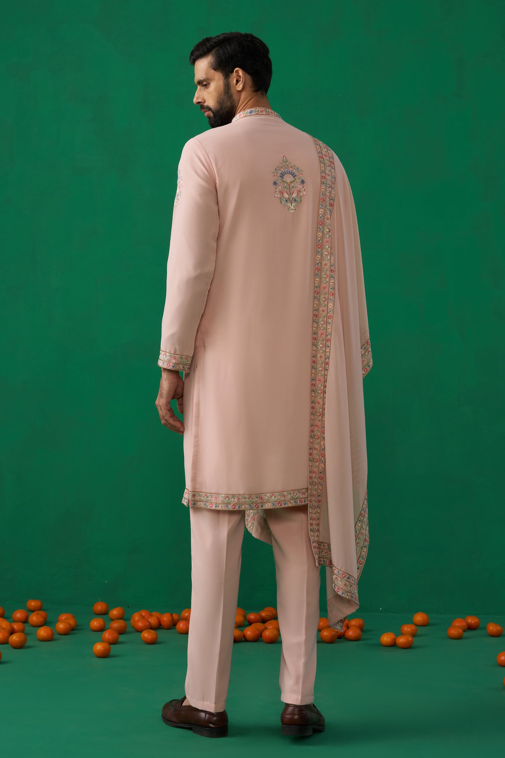 This kurta set consists of a long-sleeved kurta with a detailed floral and deer embroidery pattern on the front, extending from the neckline down to the chest. The bottom hem of the kurta is also embellished with a narrow, repeating embroidered border. The sleeves feature small, scattered floral motifs.