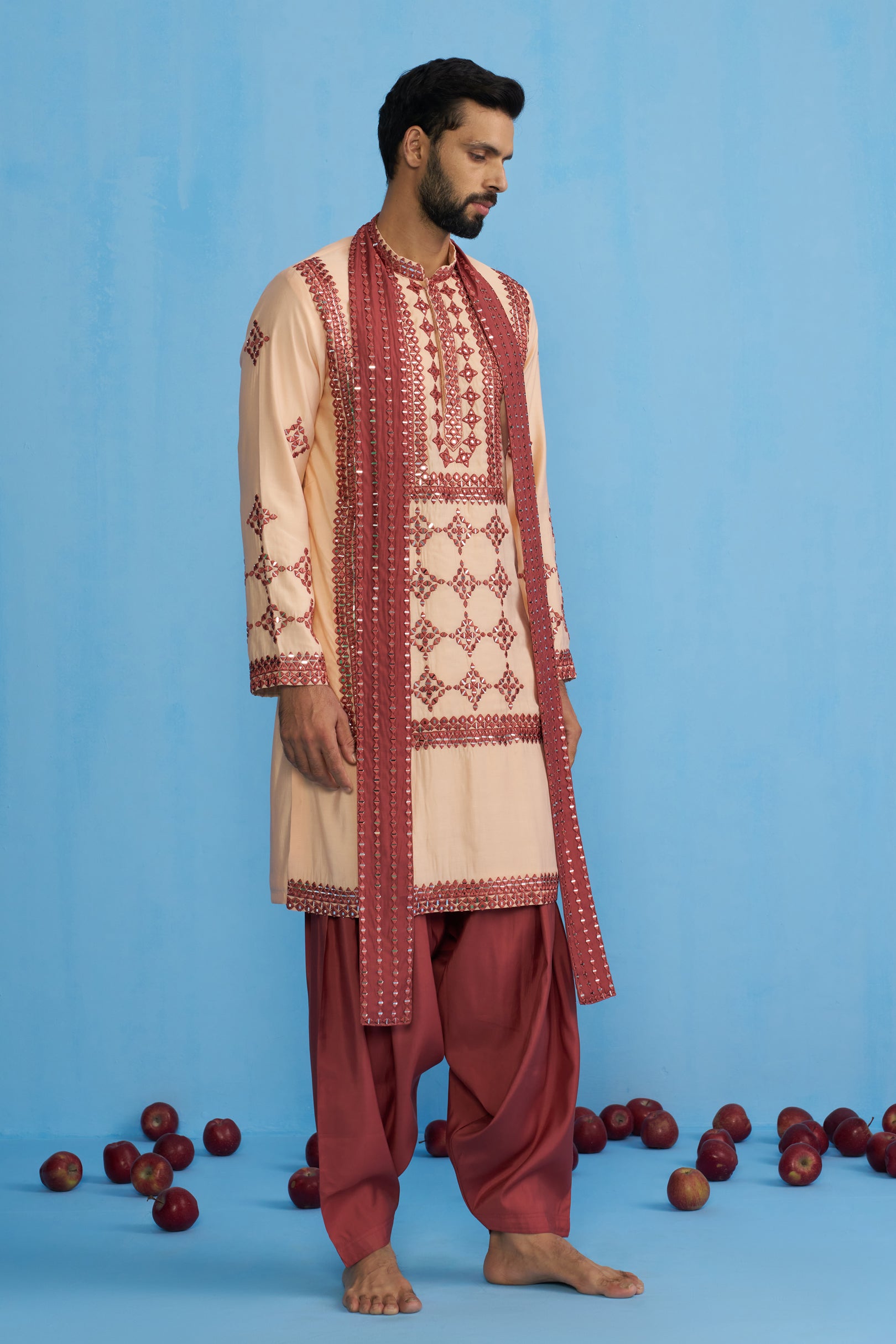 This striking ensemble is perfect for festive and wedding wear. It features a long-sleeved kurta with a prominent, geometric-style embroidery and intricate mirror work detailing on the front and sleeves. Paired with the traditional drape of Patiyala trousers, the outfit is completed with a slim stole. The stole itself is a statement piece, densely adorned with a parallel arrangement of mirror work, creating a linear, modern accent that stands out against the rich texture of the kurta.