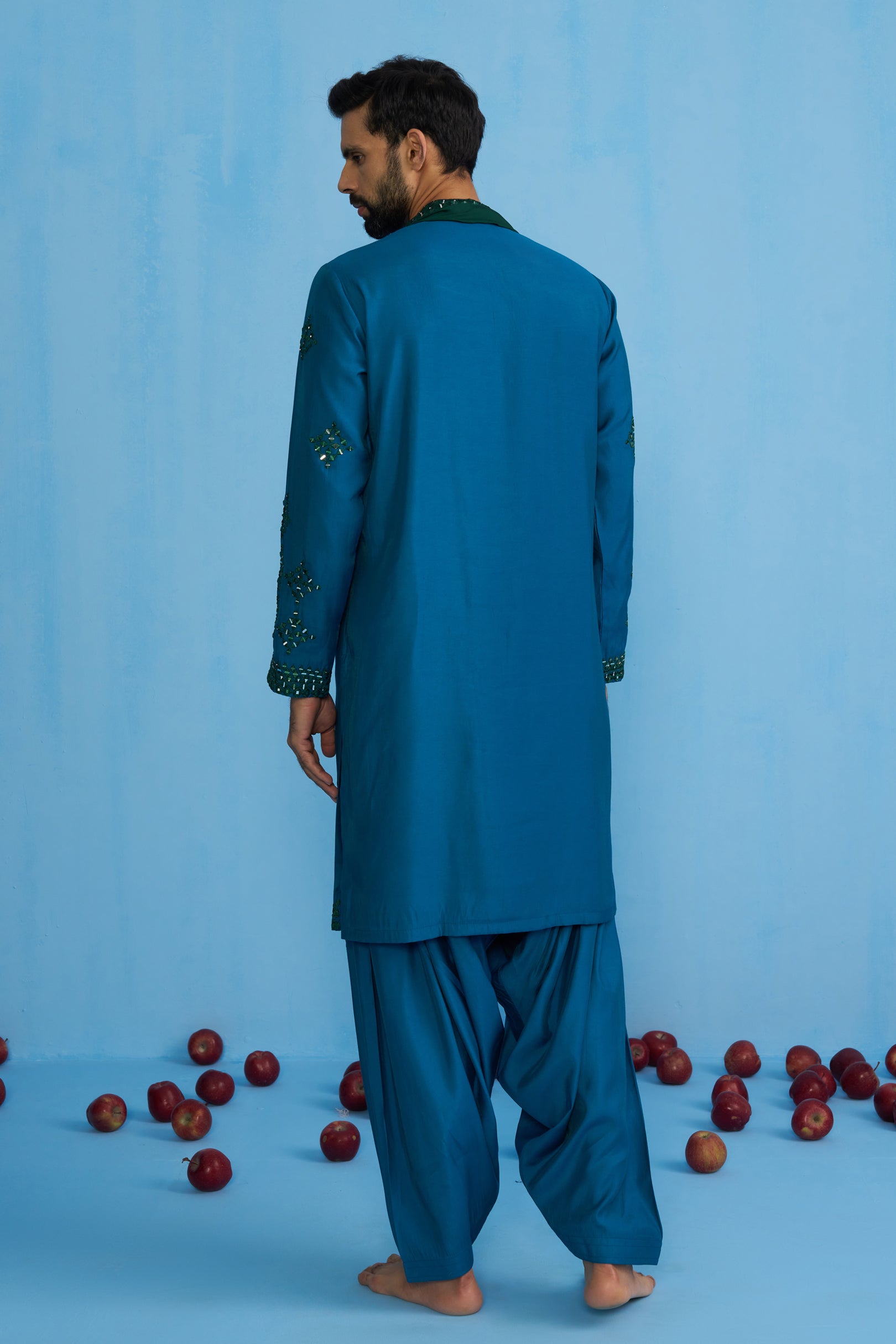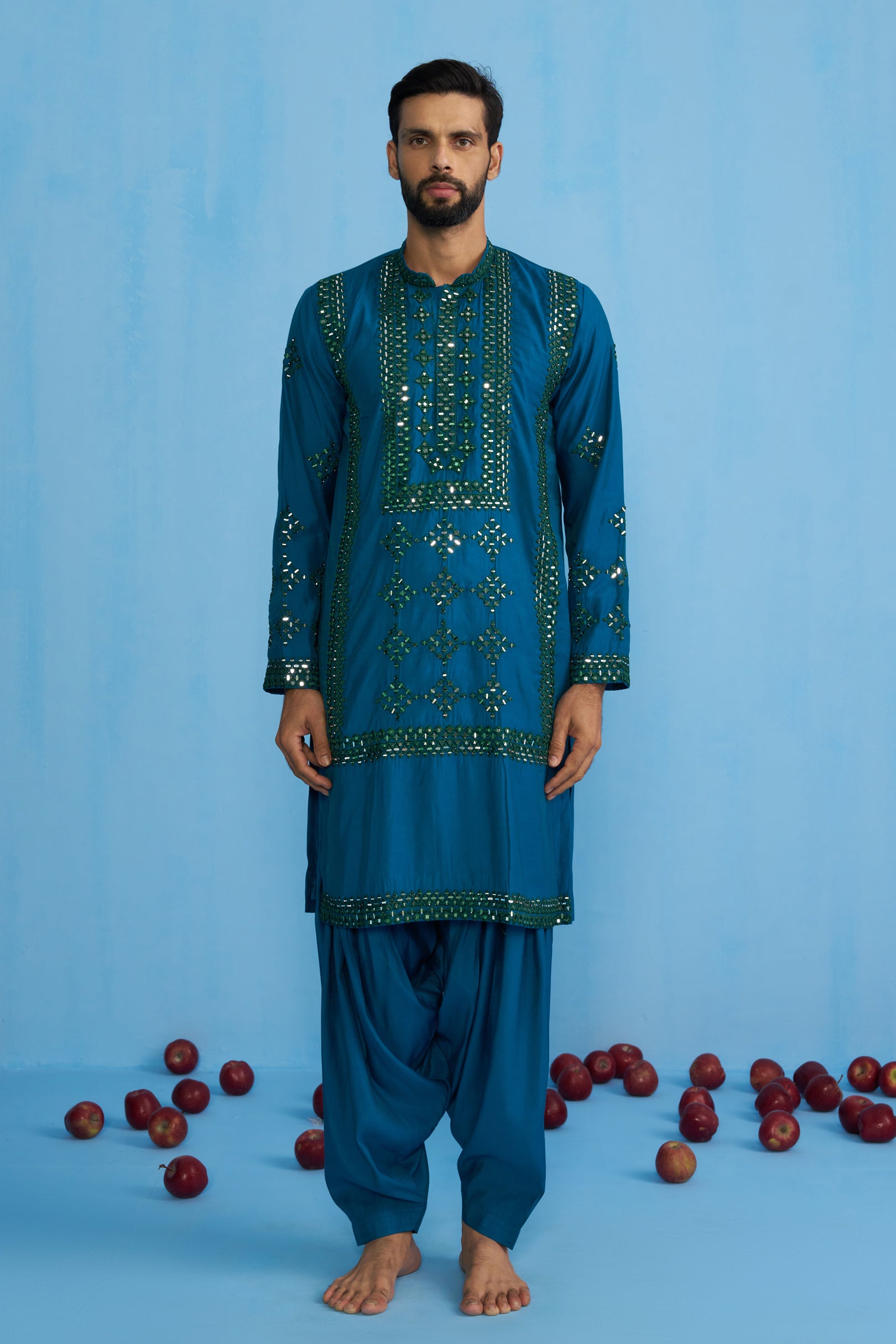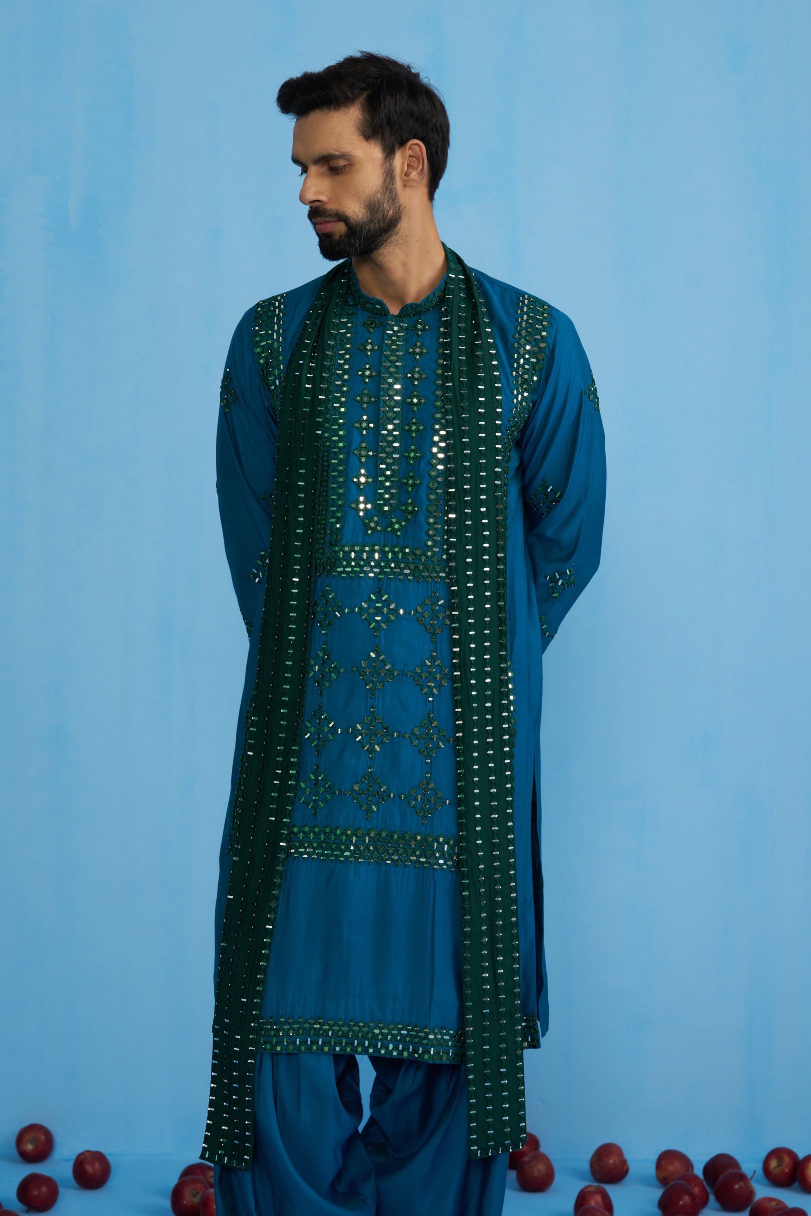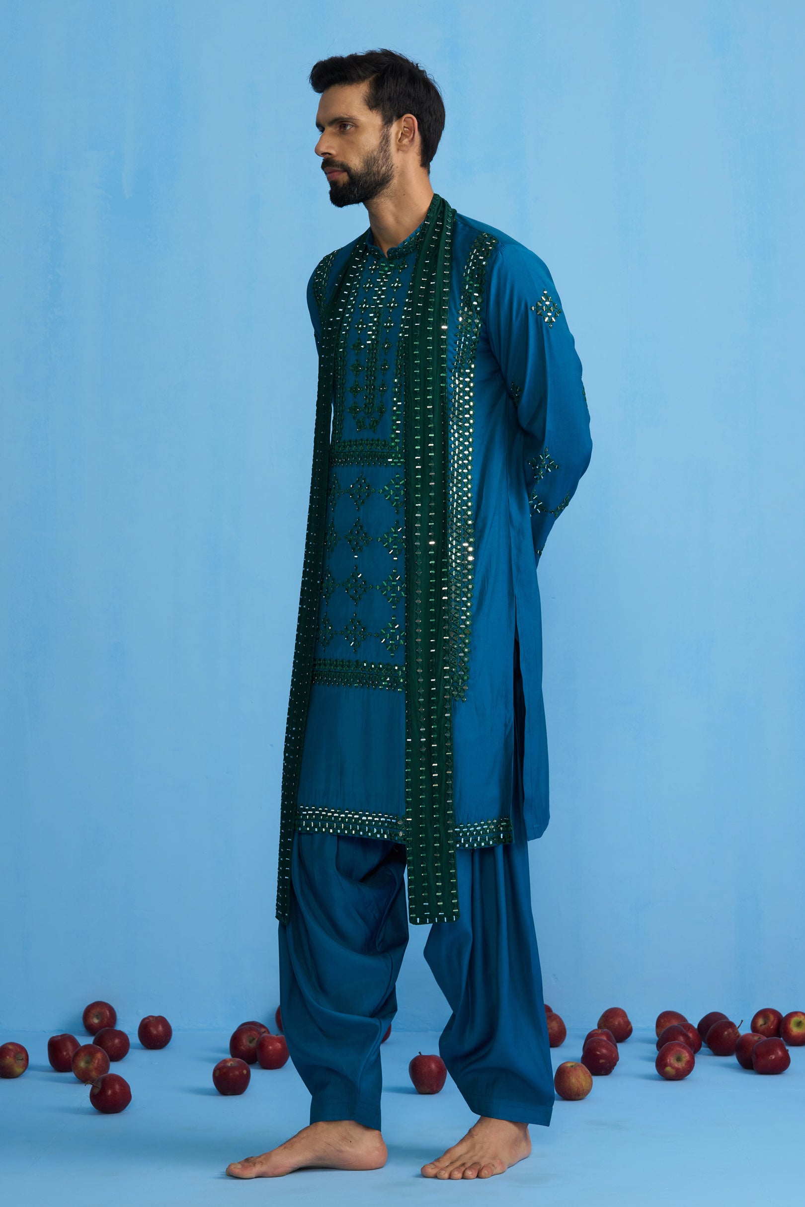 This striking ensemble is perfect for festive and wedding wear. It features a long-sleeved kurta with a prominent, geometric-style embroidery and intricate mirror work detailing on the front and sleeves. Paired with the traditional drape of Patiyala trousers, the outfit is completed with a slim stole. The stole itself is a statement piece, densely adorned with a parallel arrangement of mirror work, creating a linear, modern accent that stands out against the rich texture of the kurta.