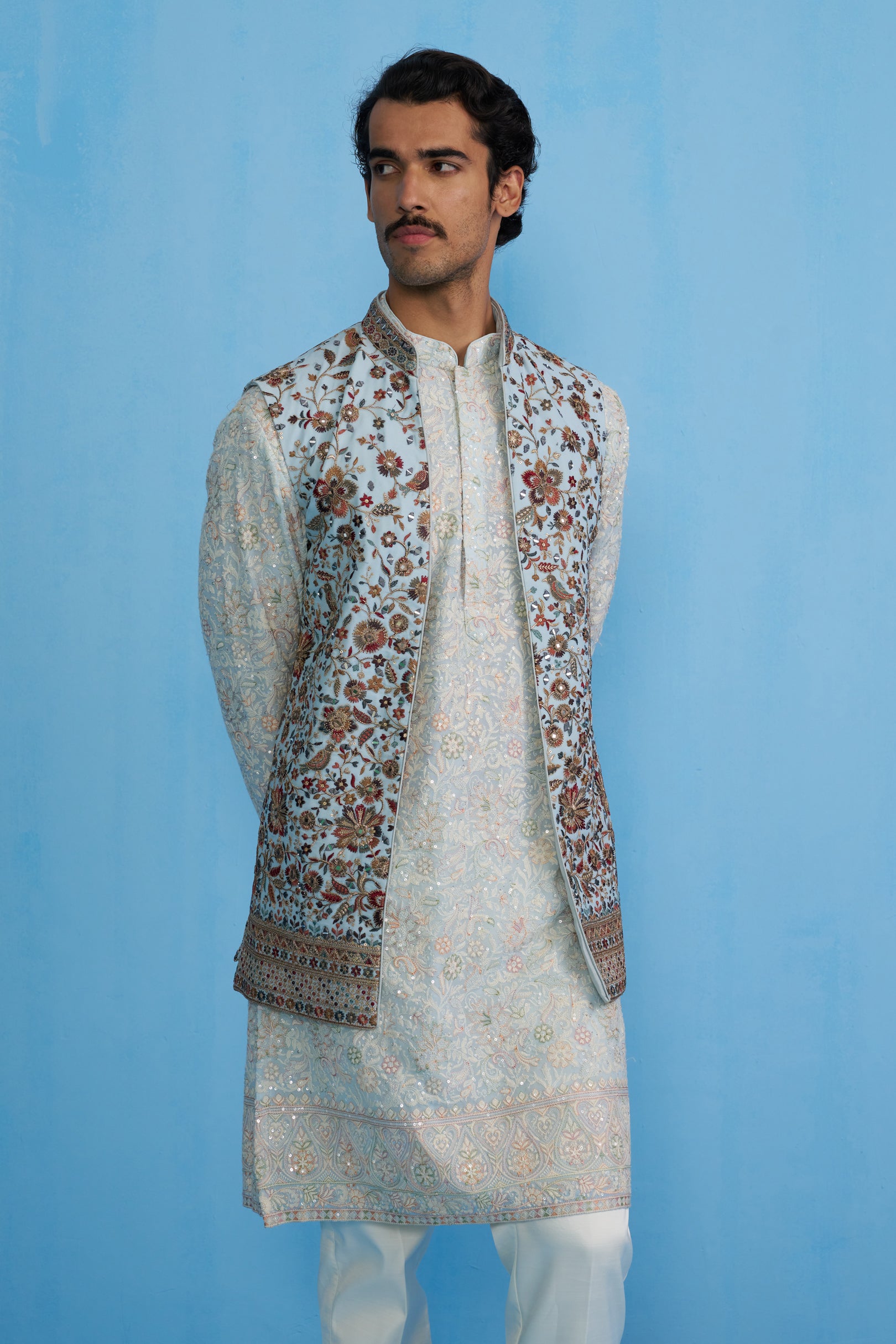 This striking ensemble is an excellent choice for festivals and day wedding. It features a long-sleeved kurta with a textured, repeating pattern. The kurta is paired with narrow-cut trousers. The most notable element is the sleeveless jacket worn over the kurta, which is adorned with elaborate rose and floral embroidery. The intricate and ornate detailing of the jacket creates a bold contrast against the textured base, offering a sophisticated and visually rich look.