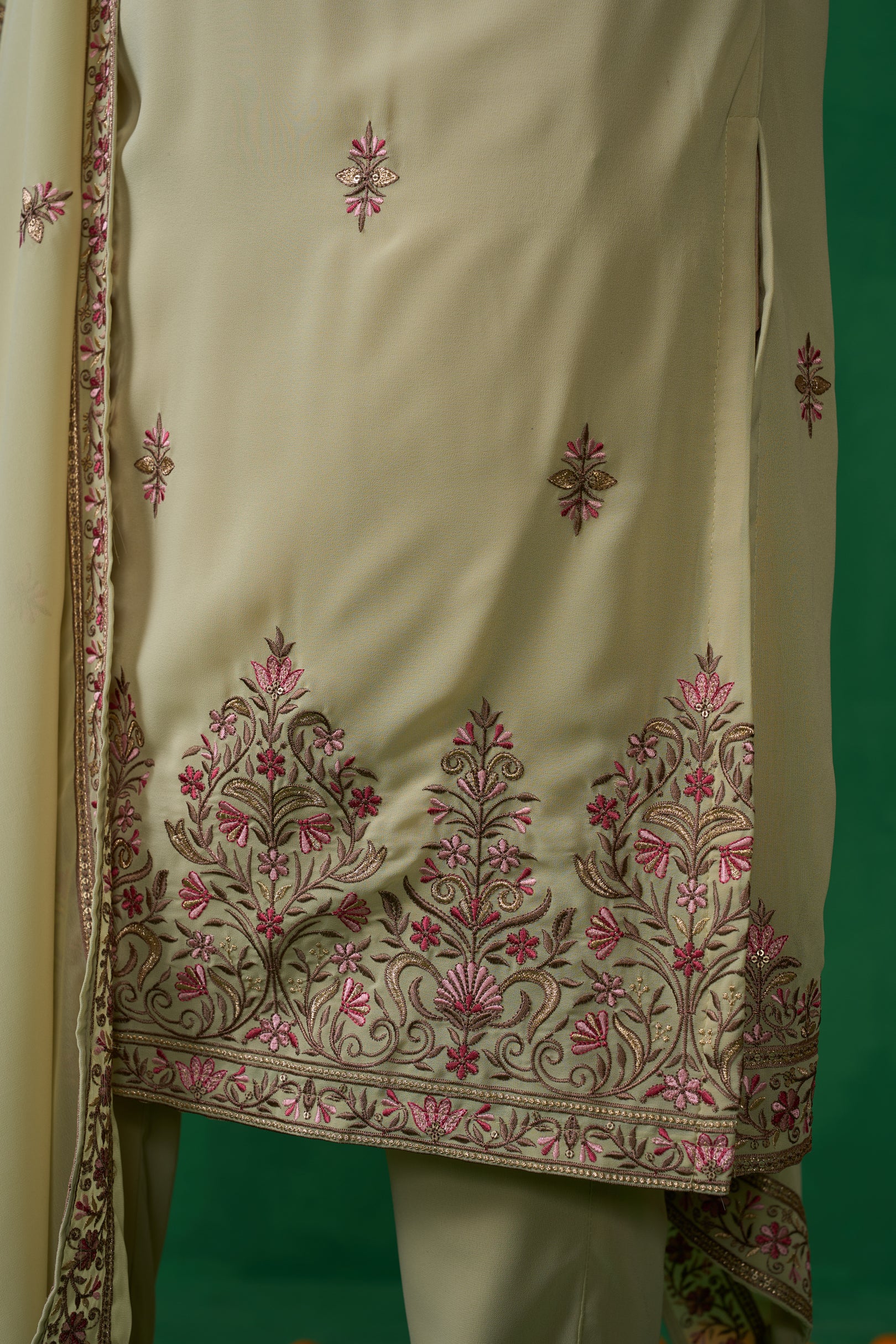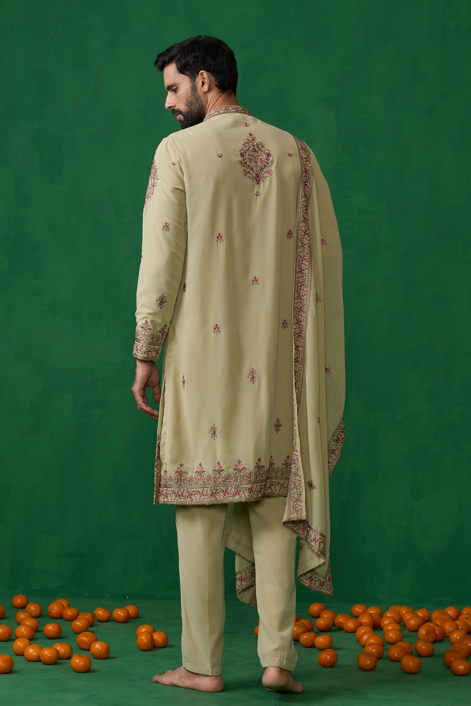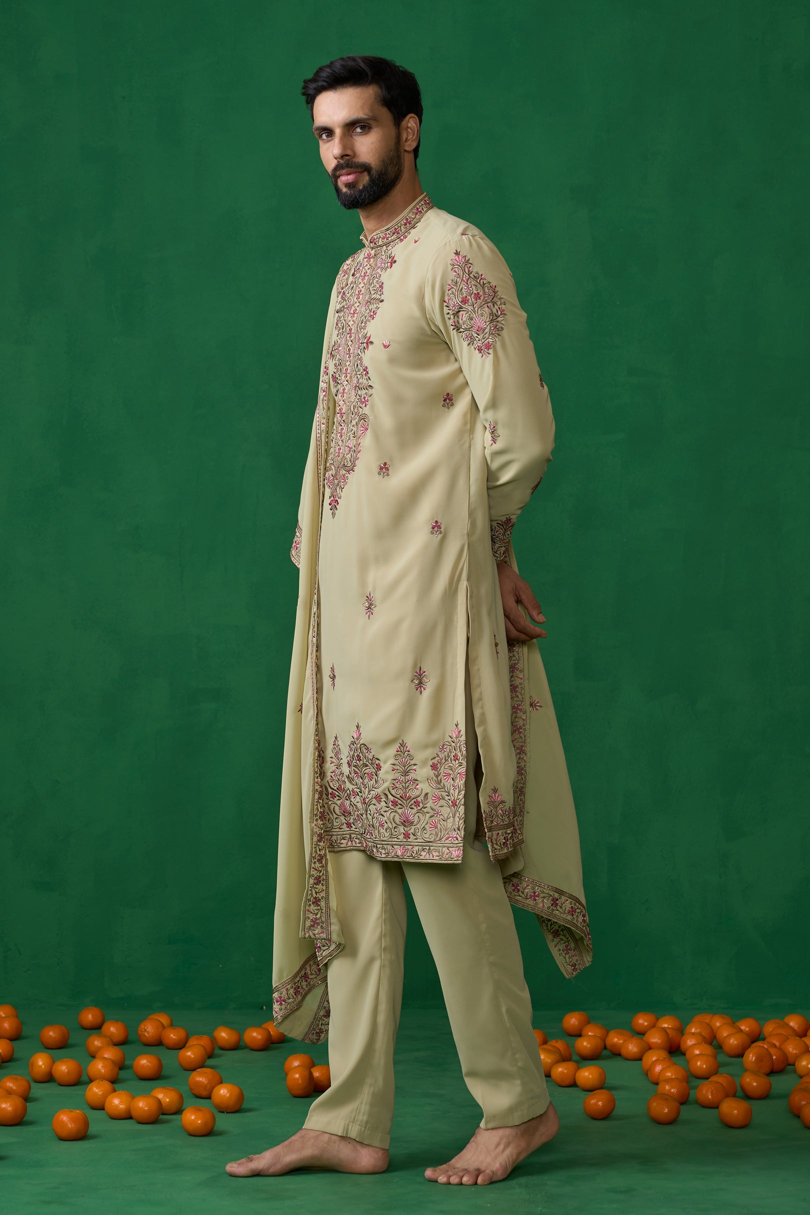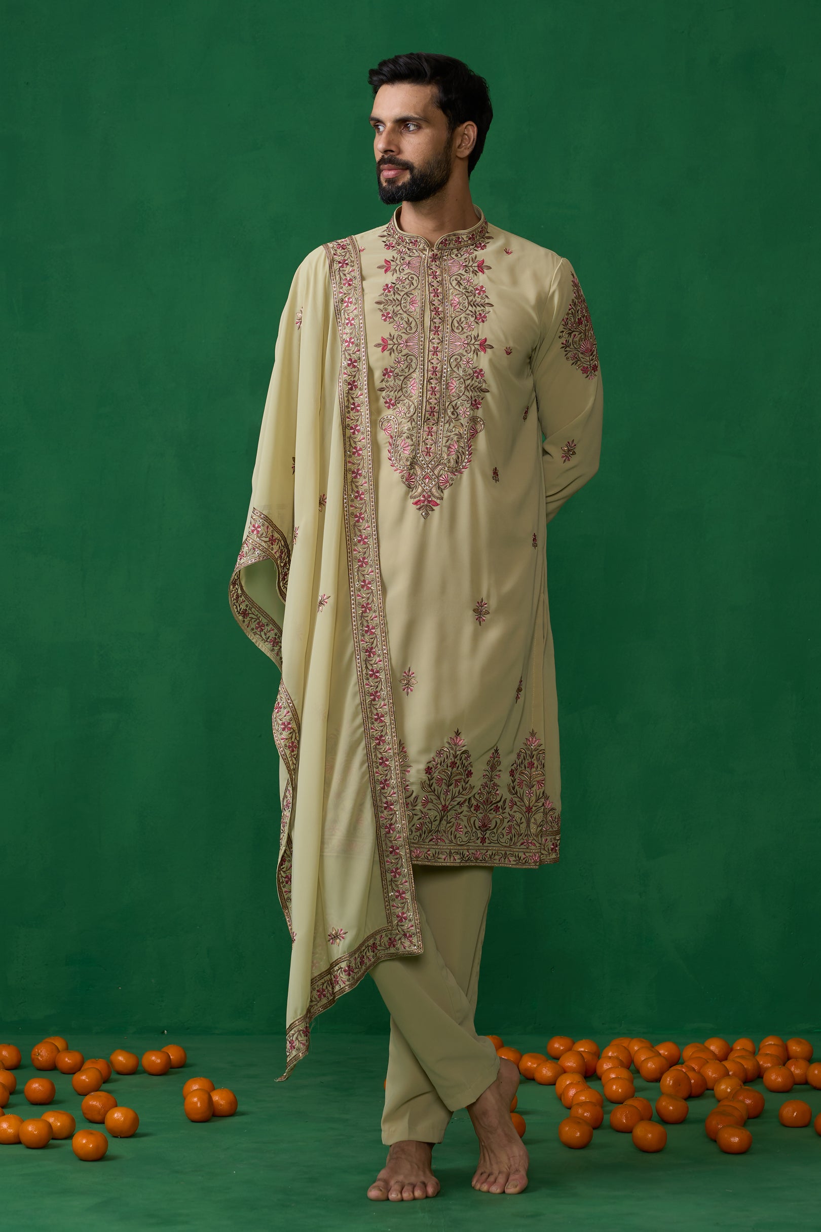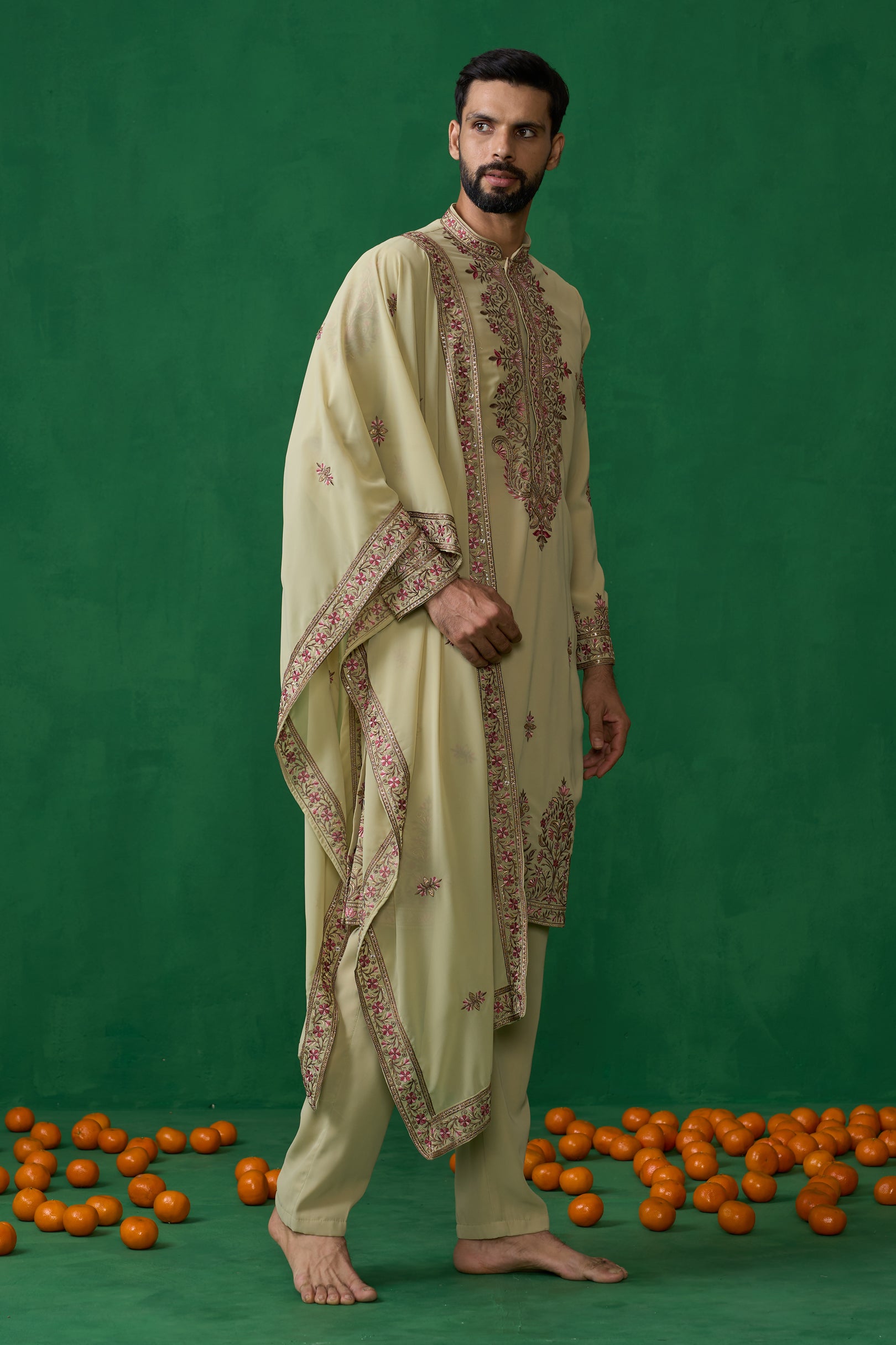 This kurta set features a long-sleeved kurta with elaborate, decorative embroidery on the front, centered around the placket and extending vertically down the garment. The intricate design includes floral and vine-like motifs. Small, scattered embroidered details are also visible on the sleeves and throughout the body of the kurta. The bottom hem is finished with a detailed embroidered border. The set includes straight-cut trousers and a matching dupatta with a wide, ornate, embroidered border. The entire ensemble is suitable for festive and wedding wear.