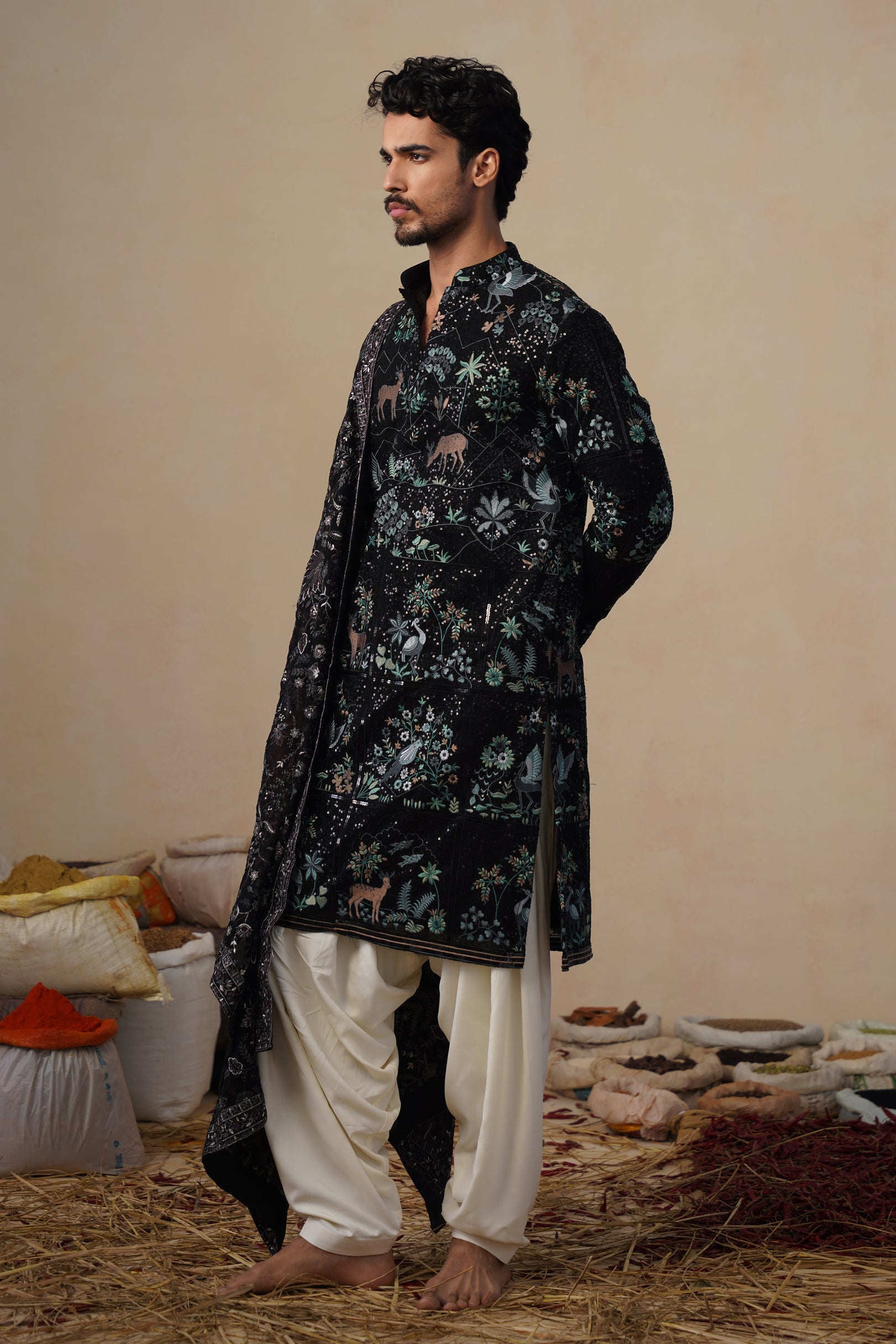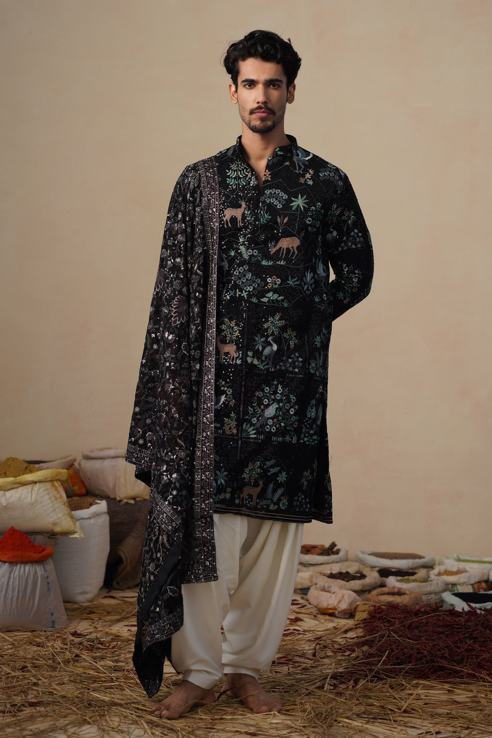 This kurta set is a stunning ensemble that perfectly blends traditional artistry with a modern silhouette. The central piece is a long kurta adorned with intricate bird and deer motifs,These motifs are meticulously embroidered across the entire kurta, creating a rich and detailed surface. The set includes a graceful, patiyala bottom, offering a classic silhouette. A contrasting stole with a complementary pattern is draped over the shoulder, adding another layer of texture and visual interest. This outfit is a beautiful representation of cultural heritage, making it an ideal choice for formal events and celebrations.