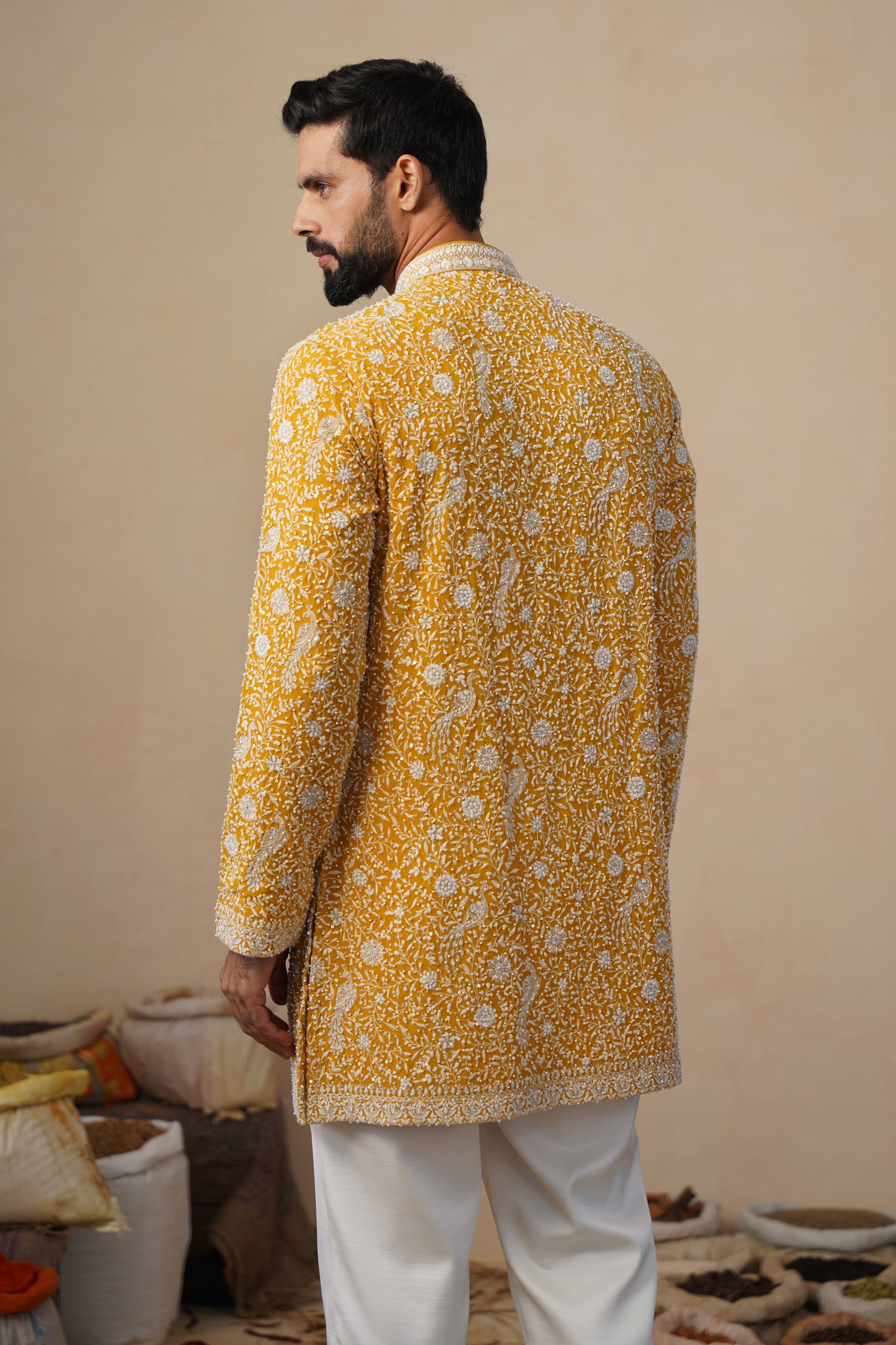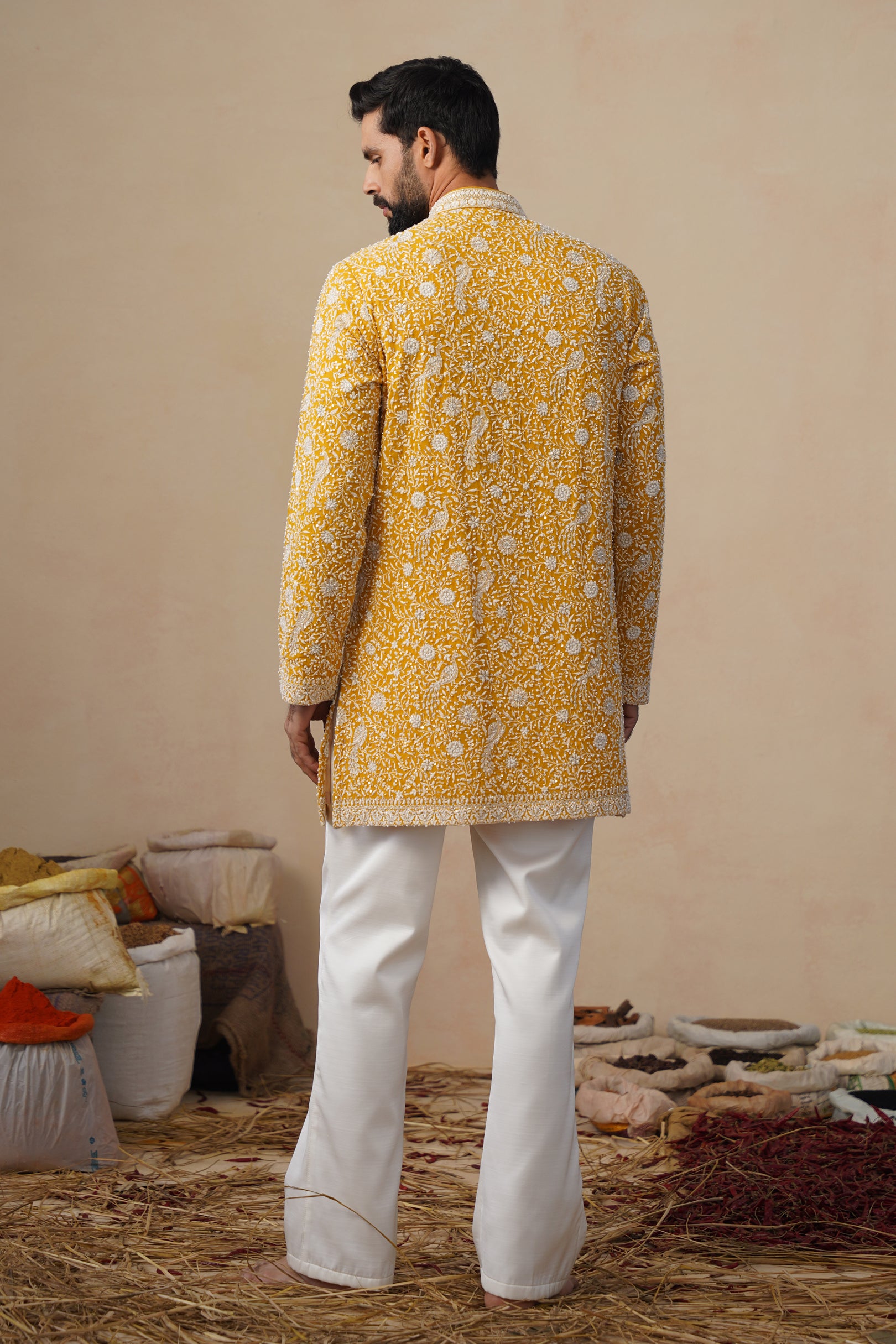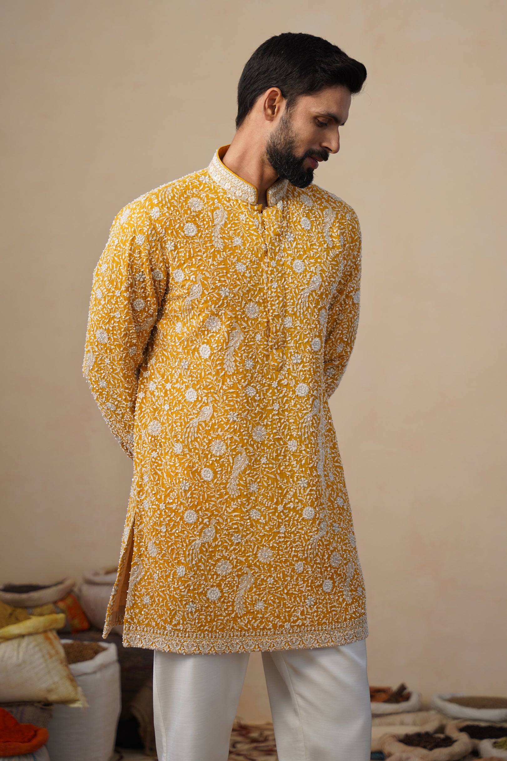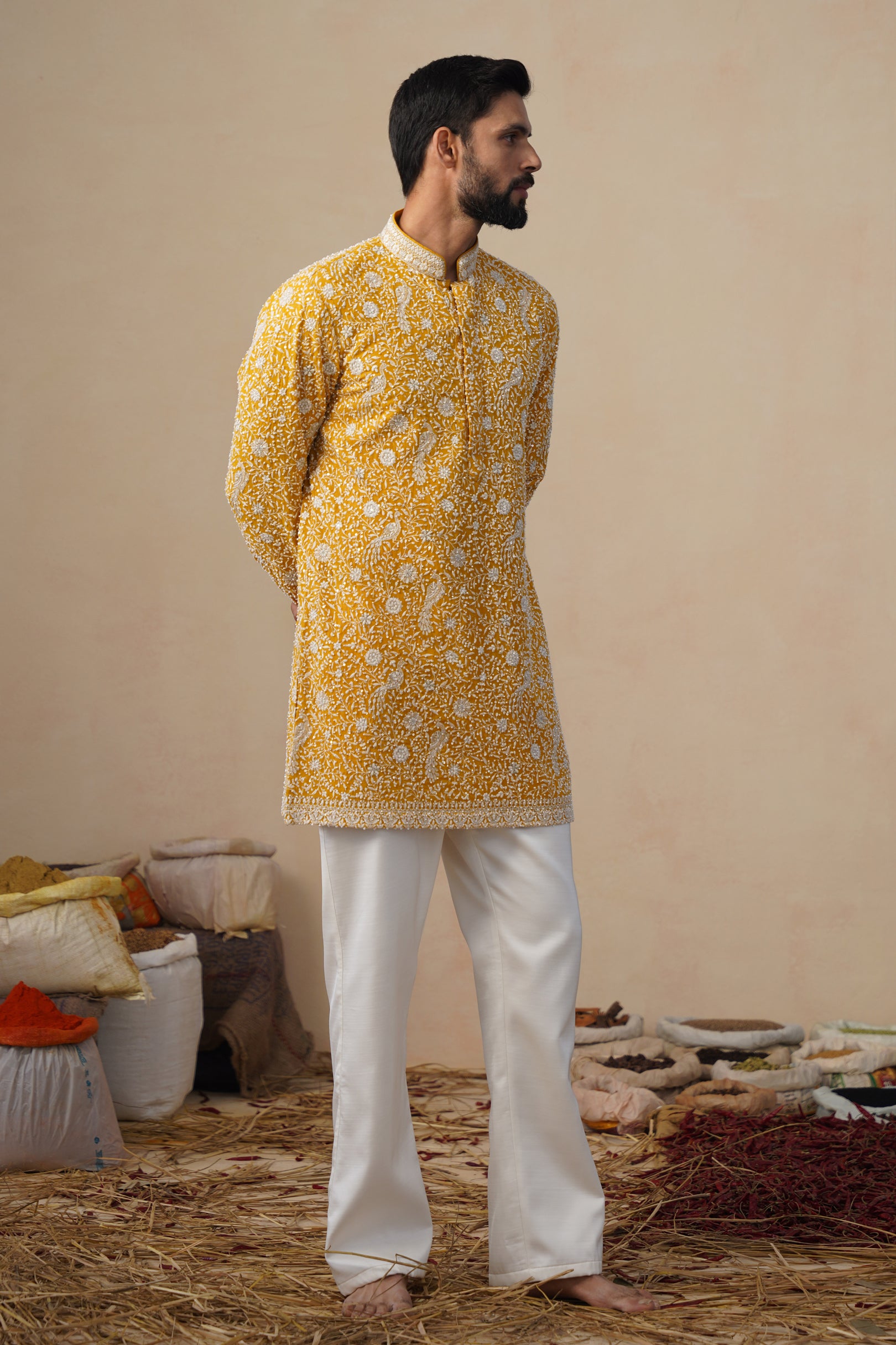 This short kurta is designed with a structured band collar and full-length sleeves, featuring dense all-over embroidery enriched with fine cutdana work that adds a subtle sheen and dimensional texture to the surface. The intricate embroidery is arranged in a balanced, detailed pattern, combining delicate threadwork with cutdana accents for a refined yet festive appeal. Designed to fall above the knee, the kurta offers a sharp, contemporary drape while retaining a traditional aesthetic. Meticulously crafted, it is ideal for festive occasions, evening celebrations, and elegant gatherings, and pairs effortlessly with classic straight pants.