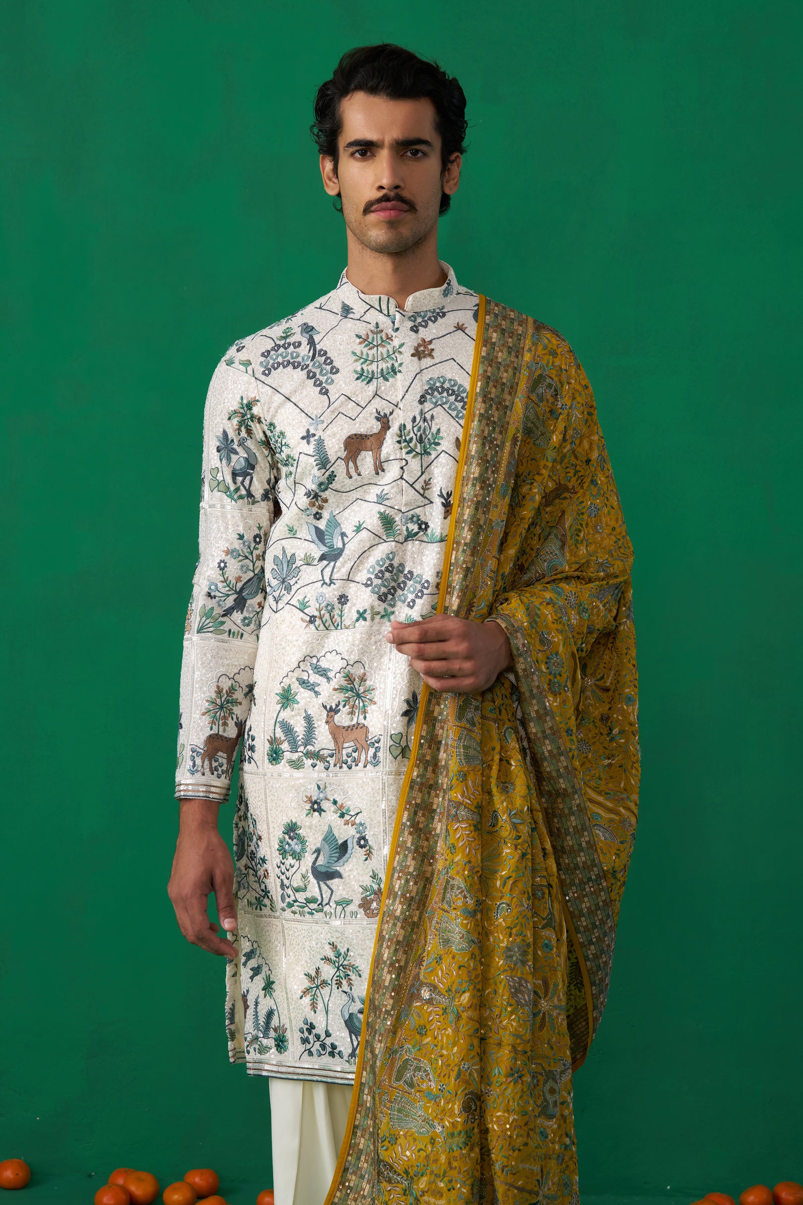 This kurta set features a long, straight-cut kurta with intricate all-over embroidery and floral and swan-inspired motifs, paired with patiyala-style bottoms that add volume and comfort to the silhouette. It is styled with a contrasting heavy dupatta, richly adorned with elaborate embroidered borders and detailed motifs, bringing a regal touch to the look. The ensemble combines traditional craftsmanship with a statement-making presence, perfect for festive and ceremonial occasions.