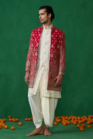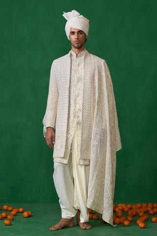 - Wedding Day Look – Pair the Hathimahal Ivory Sherwani Set with a dupatta, churidar, and embroidered mojris.