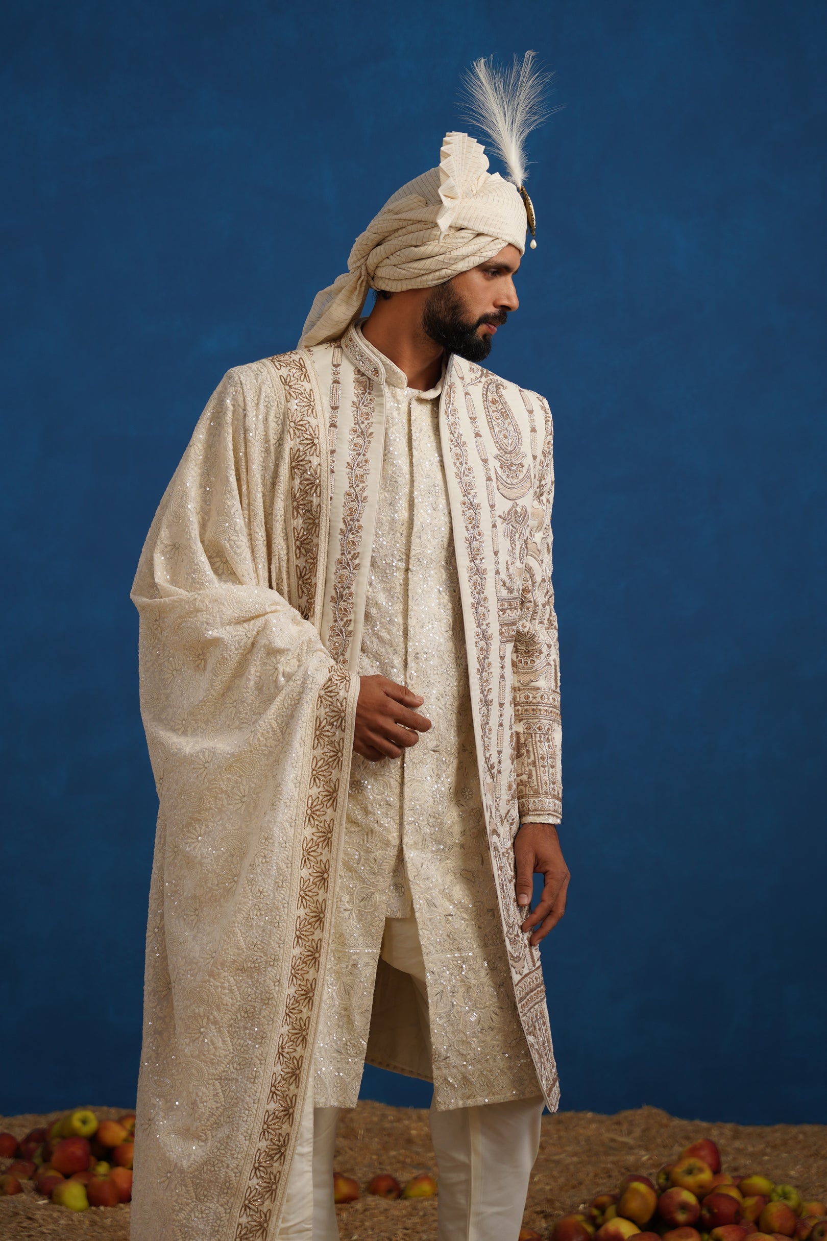 This sherwani set features a majestic, elongated silhouette, styled with a coordinated inner kurta, churidar bottom, elegantly draped dupatta, and a statement turban, creating a distinguished and groom-ready ensemble. The sherwani is ornamented with detailed zardozi embroidery, showcasing classic floral and ornamental motifs that bring depth, richness, and a royal character to the design. Its clean neckline and structured cut lend a refined and timeless appeal.