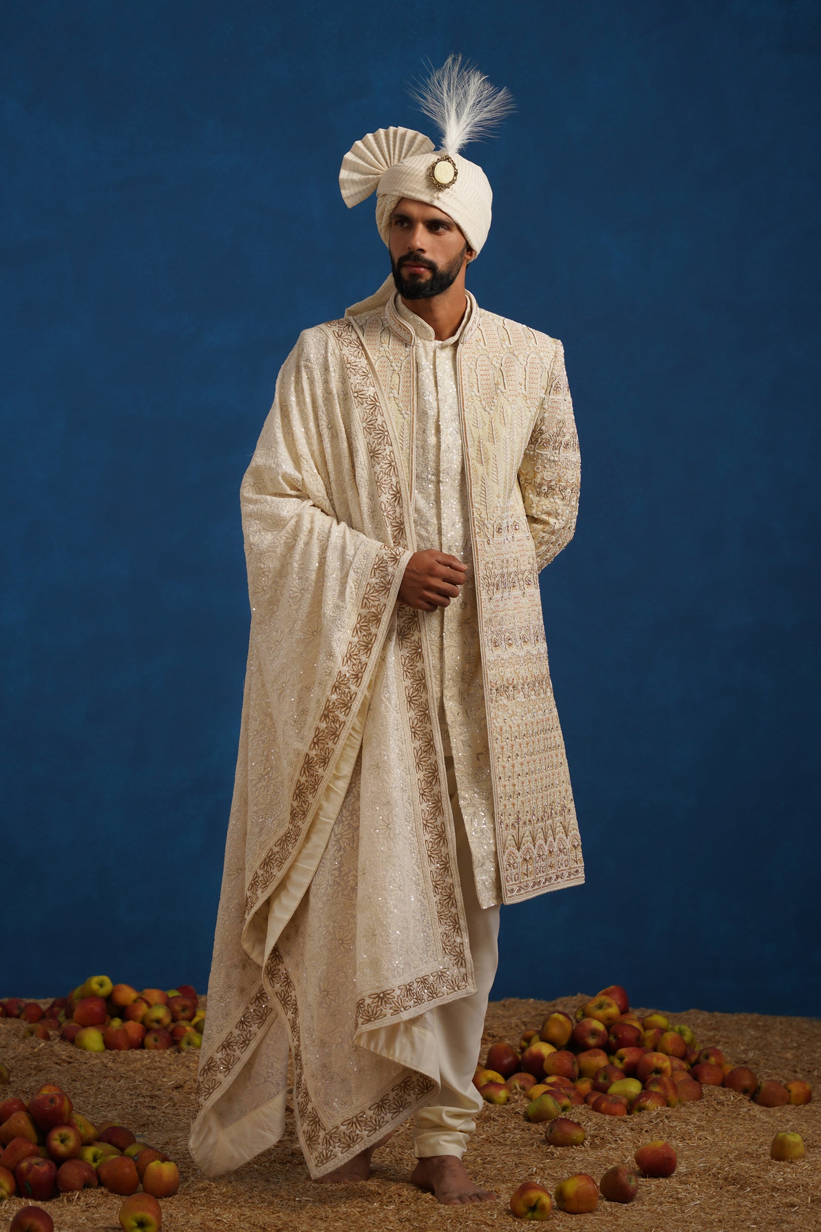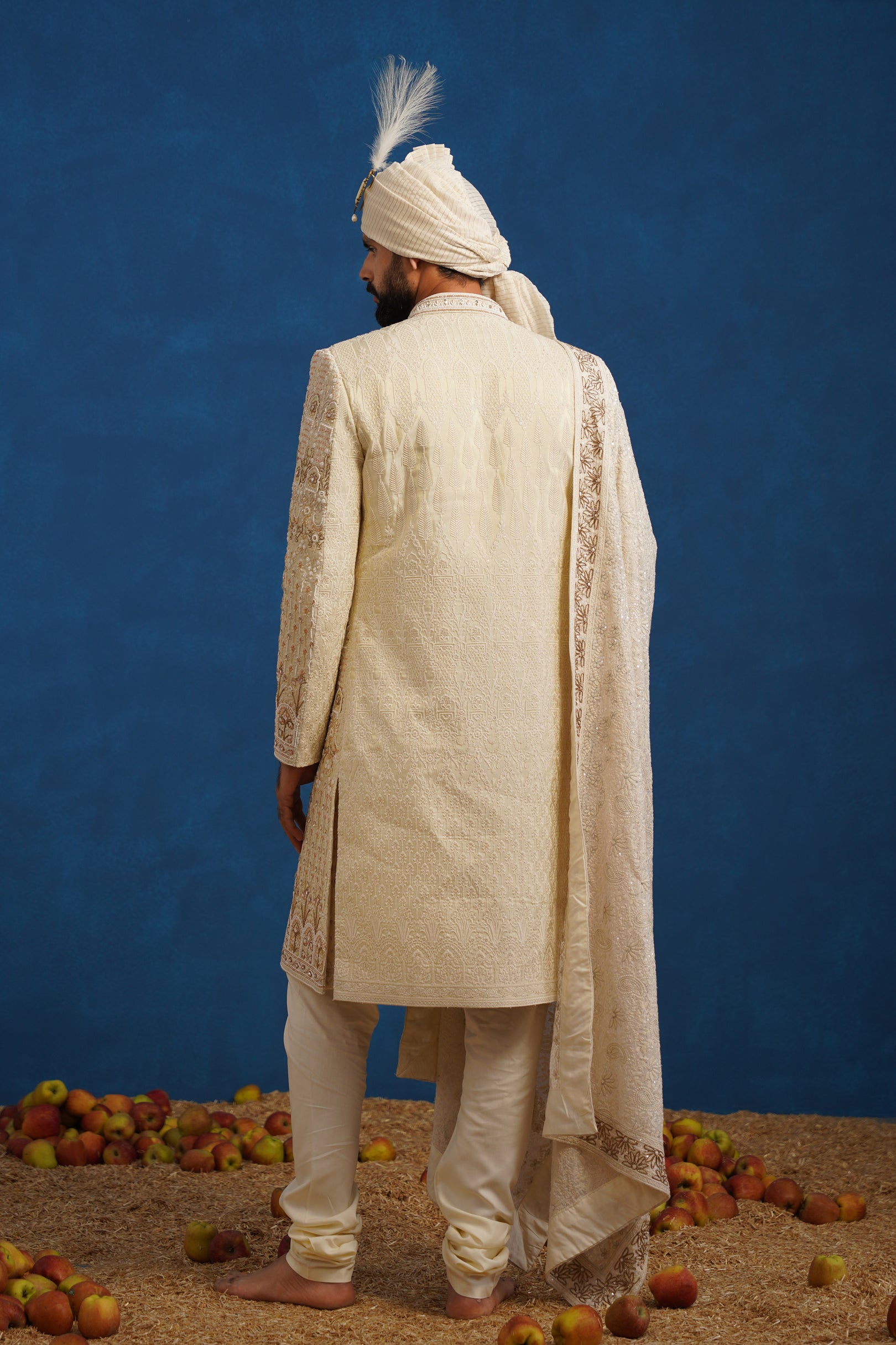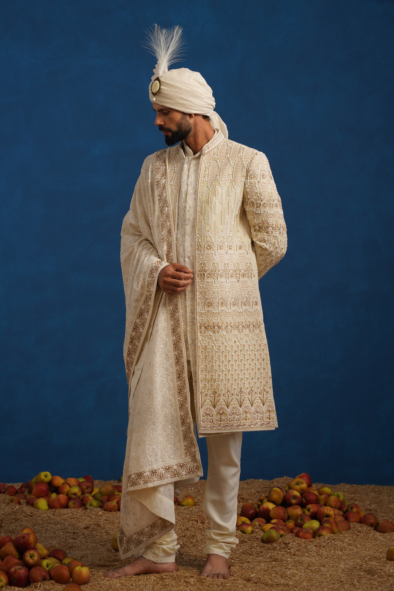 The inner kurta is designed with subtle detailing to balance the ornate sherwani, while the dupatta carries coordinated embroidery that elevates the overall grandeur of the ensemble. Finished with a classic churidar and a matching turban, this sherwani set is ideal for grooms, making it a perfect choice for weddings and traditional ceremonies where heritage craftsmanship and refined elegance take center stage.