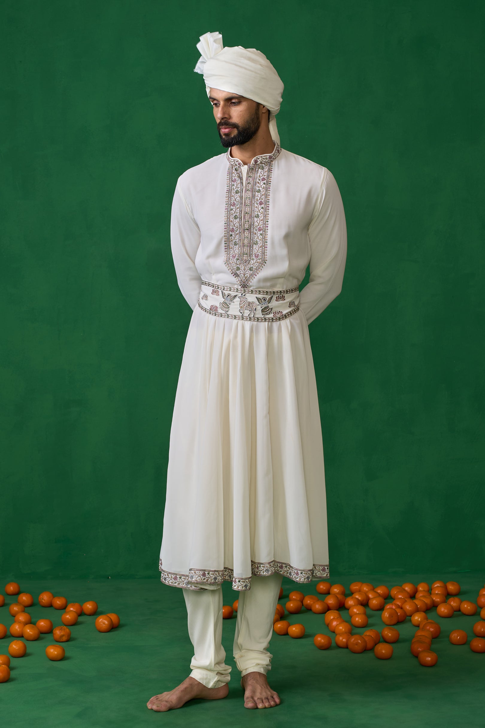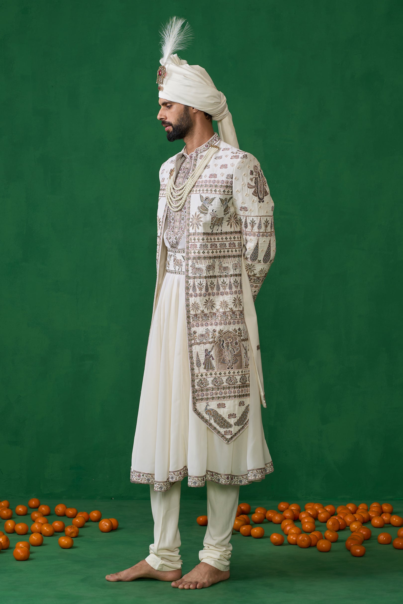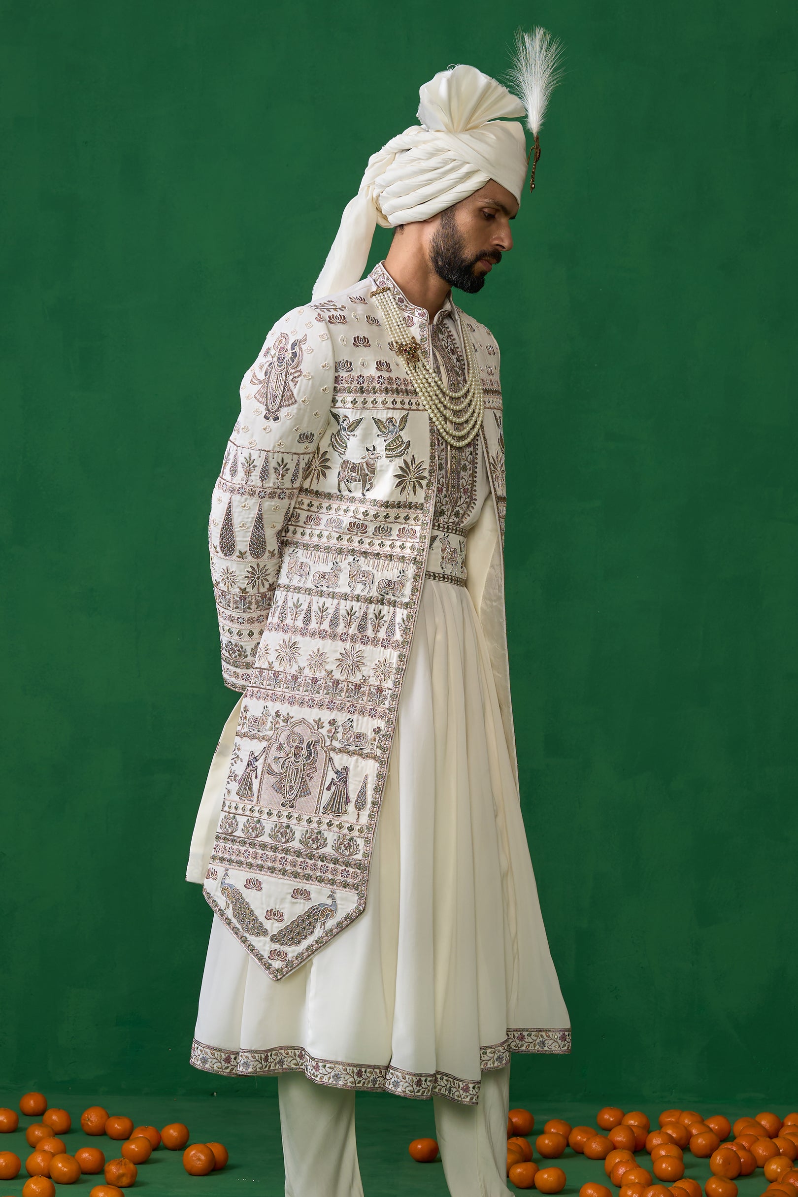 This regal groom’s sherwani is crafted with intricate Pichwai embroidery, featuring heritage-inspired motifs and ornate borders. The look is accentuated with a finely embroidered belt, layered over an anarkali kurta and paired with churidar bottoms for a royal silhouette. A matching turban completes the ensemble, making it a perfect choice for the modern groom who values timeless tradition.