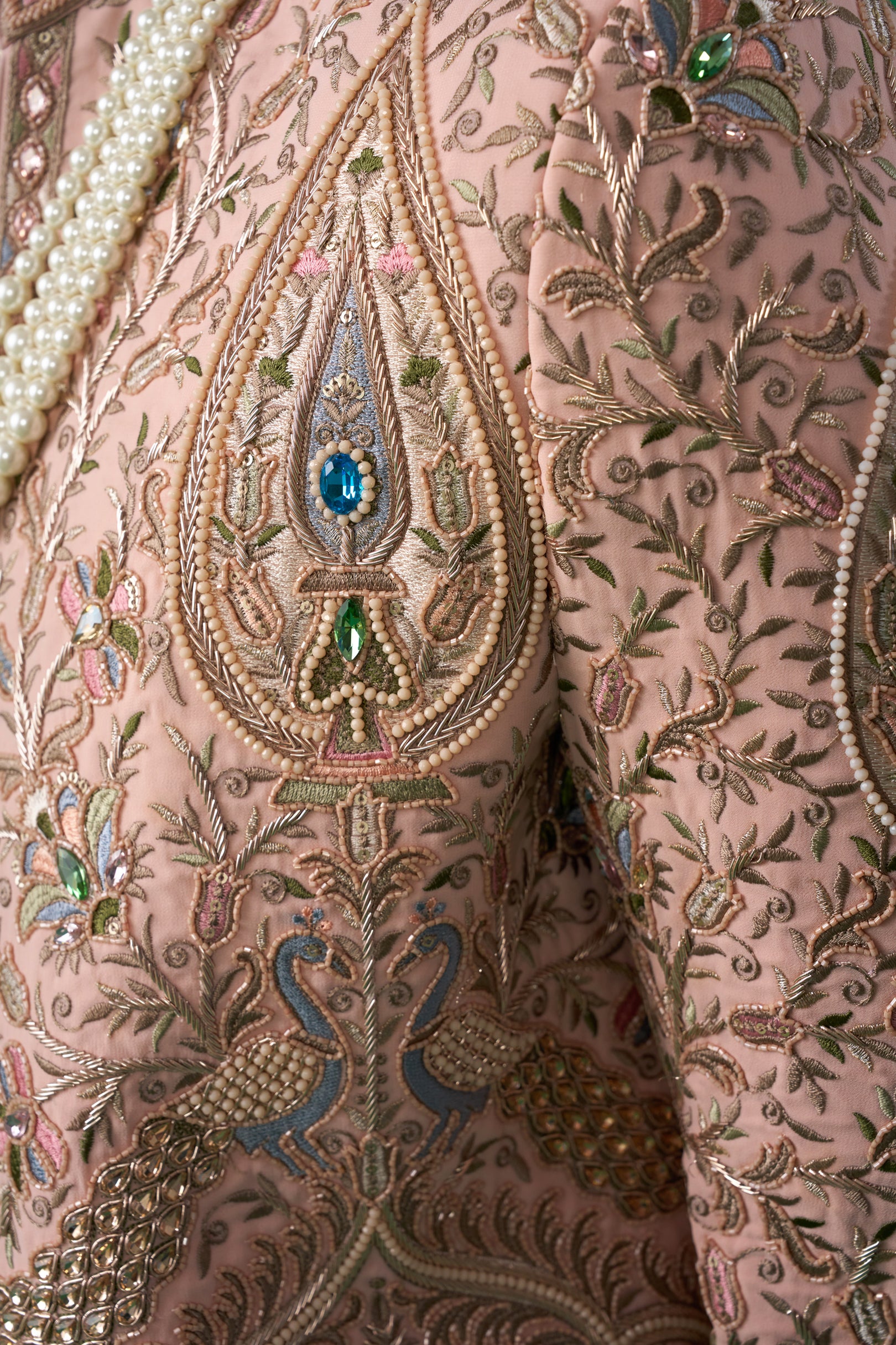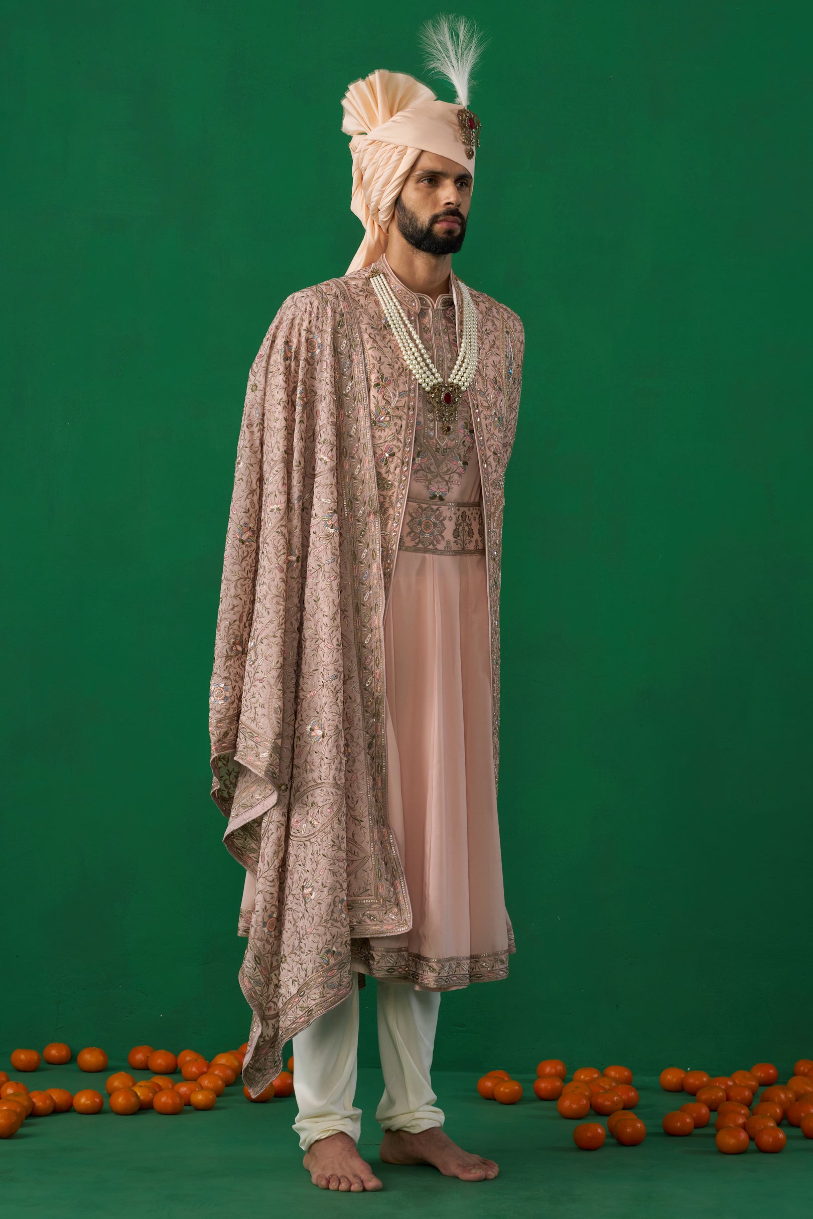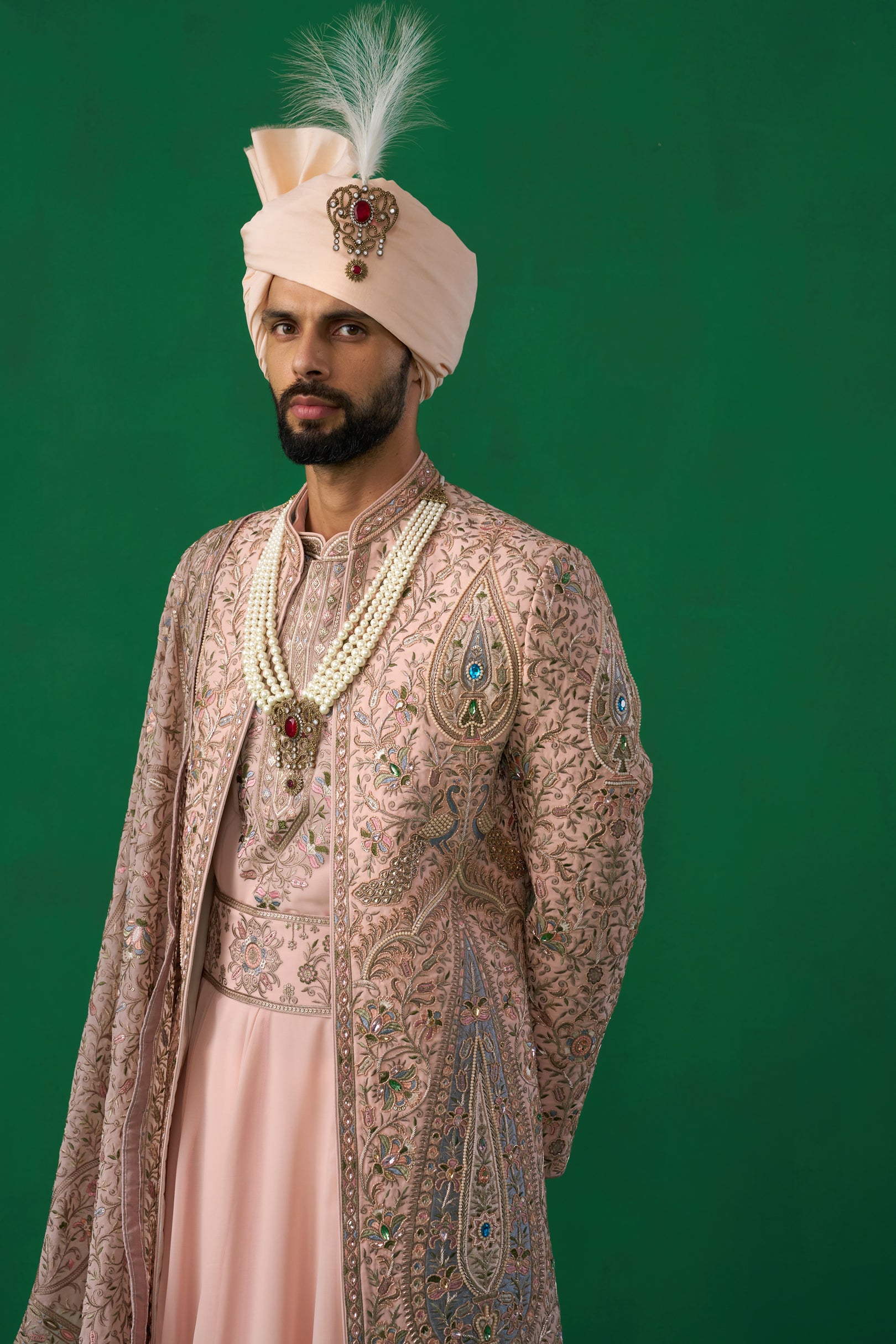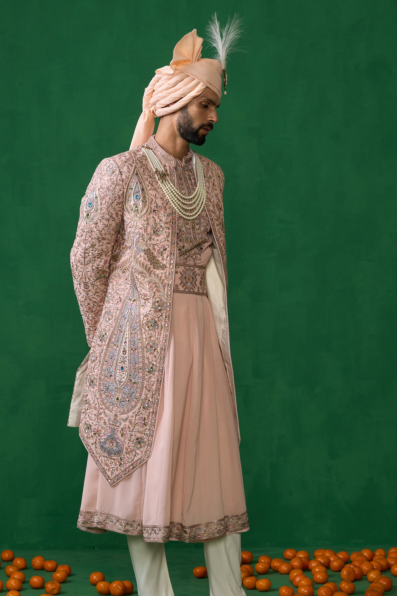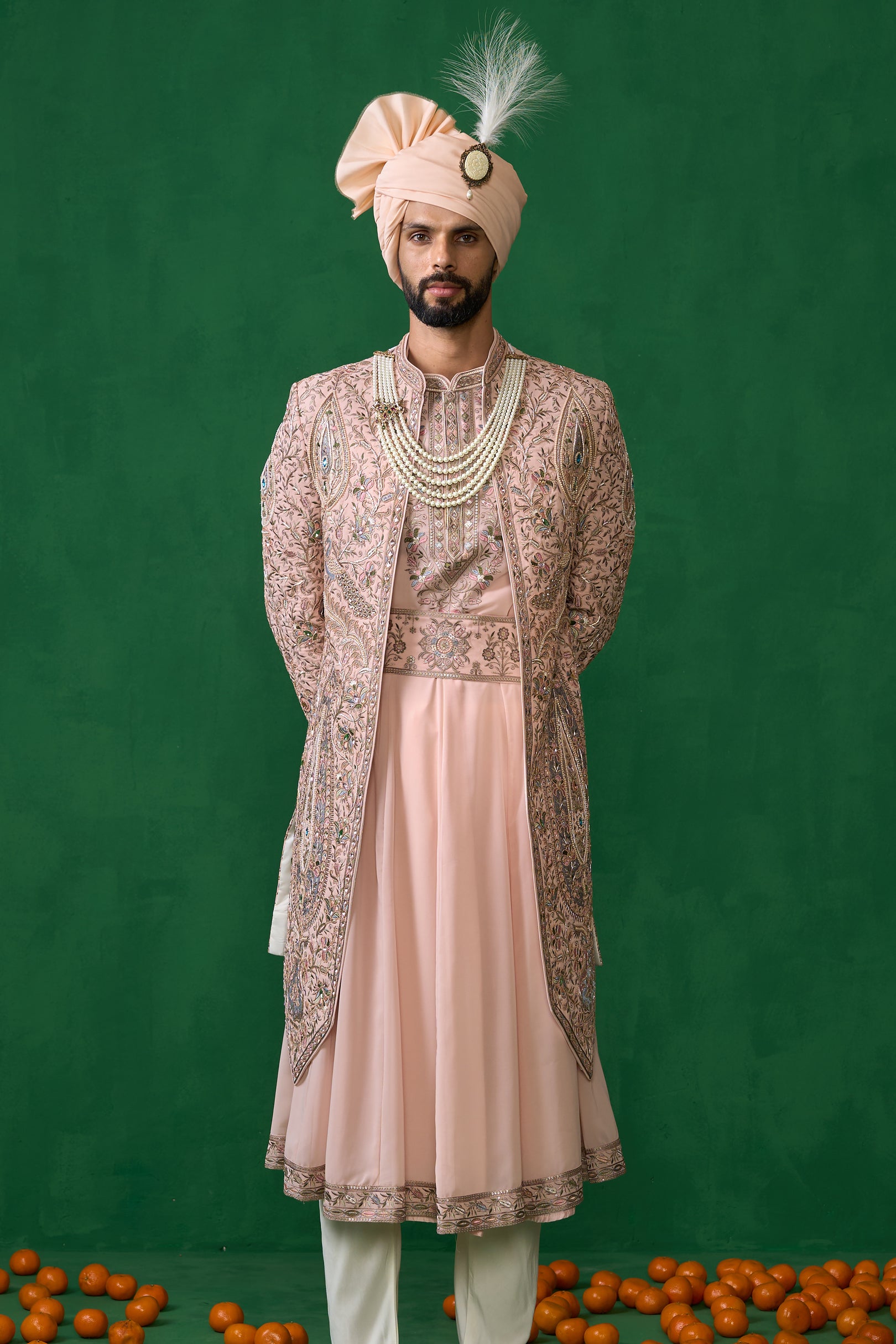 This groom’s sherwani is richly embroidered with intricate motifs that extend across the front, sleeves, and borders, exuding a regal charm. An embroidered belt defines the waist, layered gracefully over an anarkali kurta and paired with churidar bottoms to create a flowing yet structured silhouette. The look is completed with a matching turban, enhancing its royal and ceremonial appeal — a perfect choice for wedding wear.