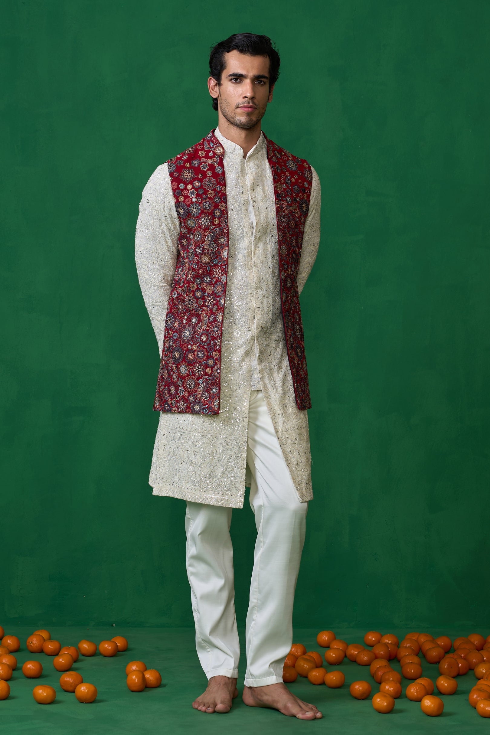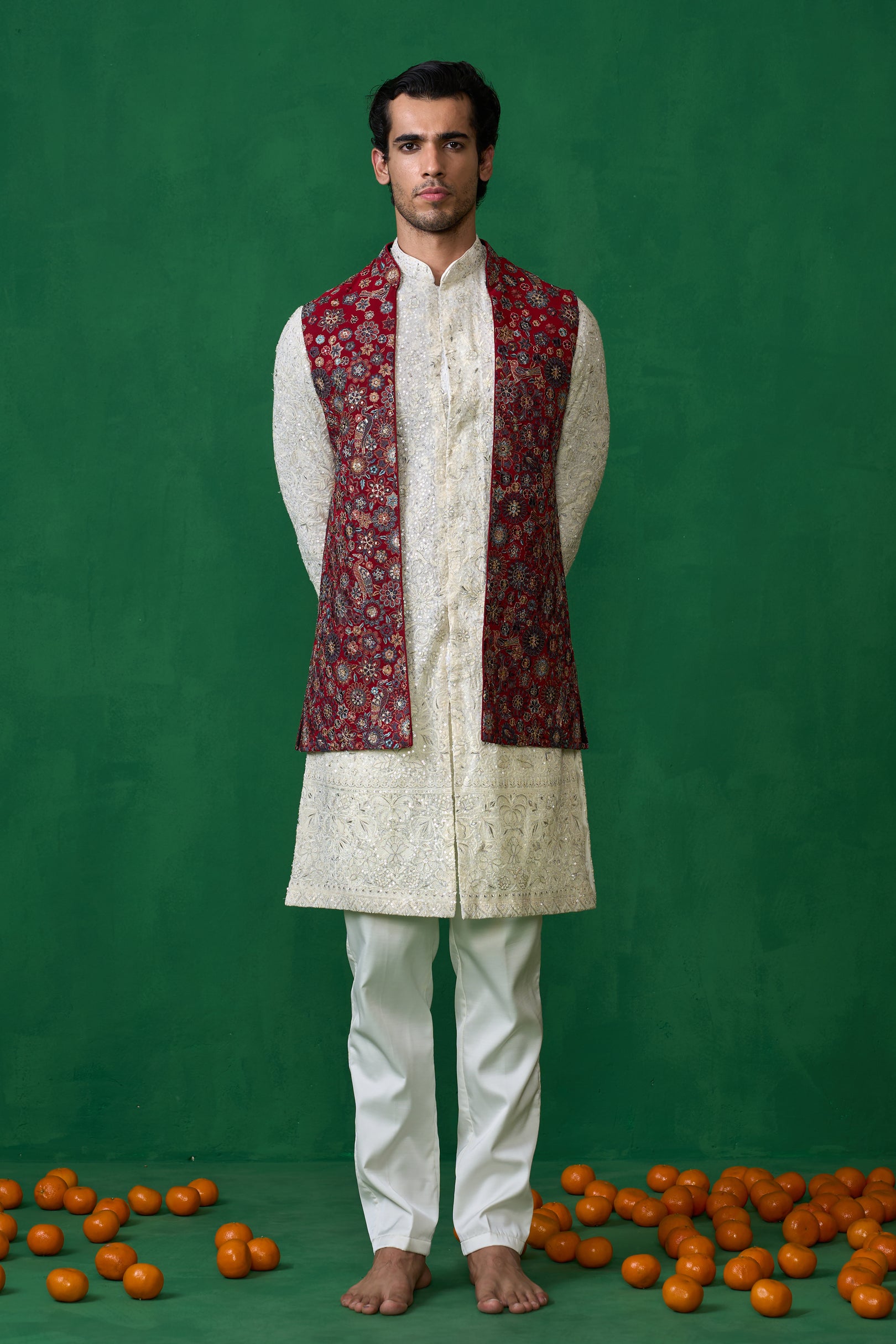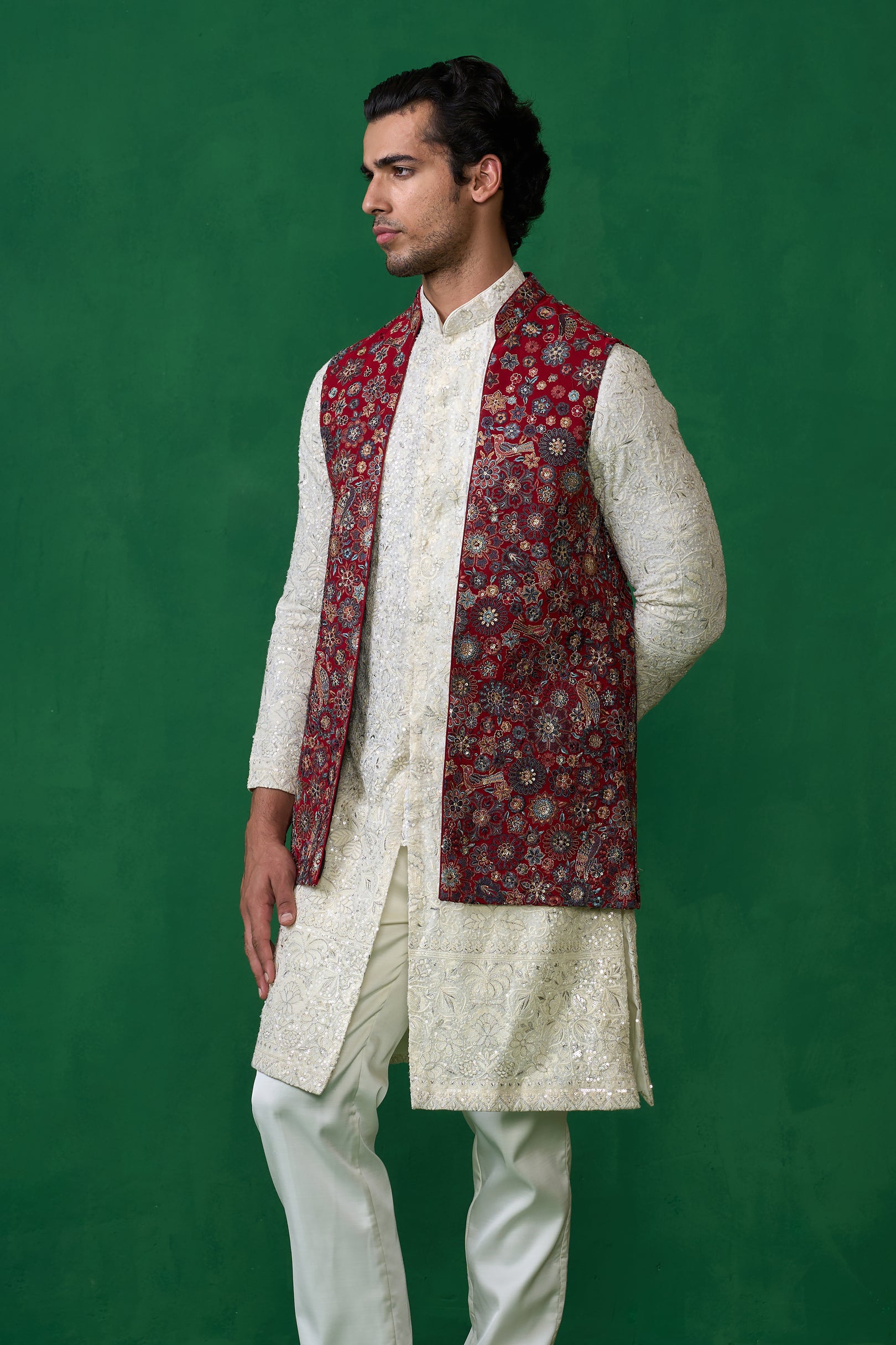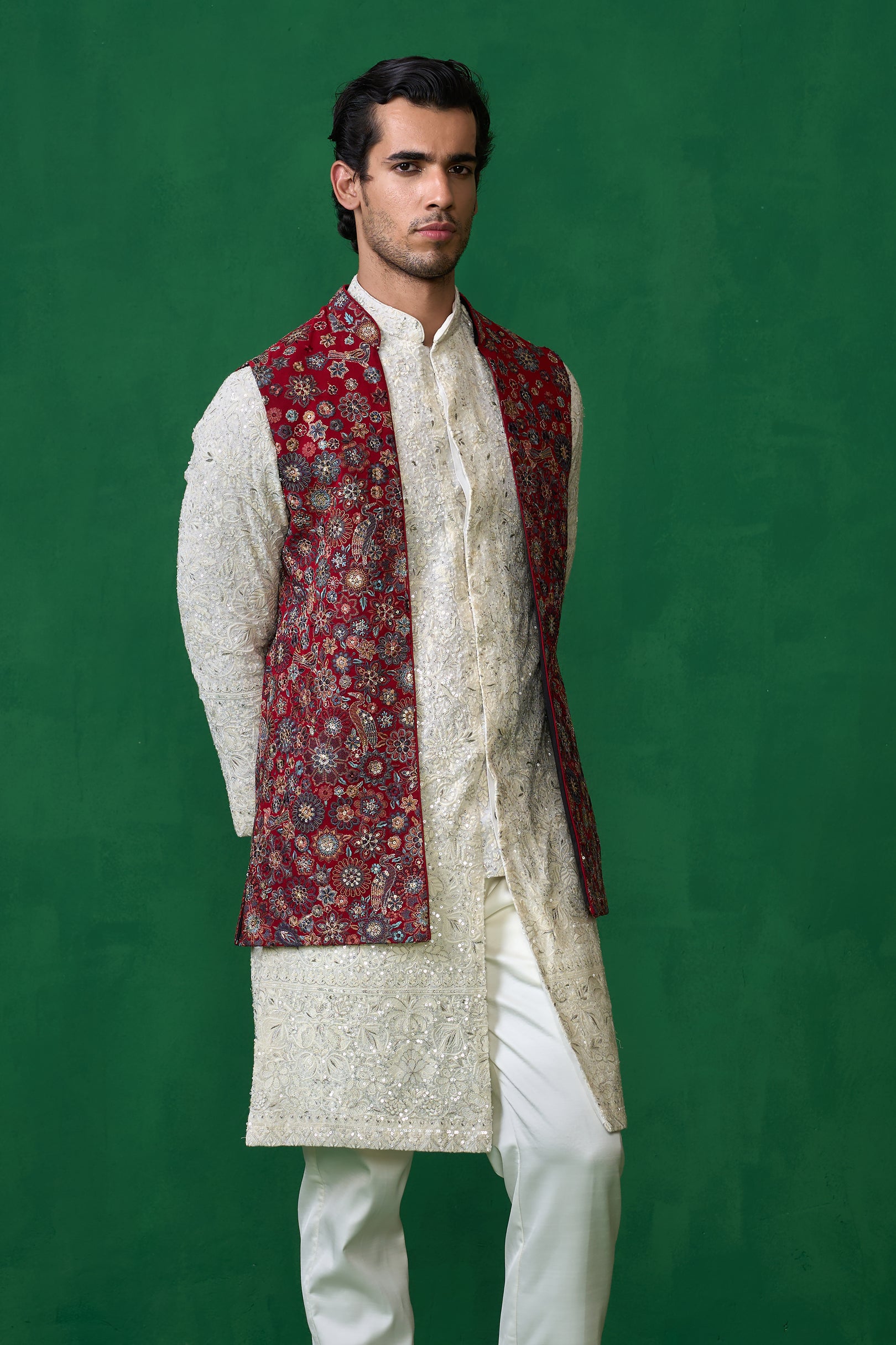 This striking ensemble is an excellent choice for festivals and day wedding. It features a long-sleeved kurta with a textured, repeating pattern. The kurta is paired with narrow-cut trousers. The most notable element is the sleeveless jacket worn over the kurta, which is adorned with elaborate rose and floral embroidery. The intricate and ornate detailing of the jacket creates a bold contrast against the textured base, offering a sophisticated and visually rich look.