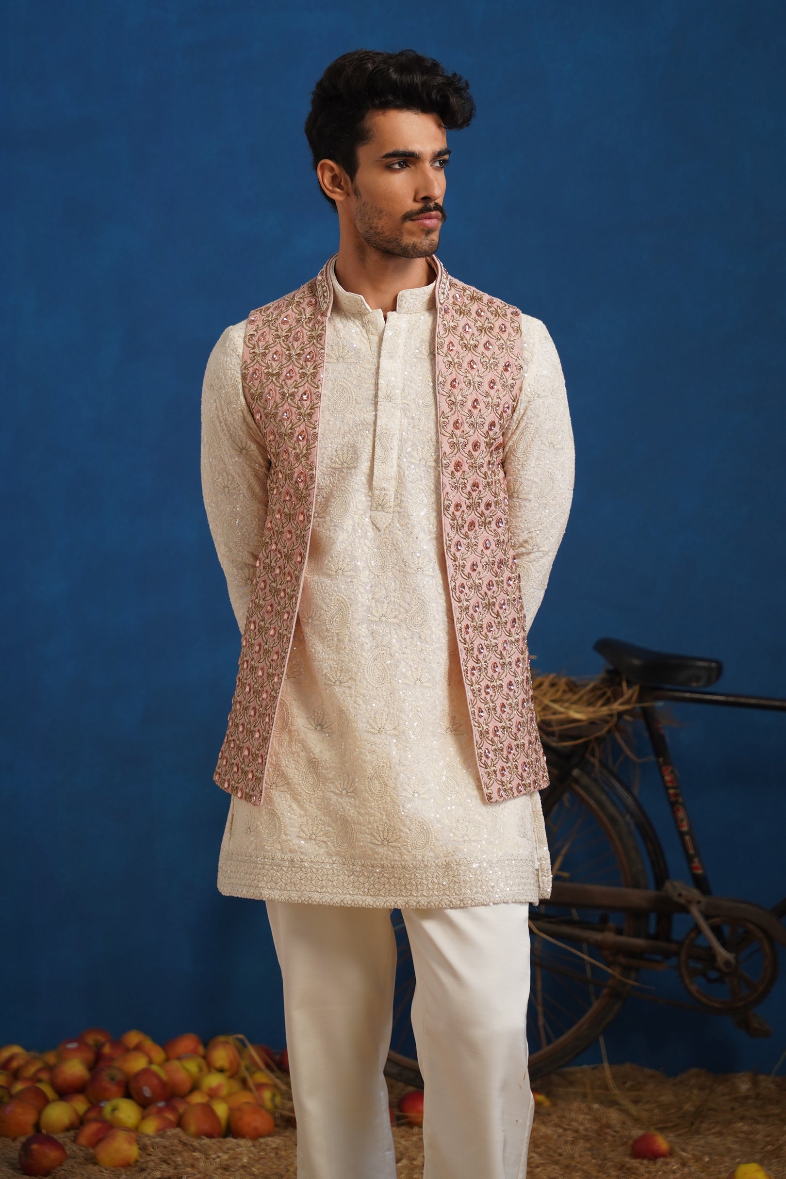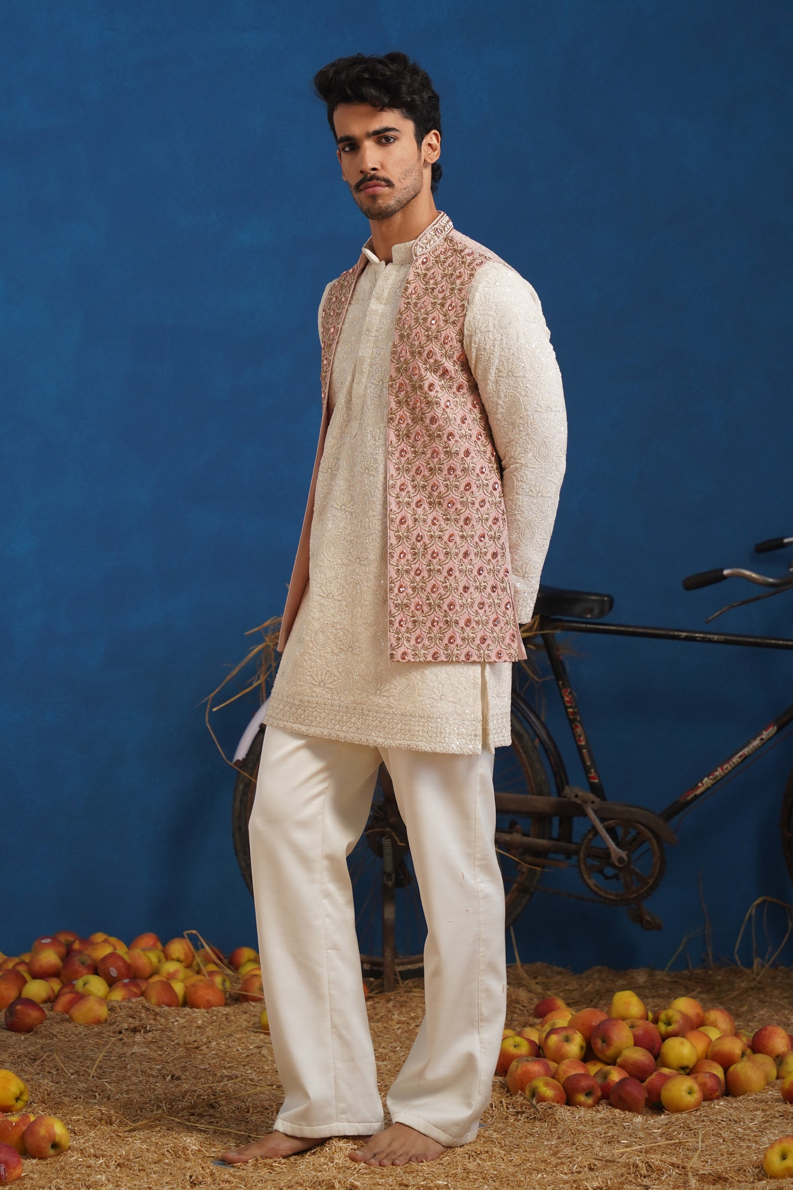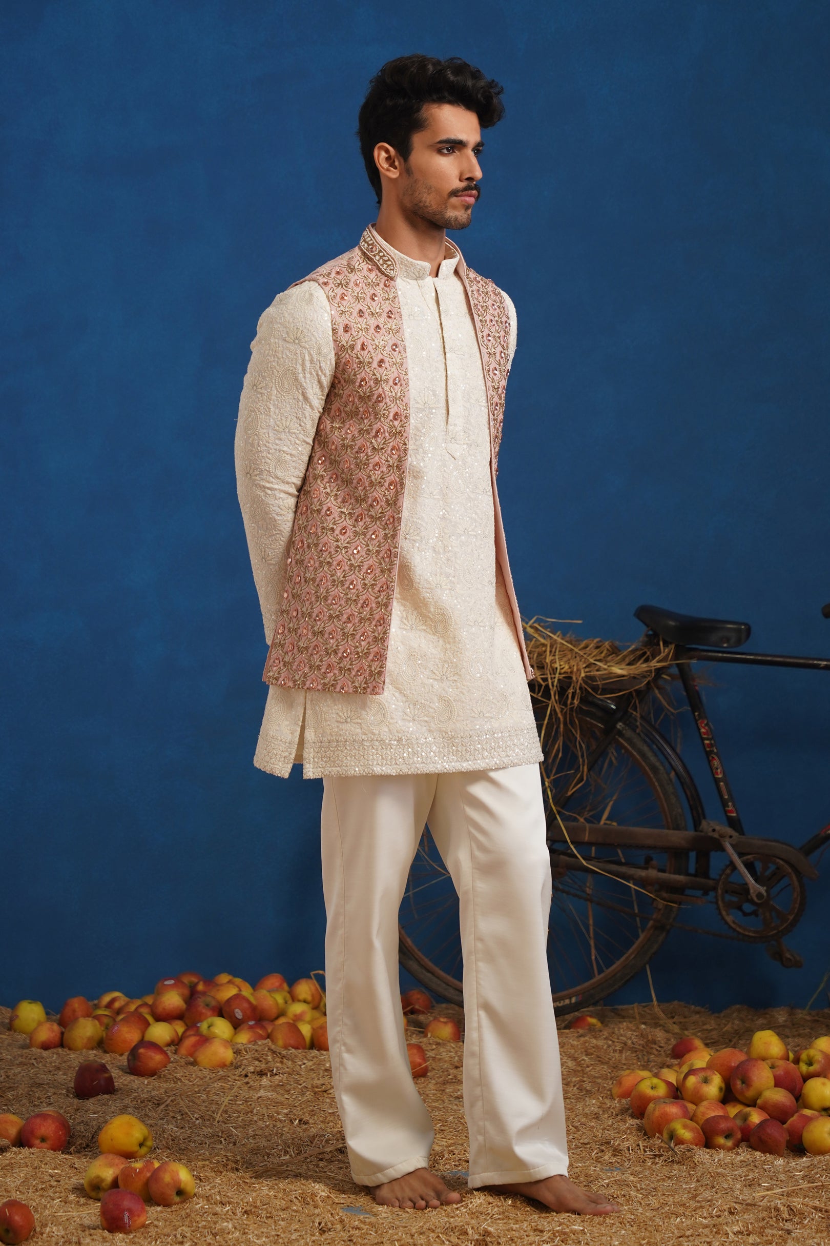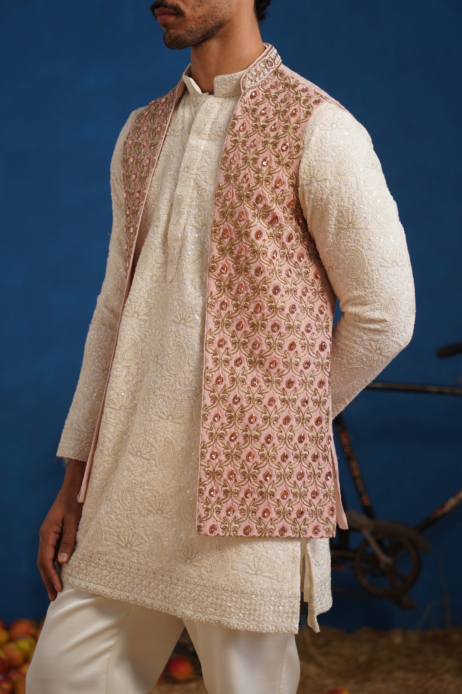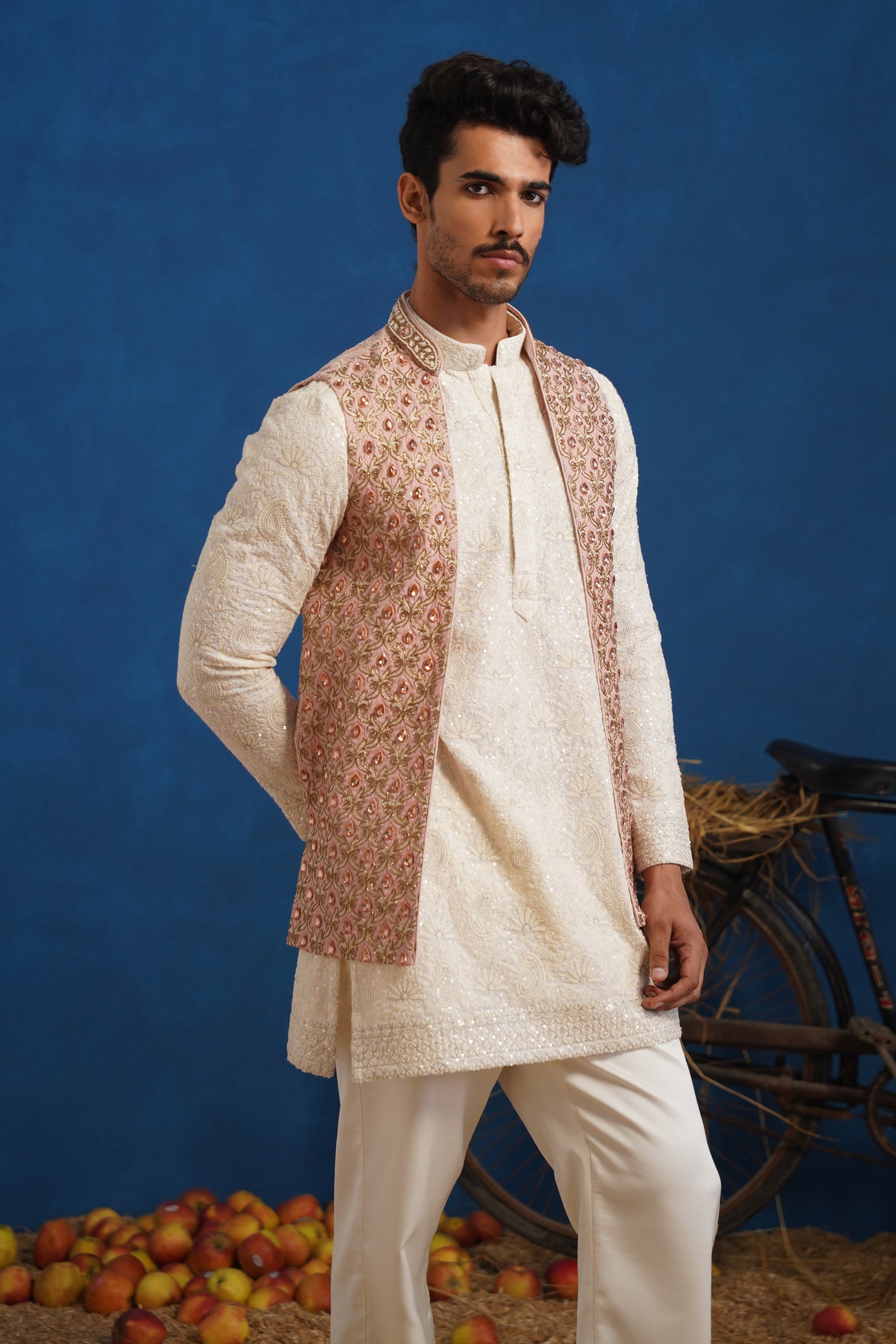This short kurta jacket set features a short kurta paired with straight pants and a sleeveless jacket. The kurta has a clean, refined silhouette with subtle all-over surface detailing. The jacket is highlighted with stone embellishments arranged in a symmetrical pattern, creating a structured and elegant look with a rich handcrafted appeal. The straight pants complete the ensemble with a polished and balanced finish, making this kurta jacket set ideal for festive and special occasions.