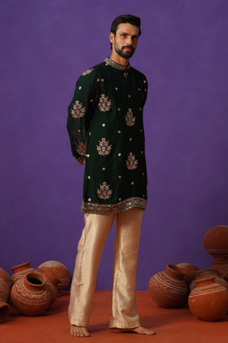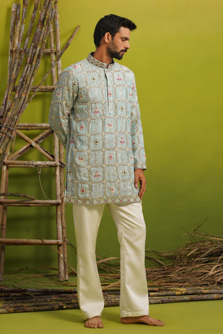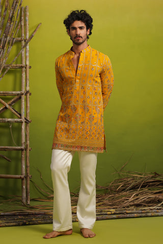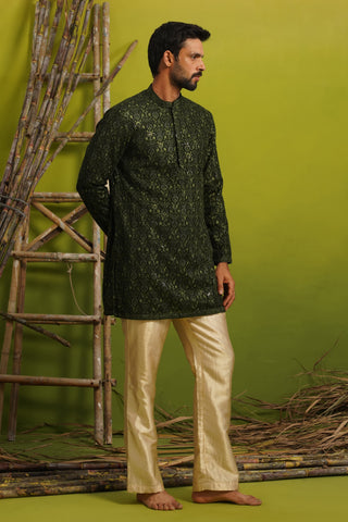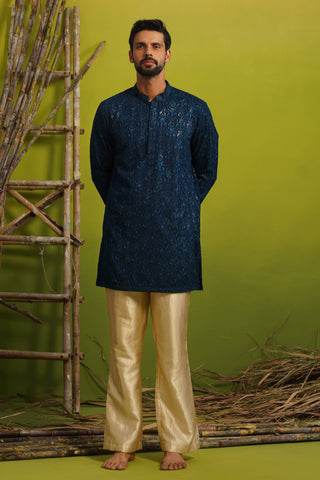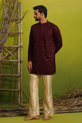 A short kurta set for men features a kurta with a shorter hemline compared to traditional long kurtas, paired with coordinated bottoms such as straight pants, pyjamas, or churidars. This contemporary silhouette offers ease of movement while preserving traditional Indian aesthetics, making it ideal for festive and semi-formal occasions.