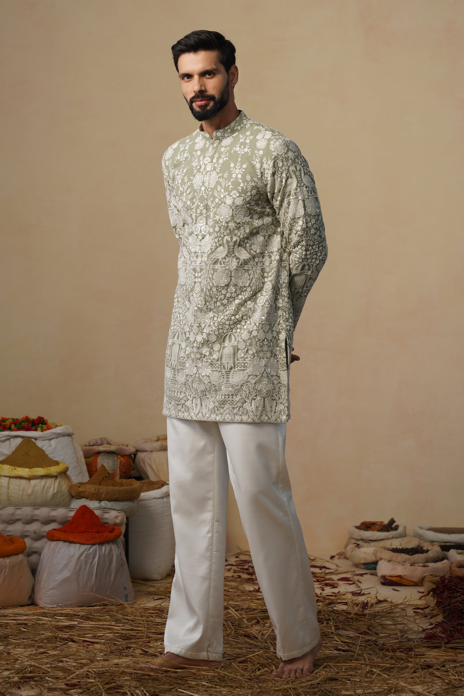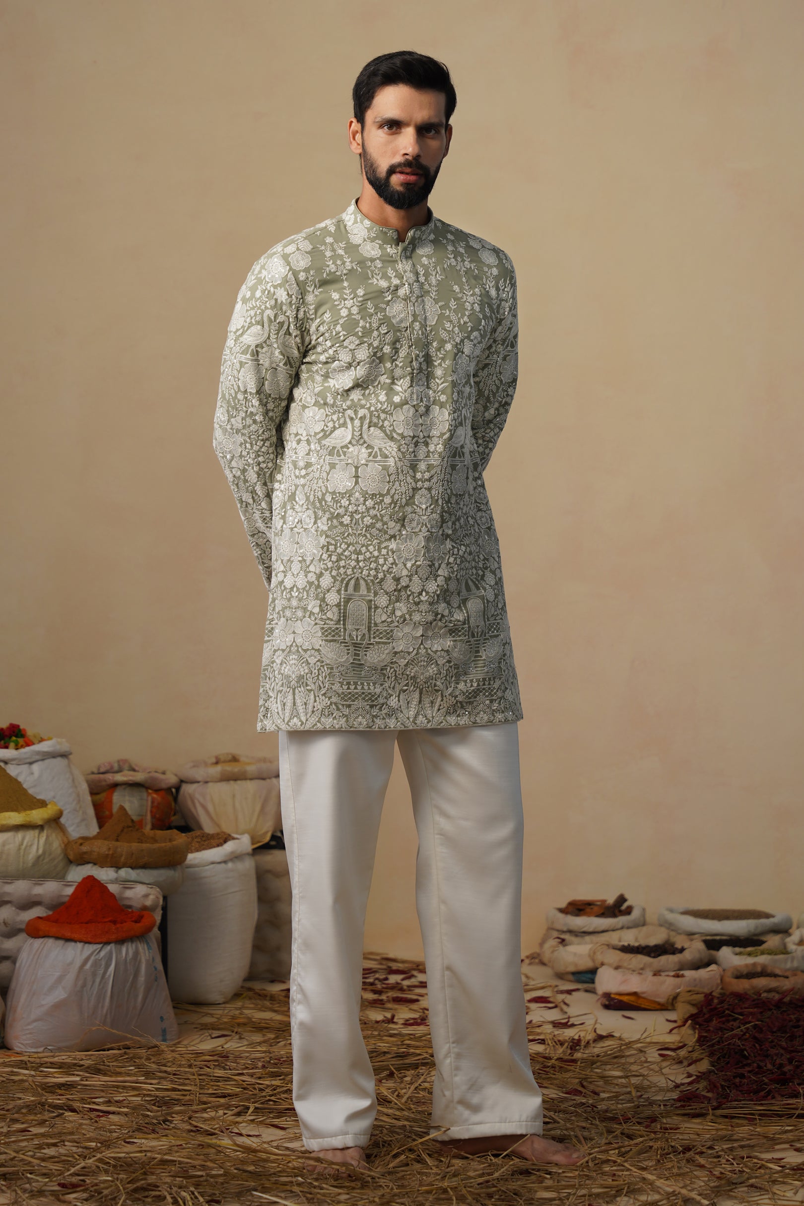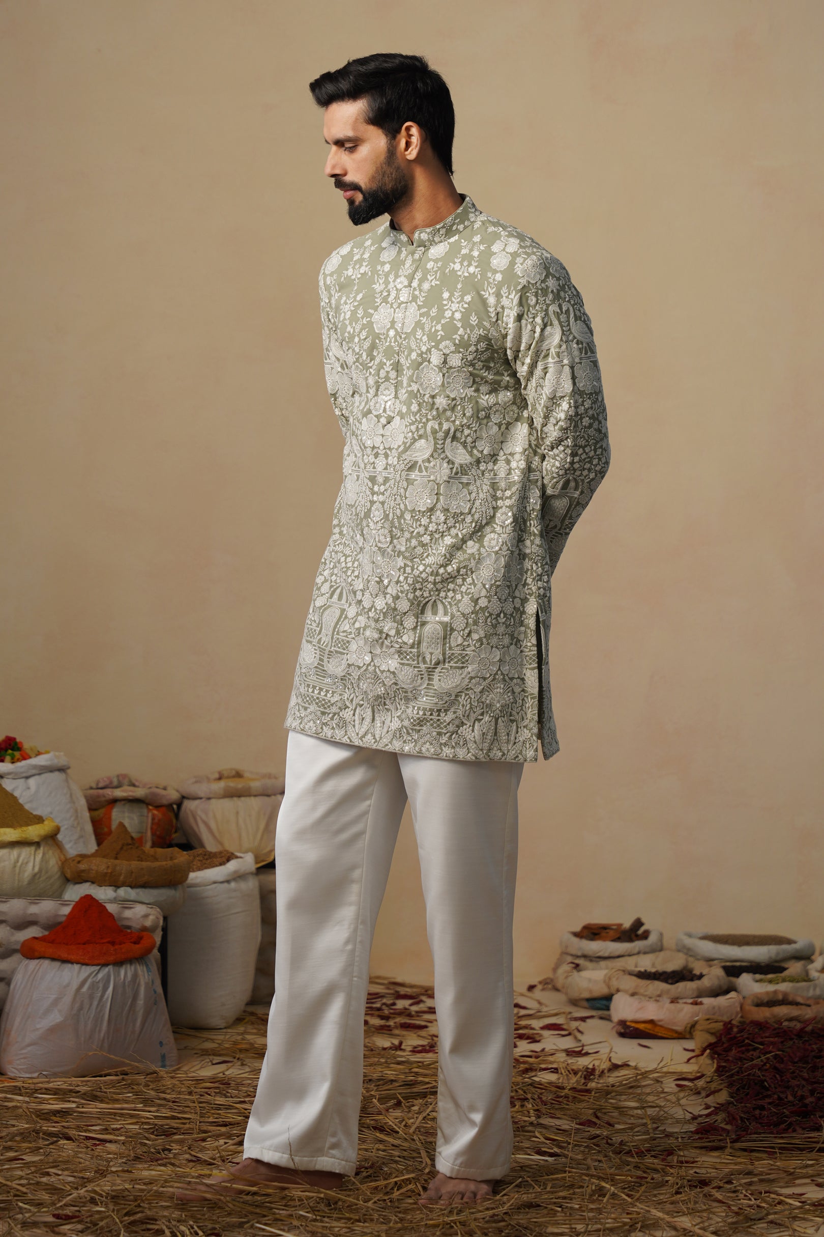 This short kurta features a structured band collar and full-length sleeves, adorned with intricate all-over mirror embroidery that brings subtle luminosity and depth to the surface. The embroidery is thoughtfully arranged in a dense yet balanced pattern, combining fine threadwork with mirror accents to create a refined, handcrafted texture without appearing heavy. Designed to fall above the knee, the kurta offers a sharp, contemporary drape while preserving a rich traditional essence. Carefully crafted with attention to detail, it is ideal for festive occasions, celebratory gatherings, and elegant daytime or evening wear, pairing effortlessly with classic straight pants.