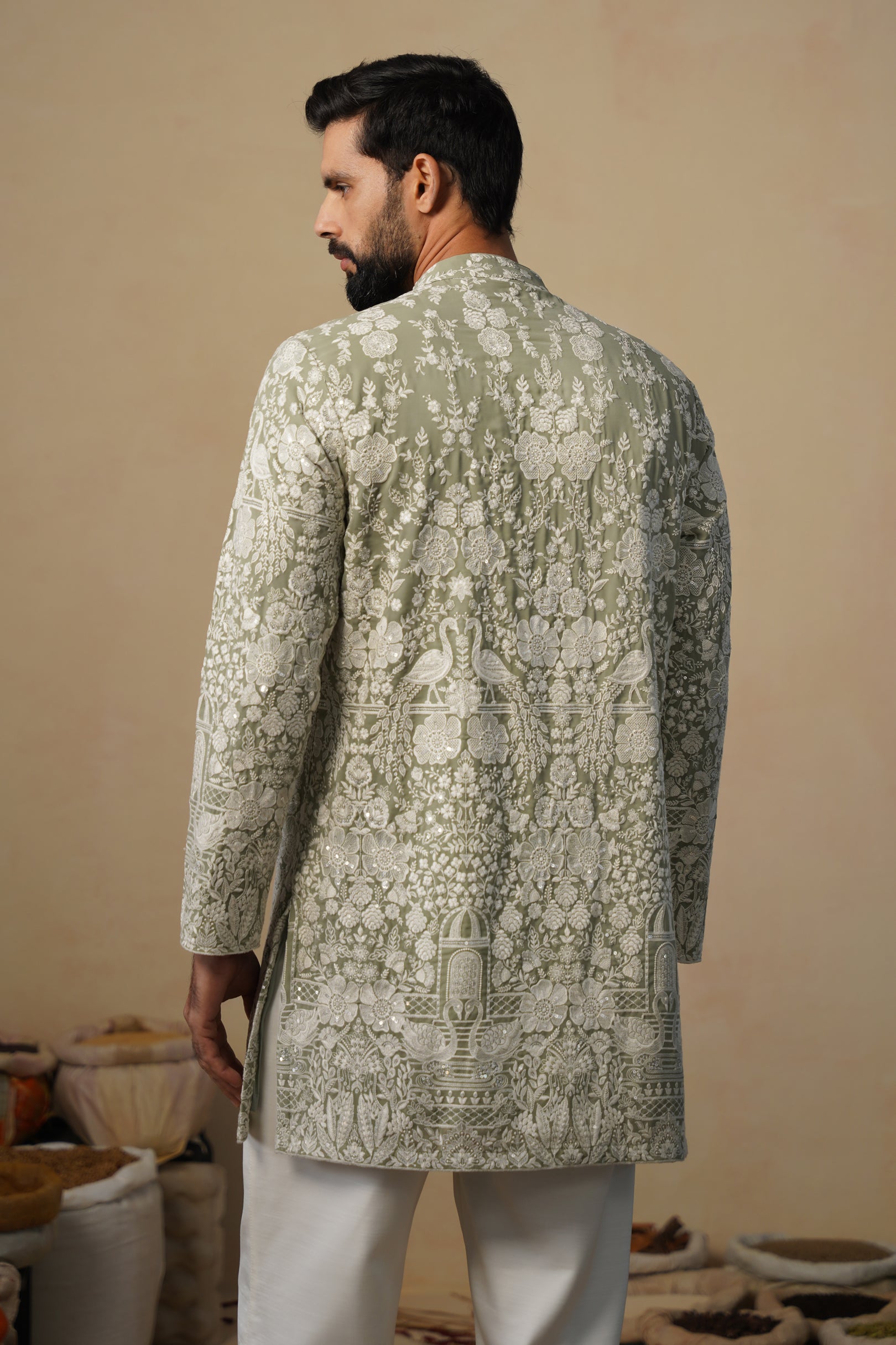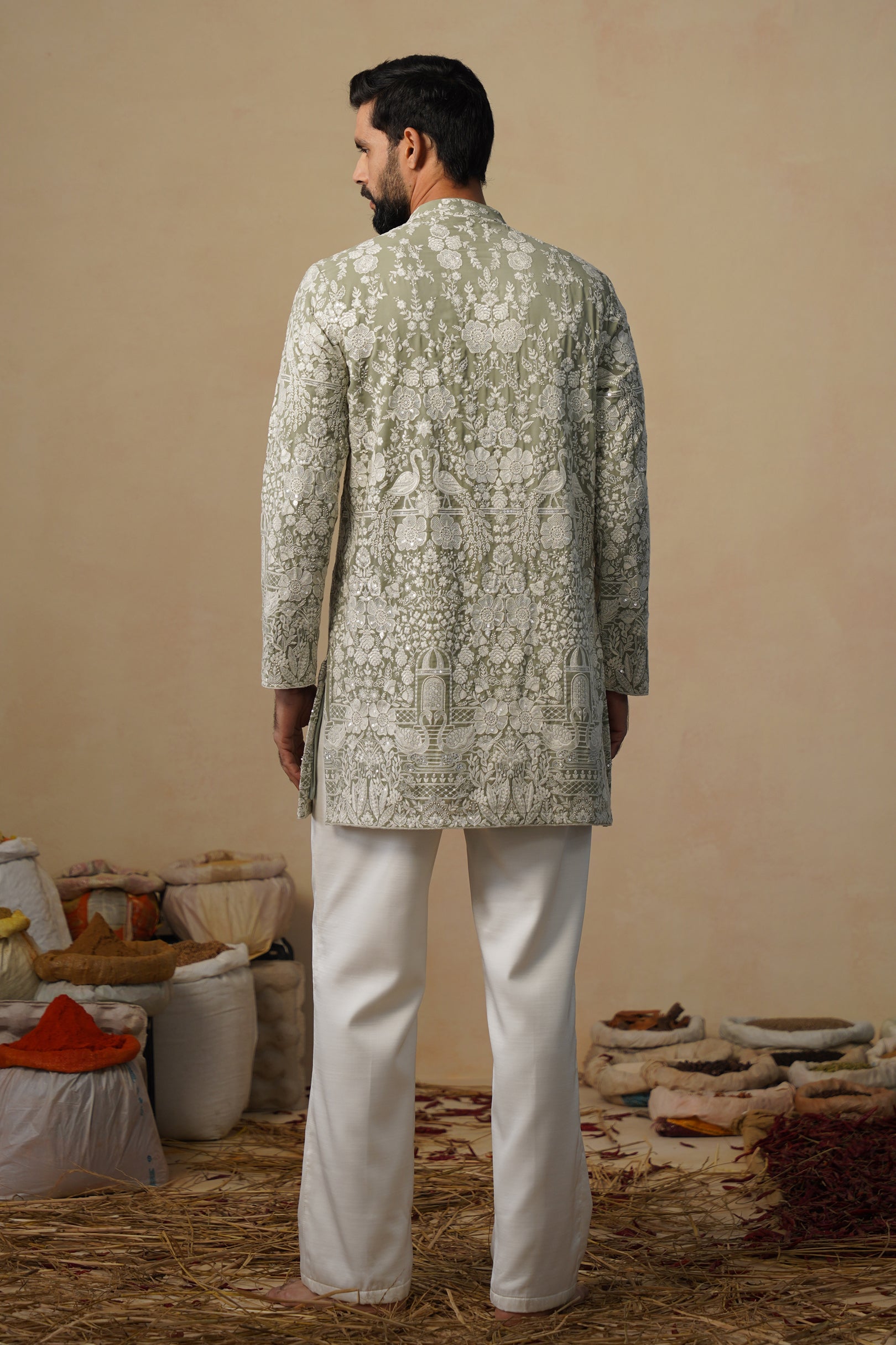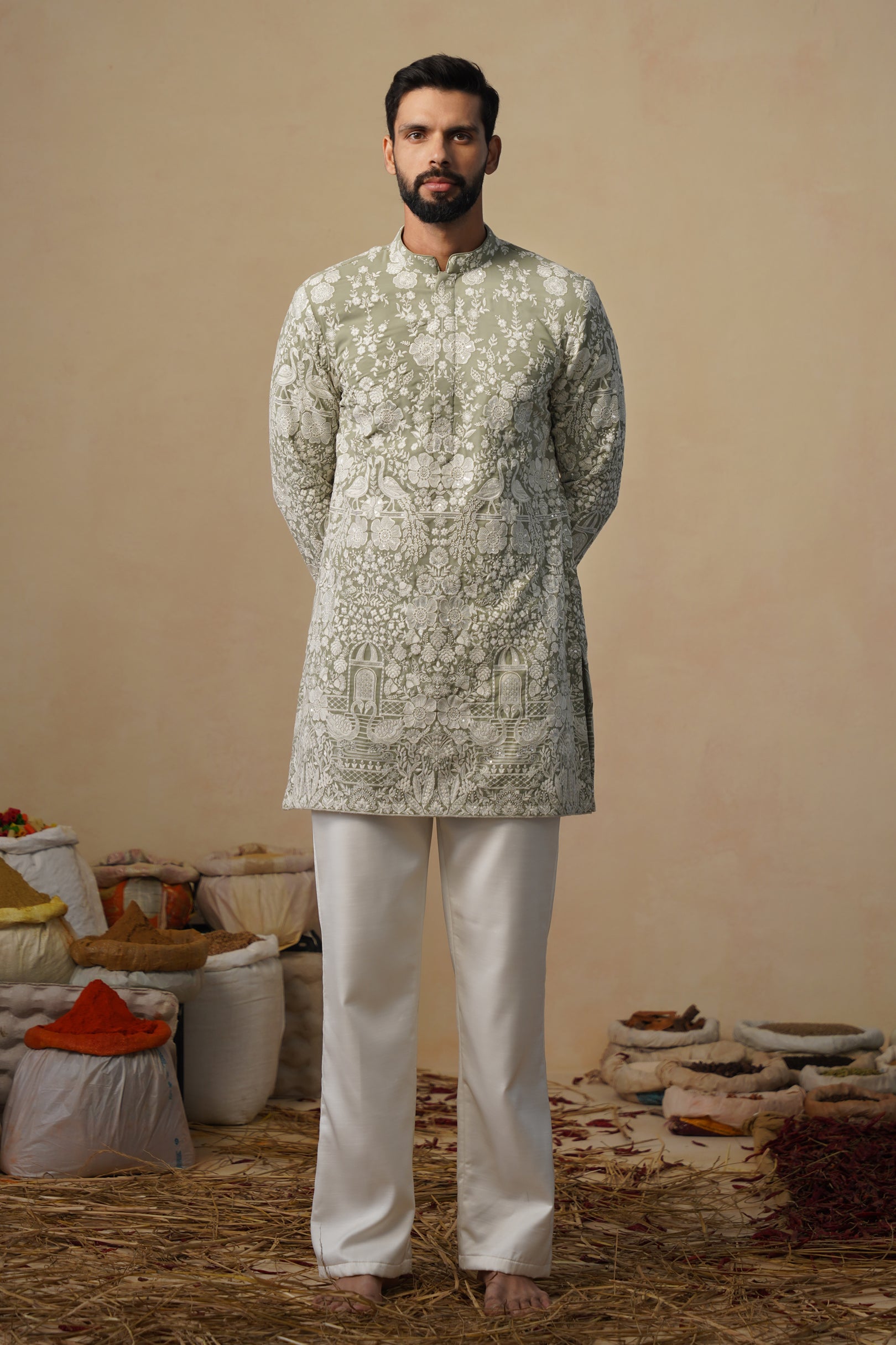 This short kurta features a structured band collar and full-length sleeves, adorned with intricate all-over mirror embroidery that brings subtle luminosity and depth to the surface. The embroidery is thoughtfully arranged in a dense yet balanced pattern, combining fine threadwork with mirror accents to create a refined, handcrafted texture without appearing heavy. Designed to fall above the knee, the kurta offers a sharp, contemporary drape while preserving a rich traditional essence. Carefully crafted with attention to detail, it is ideal for festive occasions, celebratory gatherings, and elegant daytime or evening wear, pairing effortlessly with classic straight pants.