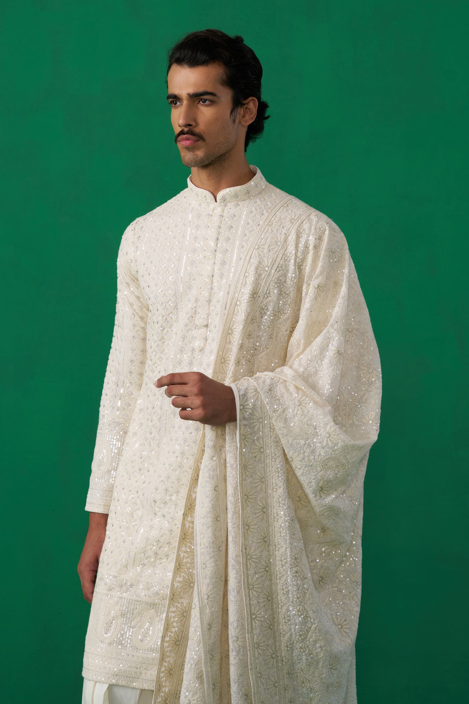 This classic ensemble offers a refined and stylish choice for festive and wedding wear. The kurta is a study in subtle elegance, featuring a continuous, all-over embroidered texture that provides depth and detail. It is perfectly complemented by the fluid drape of the Patiyala trousers, which adds a relaxed yet sophisticated silhouette. A matching dupatta with the same intricate texture drapes gracefully, elevating the entire look with an air of understated luxury.